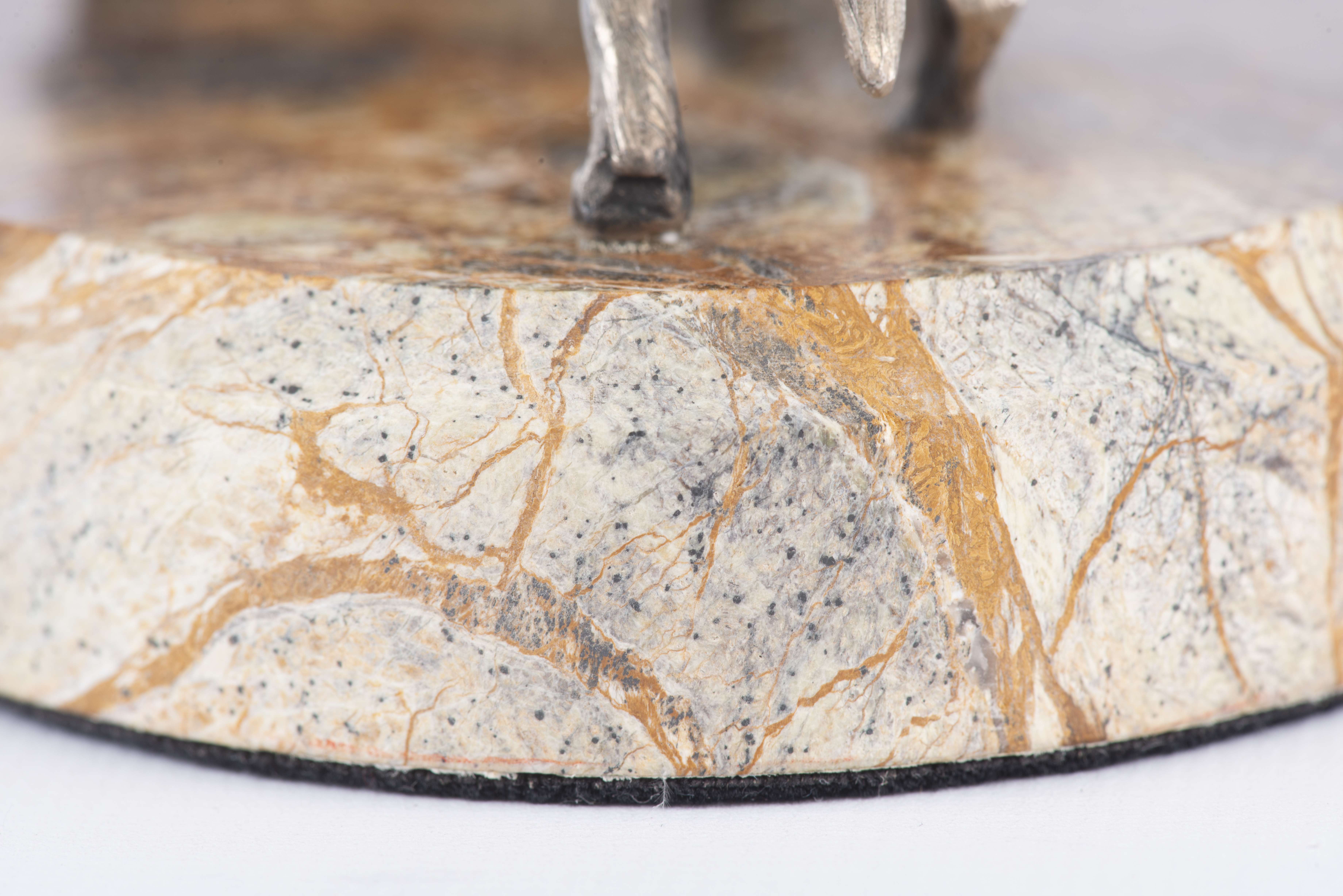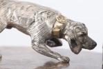 Sculpture représentant un chien de chasse à l'affut et en canard en envol en argent sur une base en marbre, poinçon argent 925 sur le collier du chien.