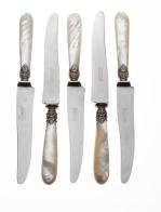 Service à manche en nacre comprenant 12 grands couteaux, 12 couteaux à fruits et une truelle à gâteau.