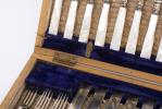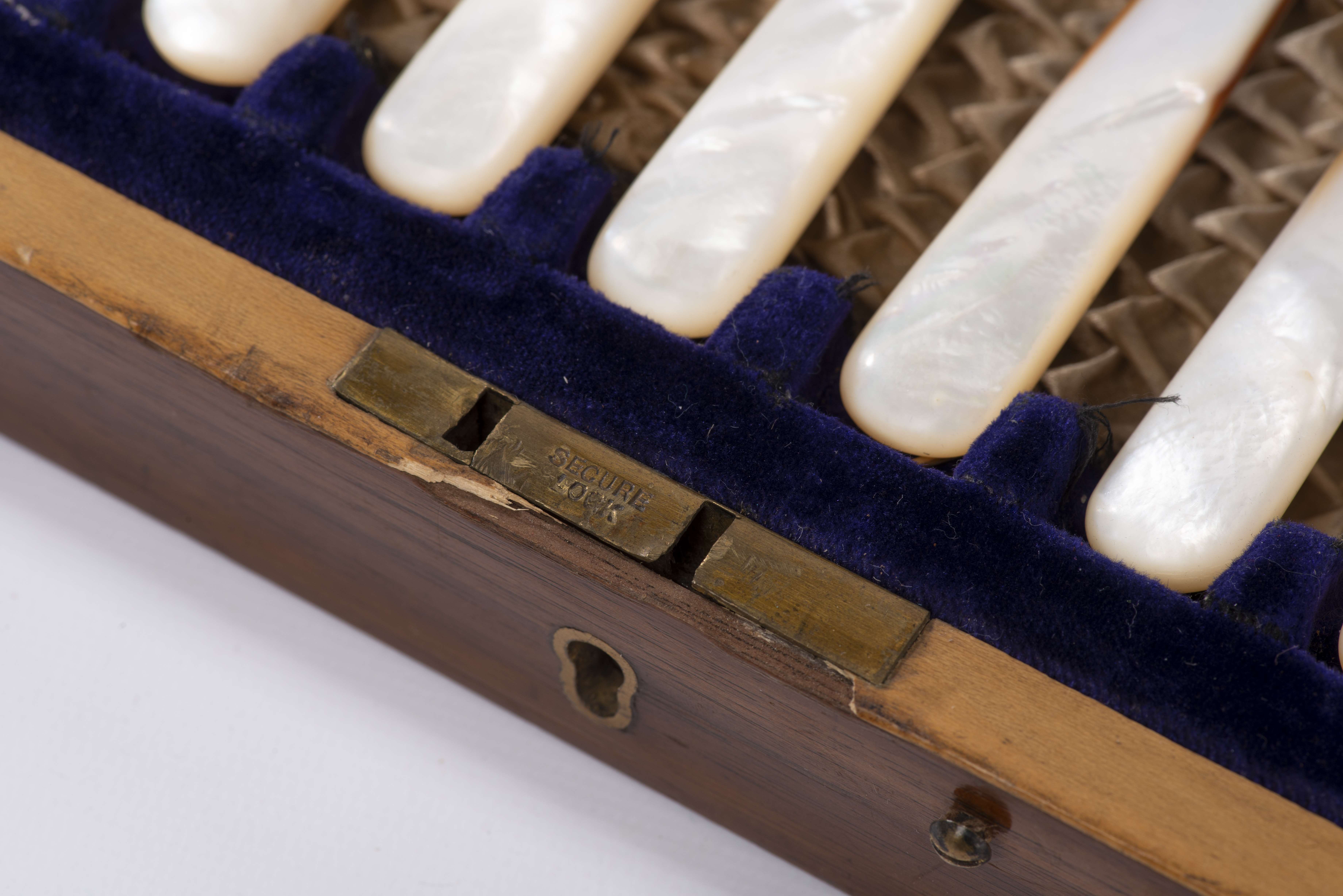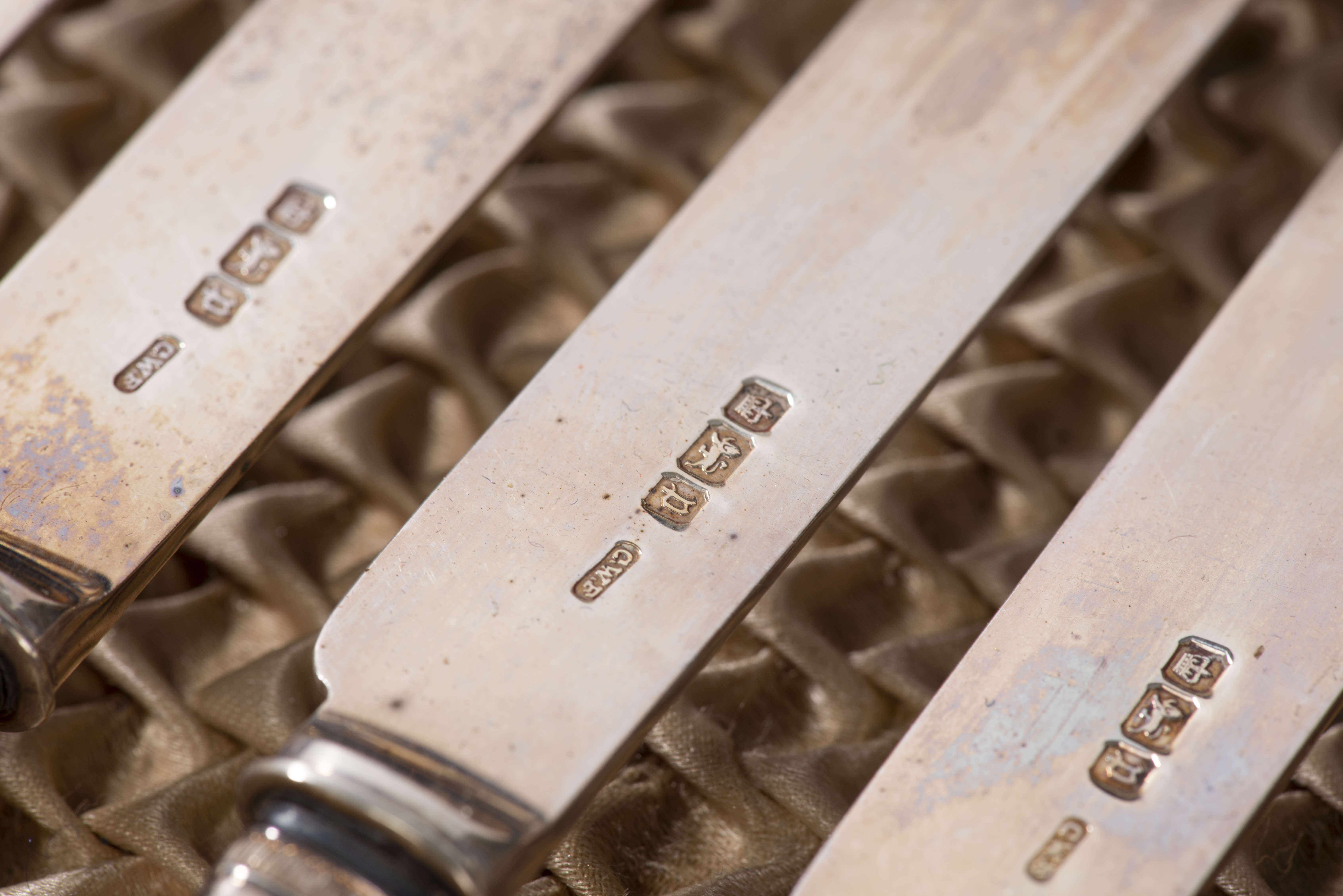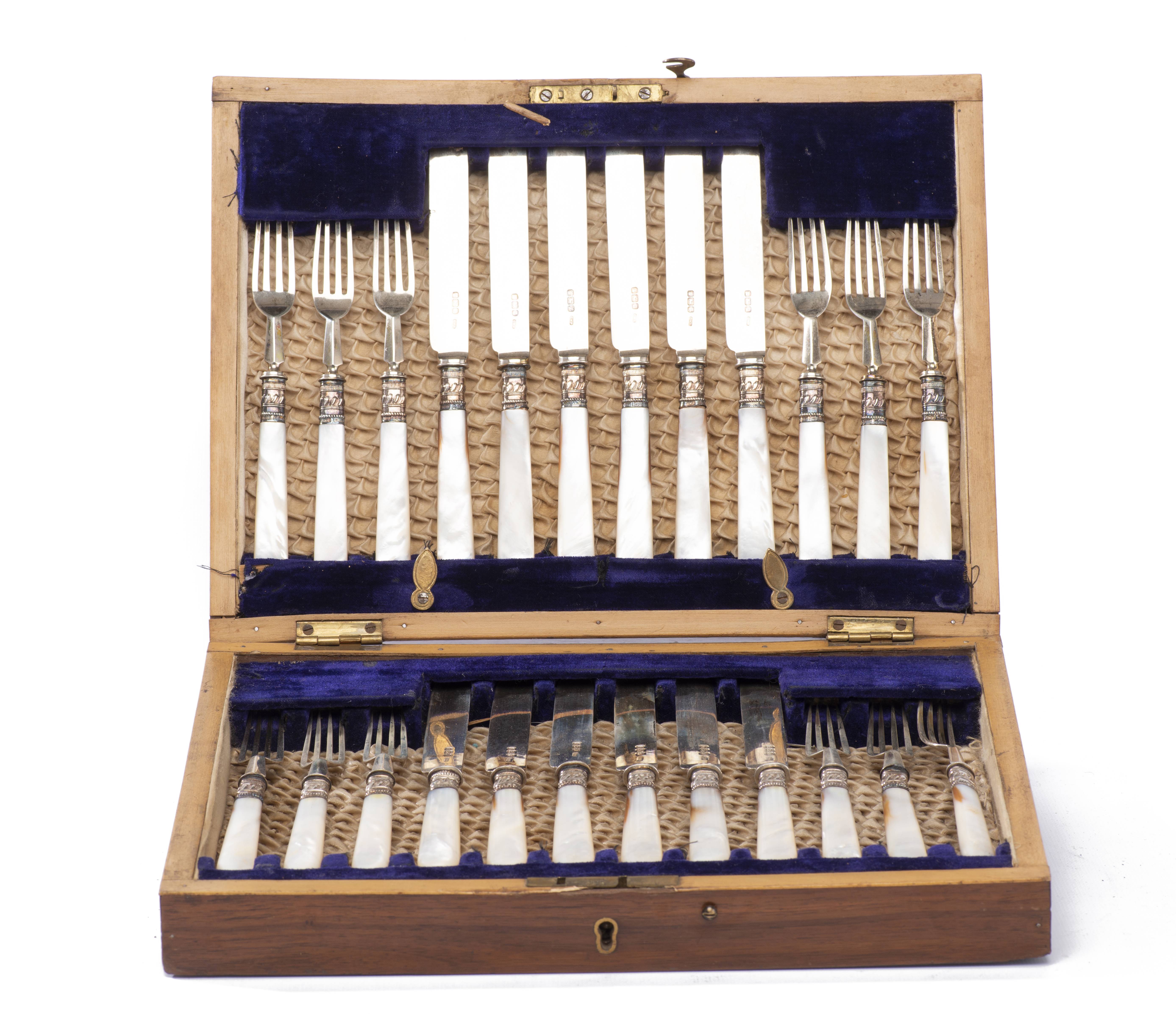 Lot de douze couteaux et douze fourchettes à dessert en argent Sterling .925 anglais par CWF à manche en nacre.