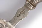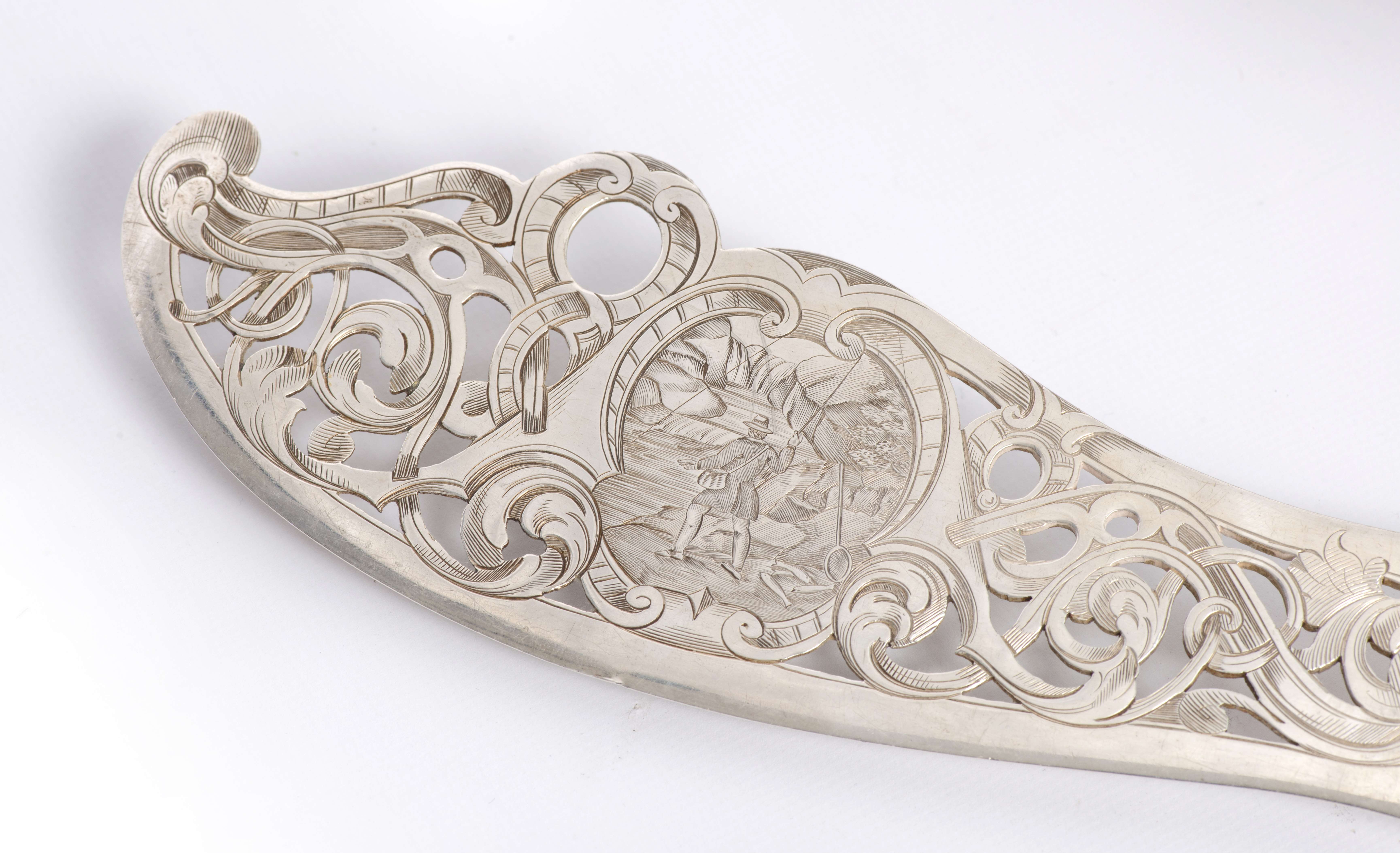 Service à poisson en agent sterling .925 anglais de Sheffield par HH de 1859, lame ajourée à décor d'un pêcheur et d'une demi-lion pour le couteau et 5 pics ajourés pour la fourchette de service. Manches en ivoire décoré de poissons. Bagues à décor de vigne.