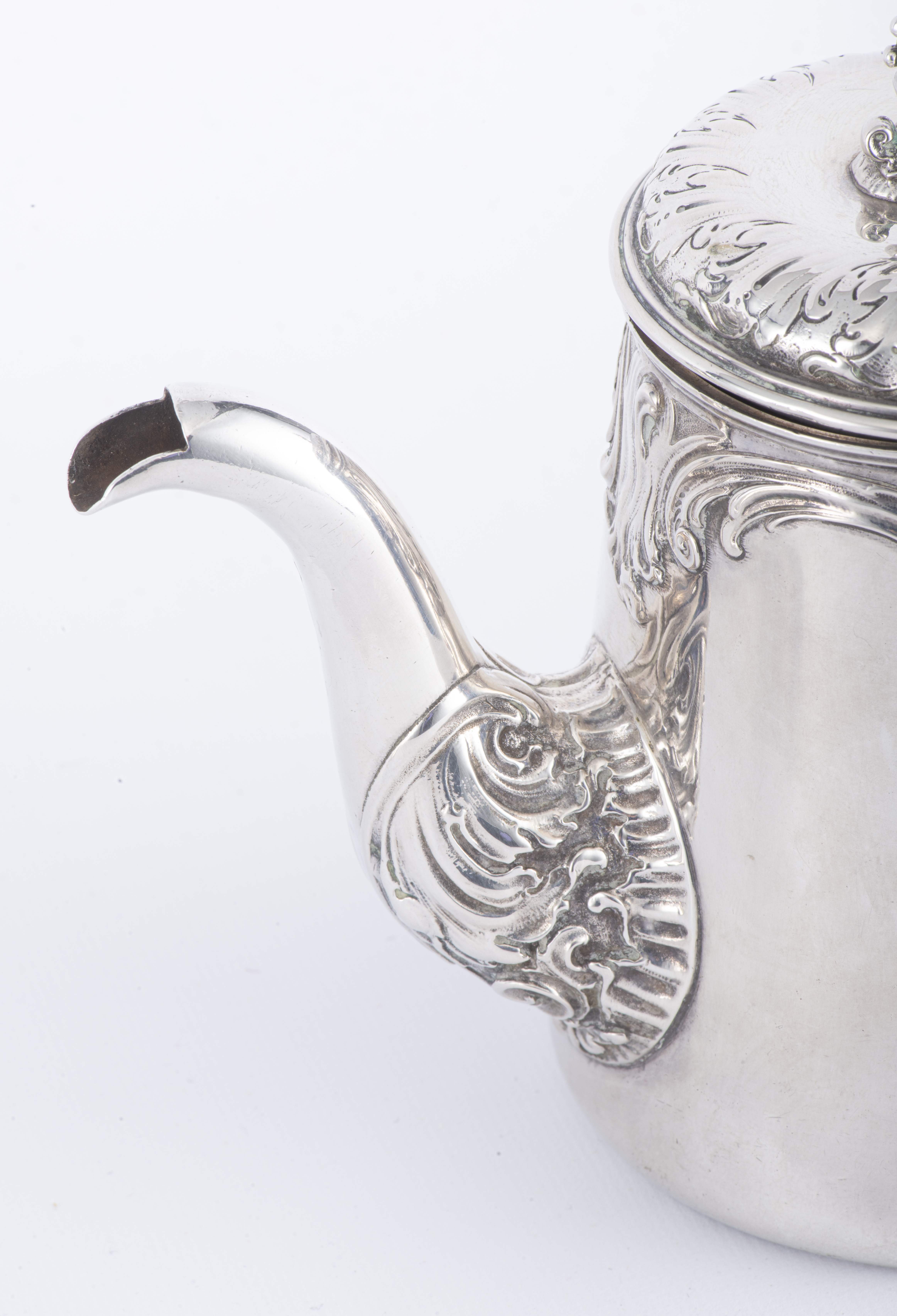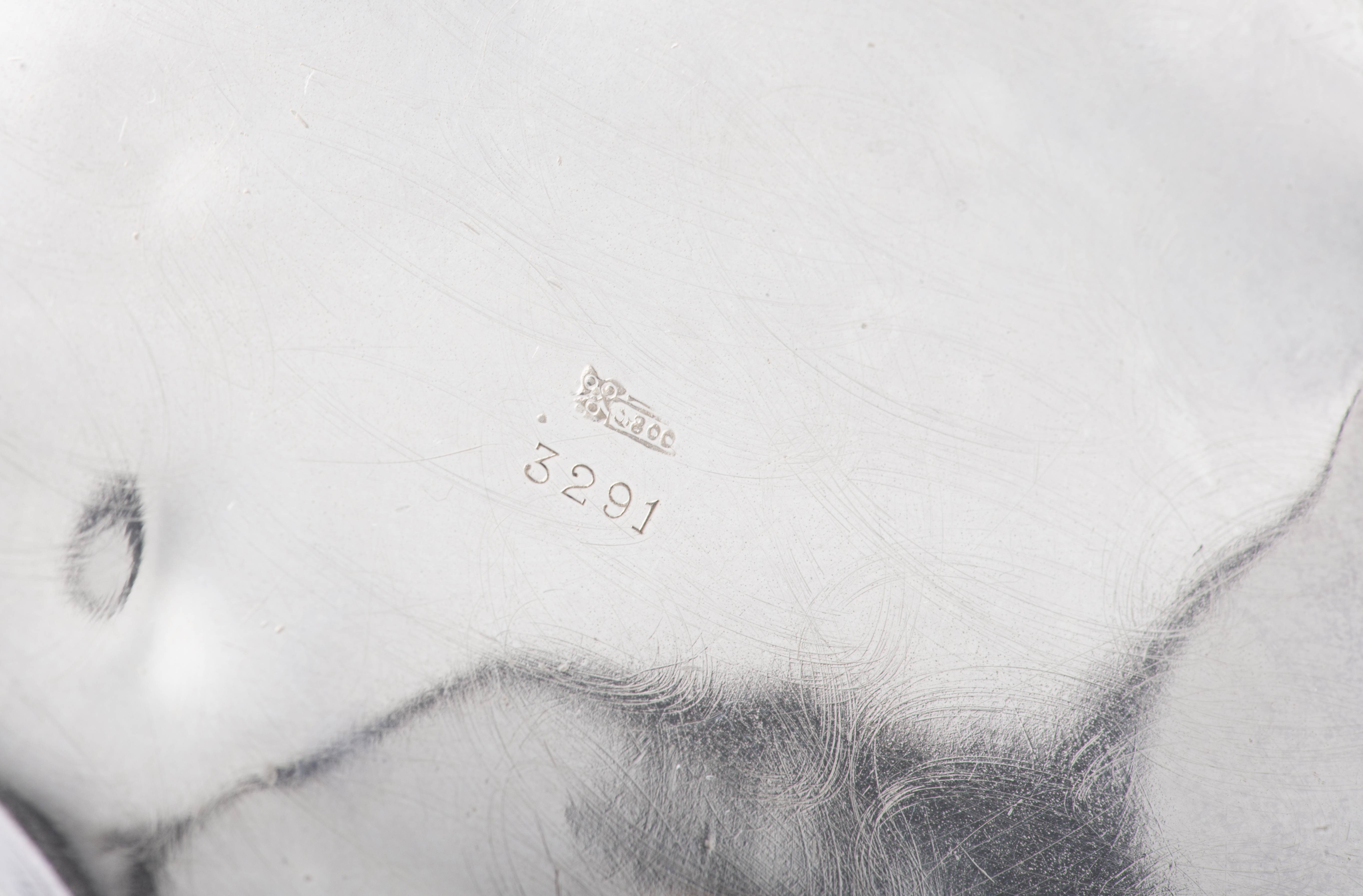 Service à thé en argent .800 Jezler comprenant la théière, le pot à eau, le sucrier à couvercle et le pot à lait. Monogrammé E M.
