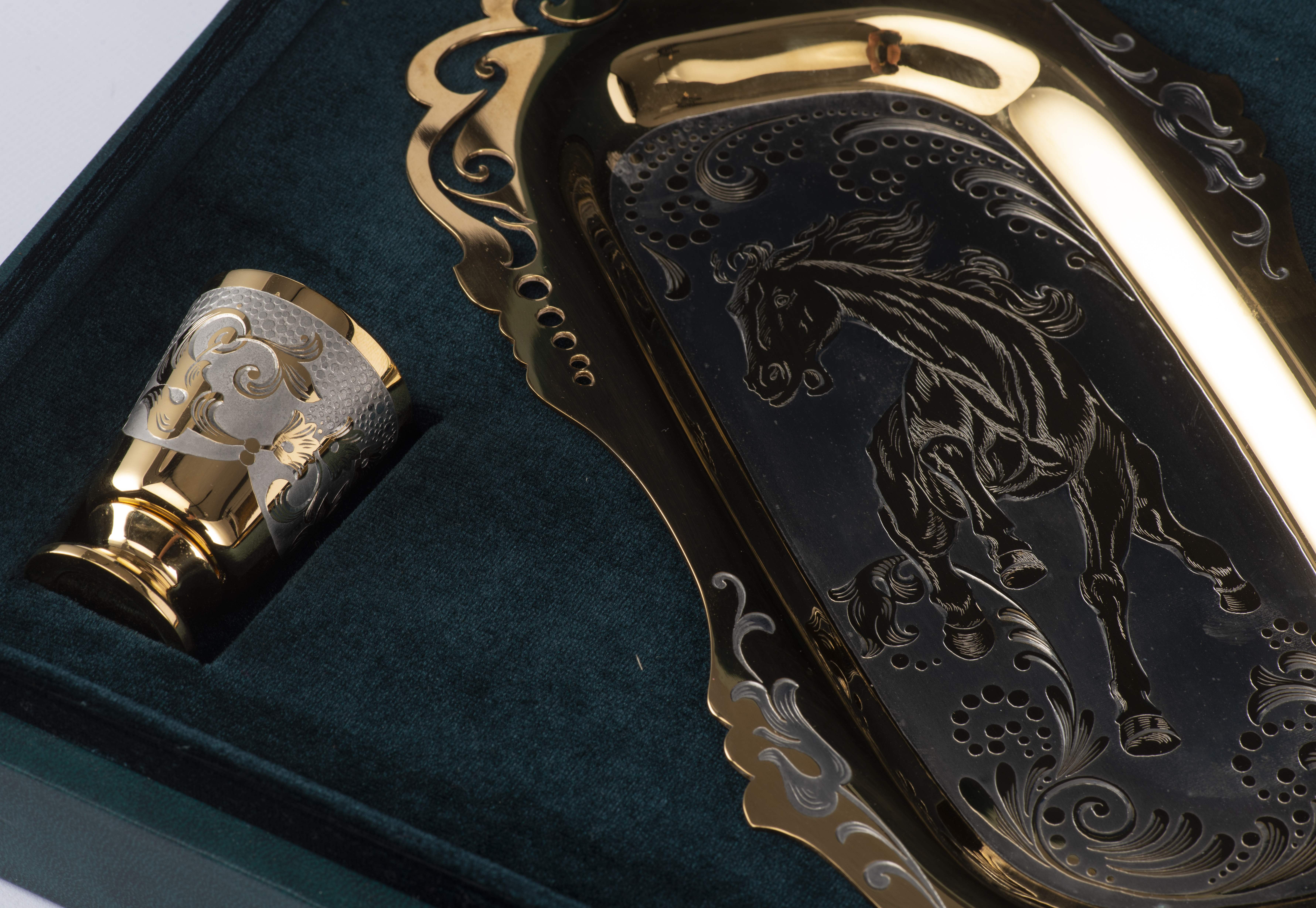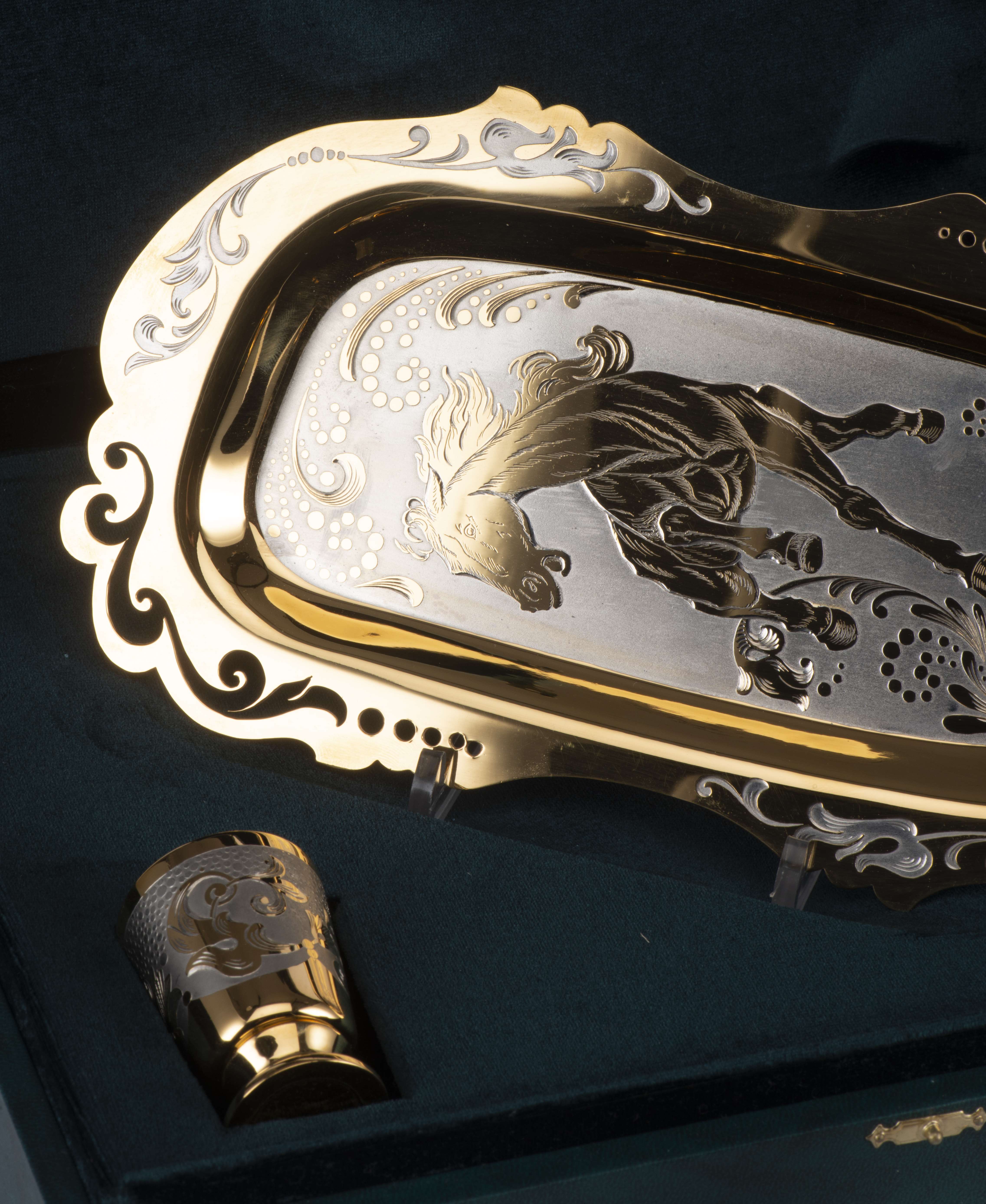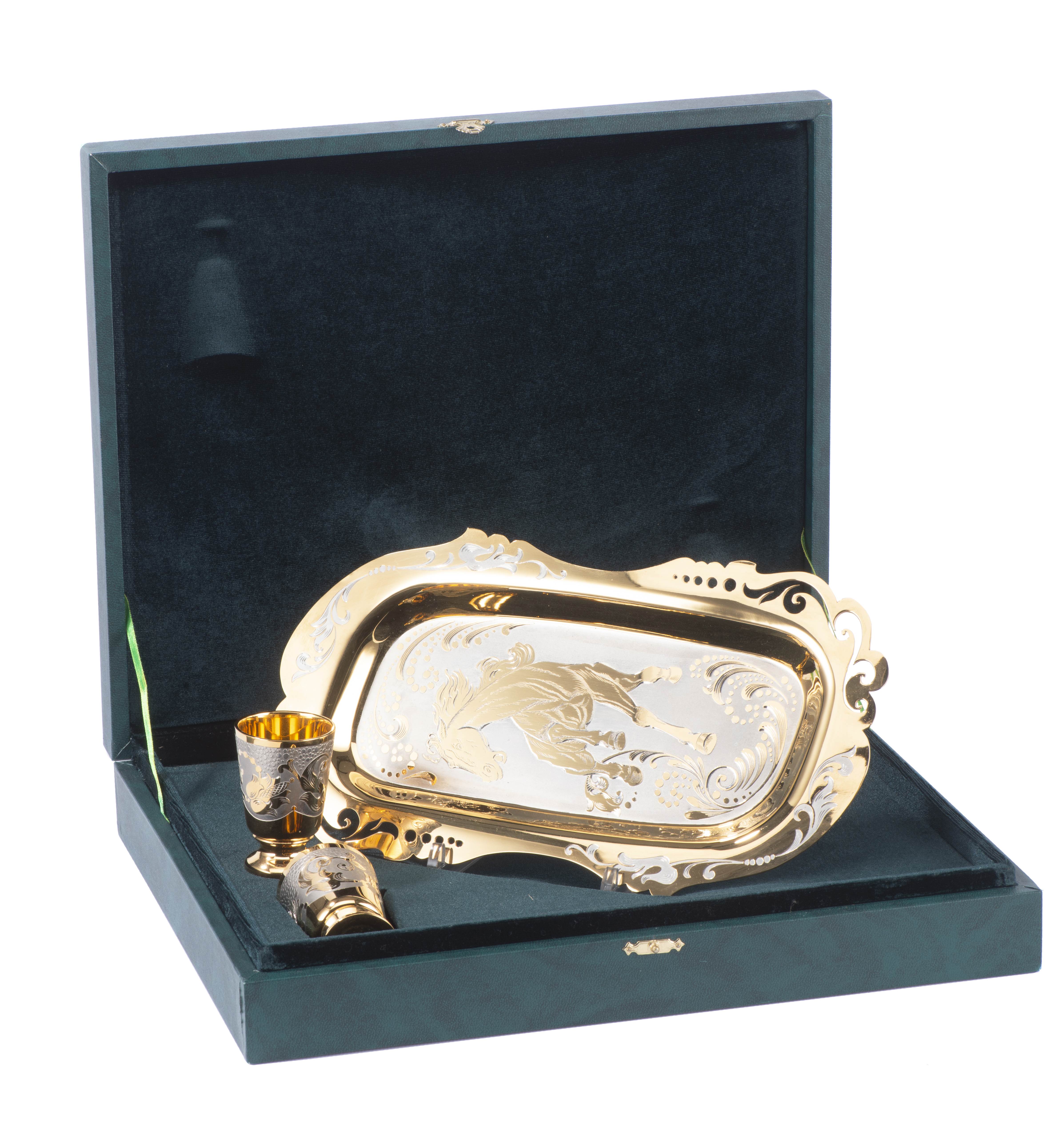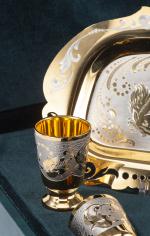 Service à thé russe comprenant un plateau avec 2 verres en nickel et métal doré décoré pour le plateau d'un cheval et les coupes à décor floral.