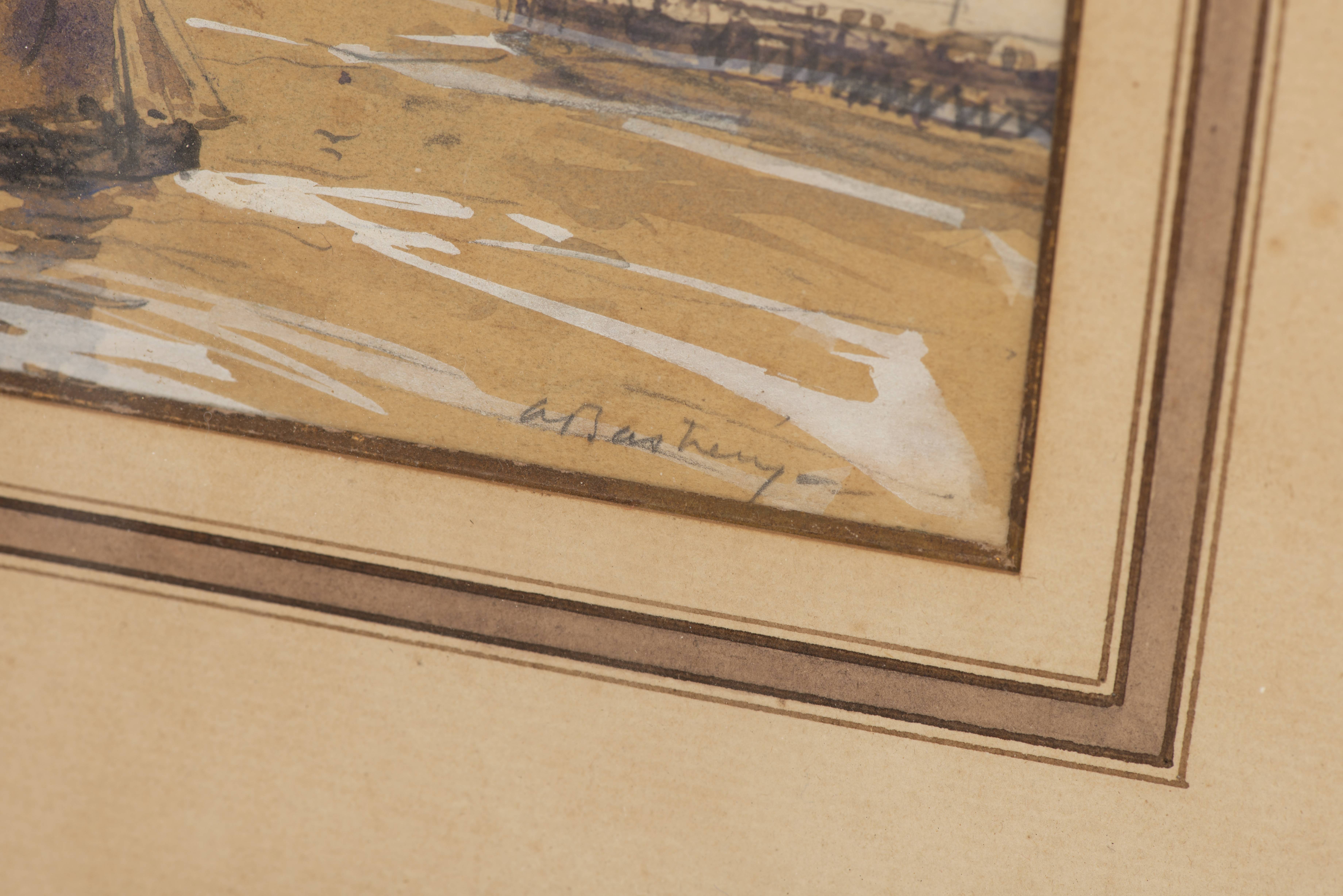 Signature non identifiée "Bateaux en bord de mer", aquarelle sur papier, signé en bas à droite au crayon, signature non déchiffrée.