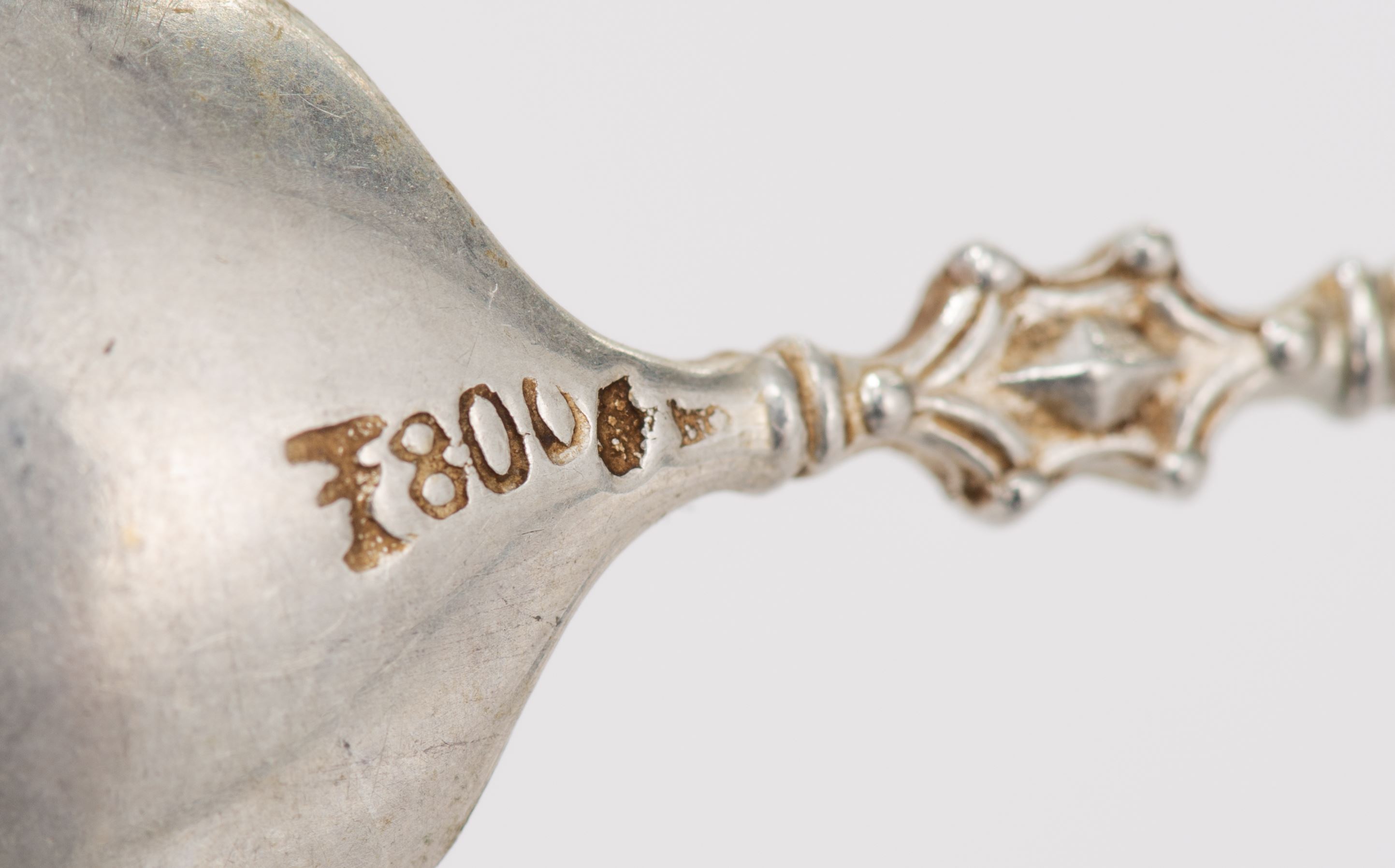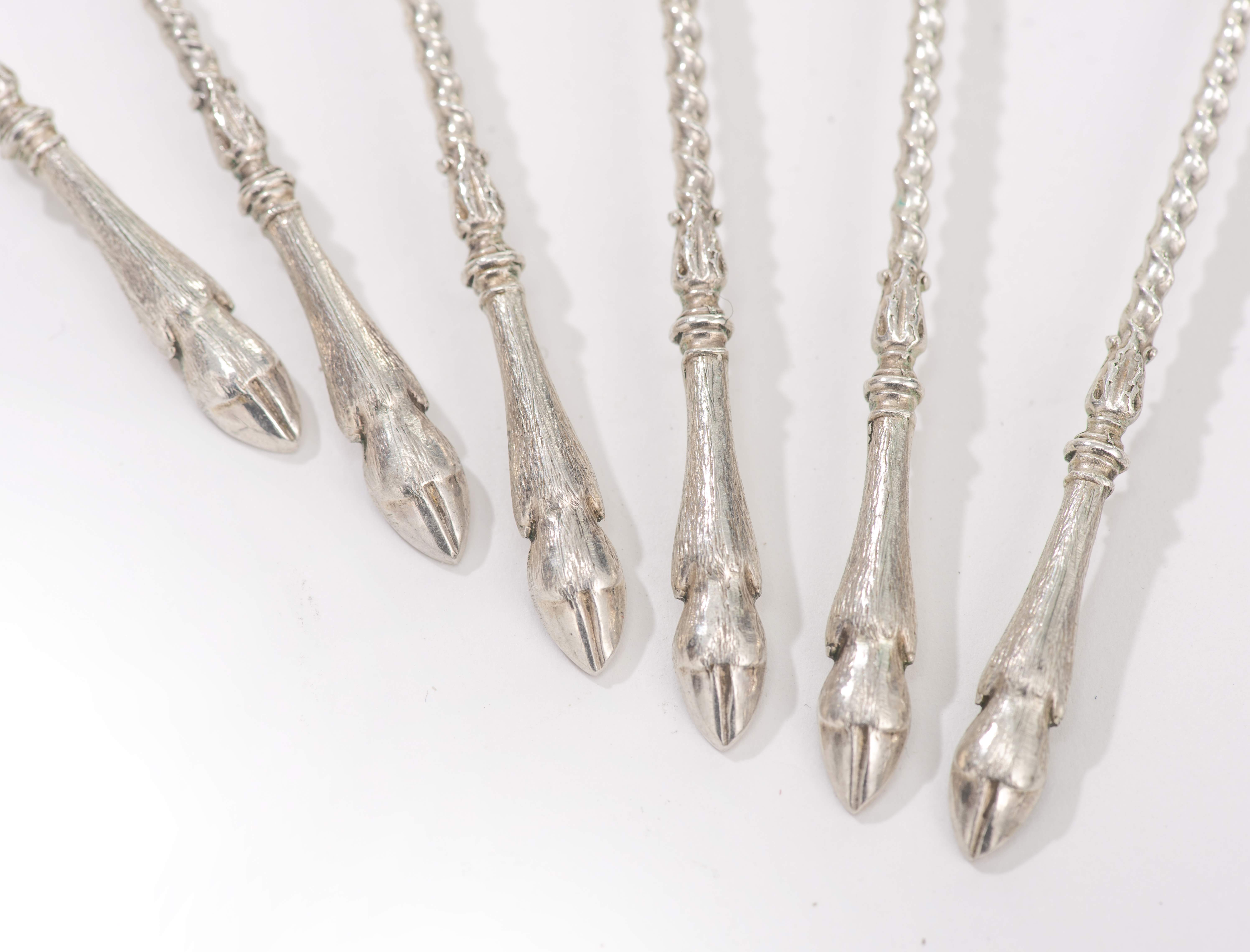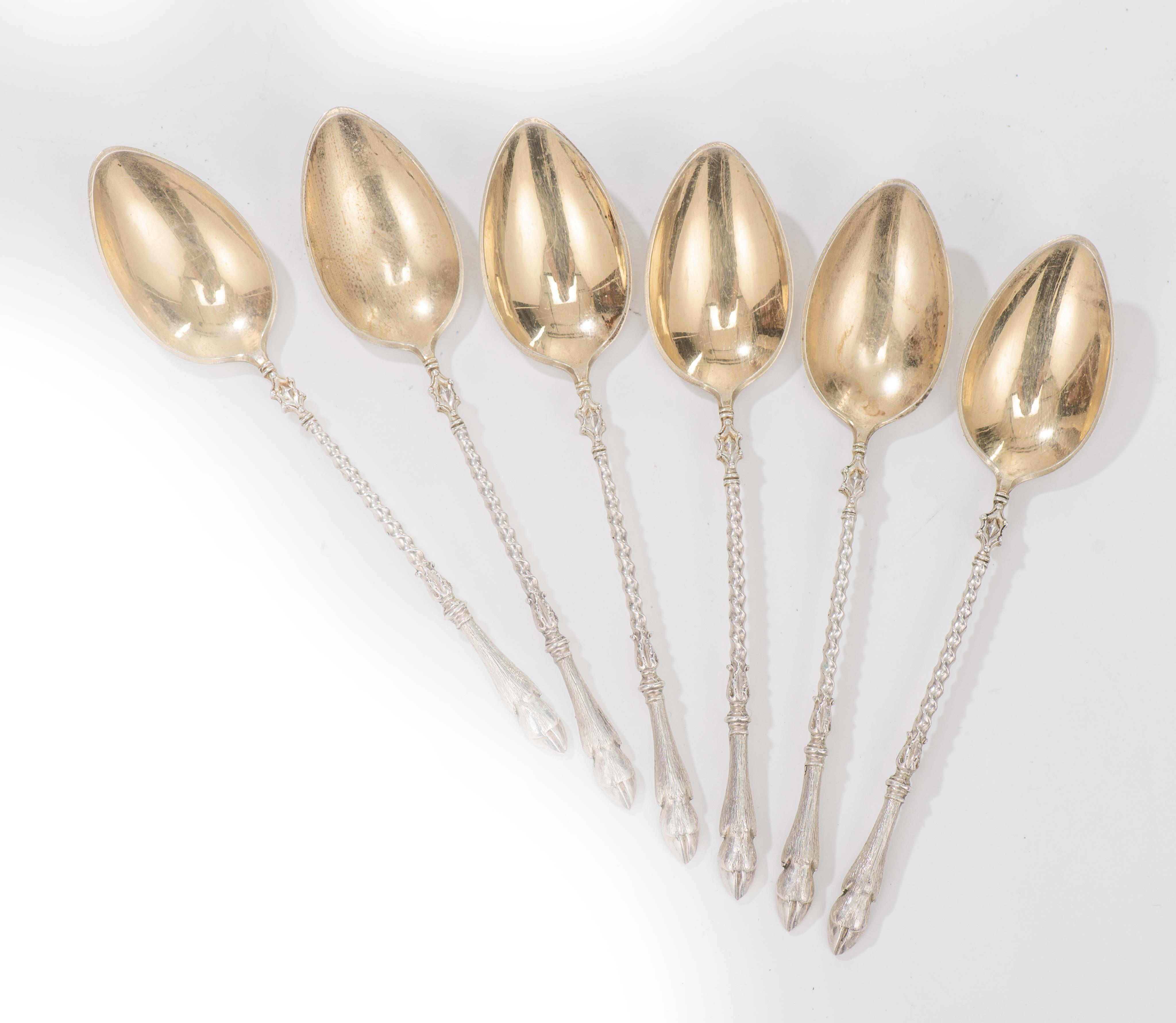 Six cuillères à café en argent .800 à cuilleron vermeil et manche torsadé terminé par un sabot de cerf-