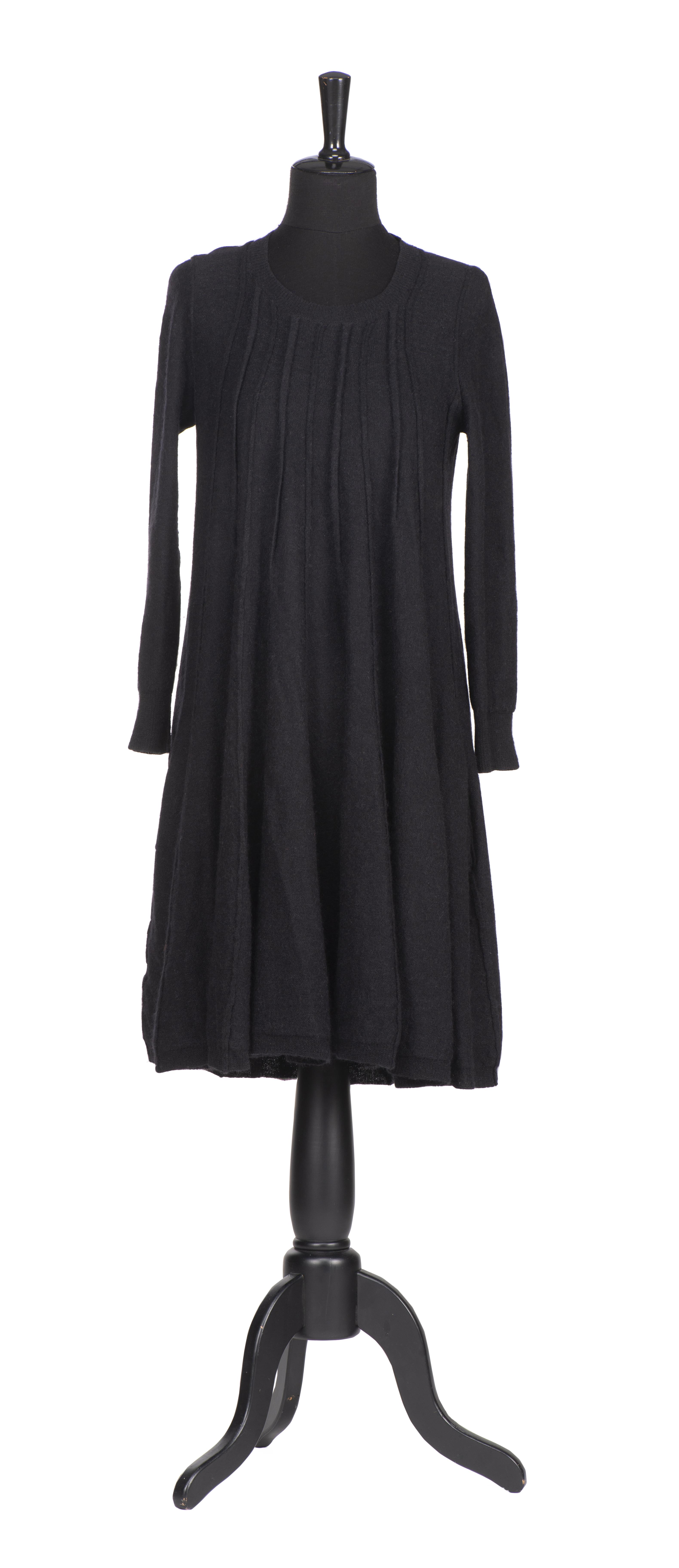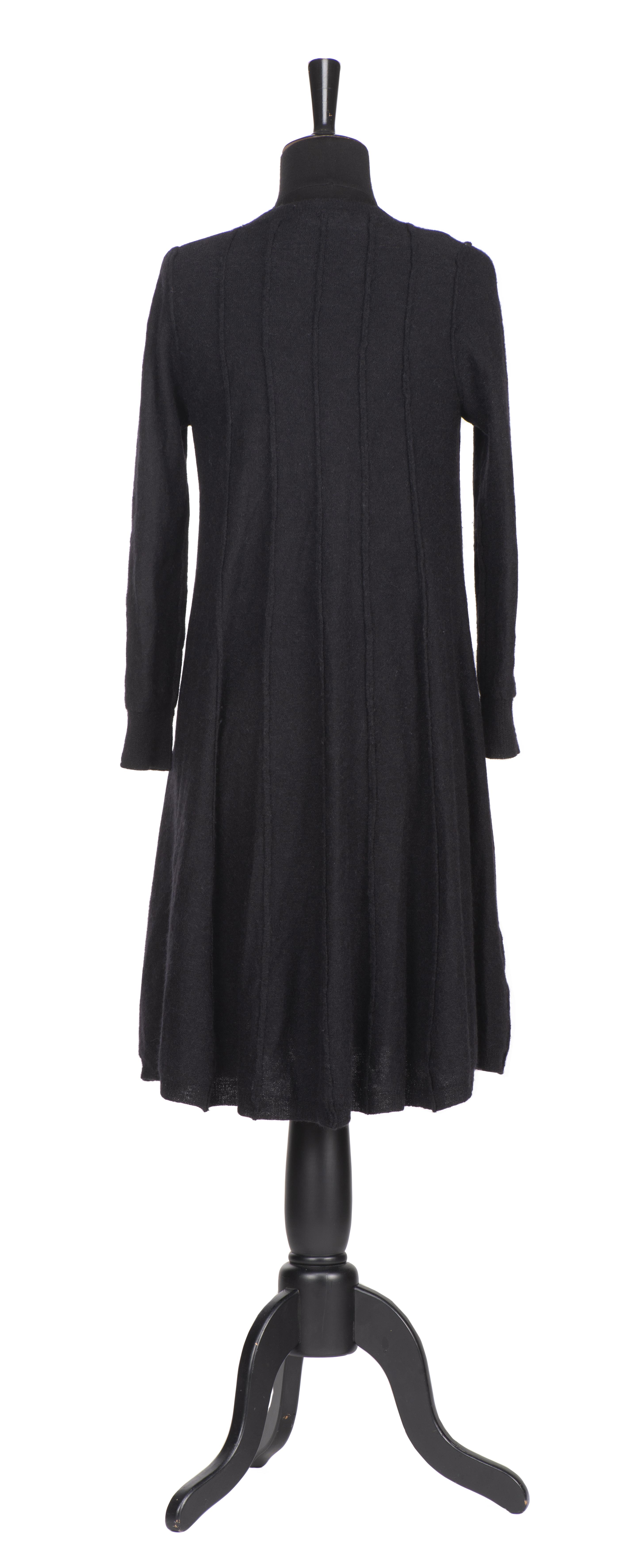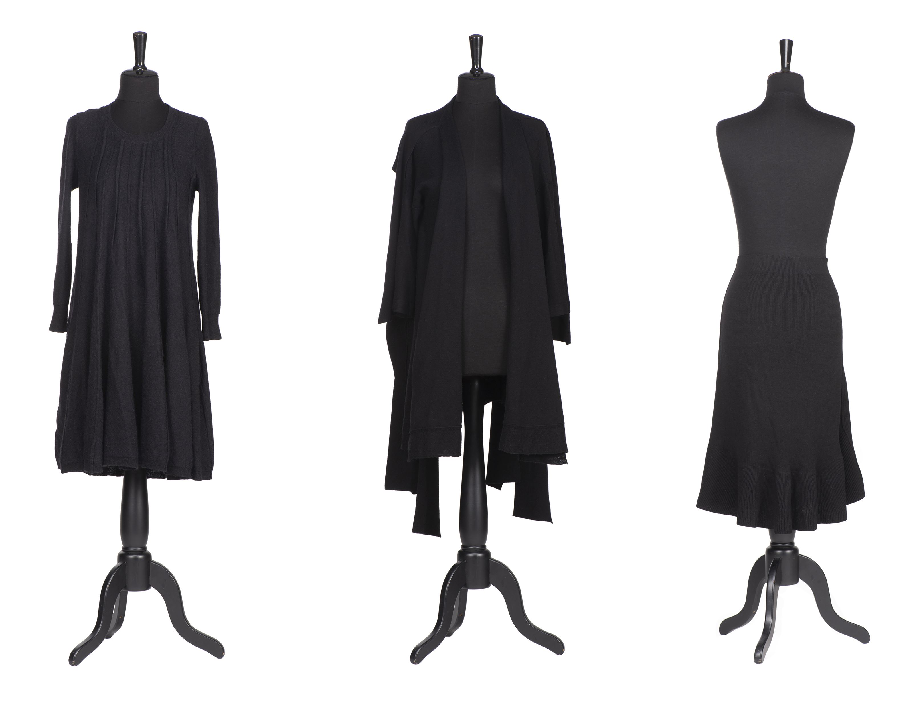 SONIA RYKIEL Paris, veste maille noire longue déstructurée, on y joint une robe en lainage gris anthracite et une jupe maille noire à godets.