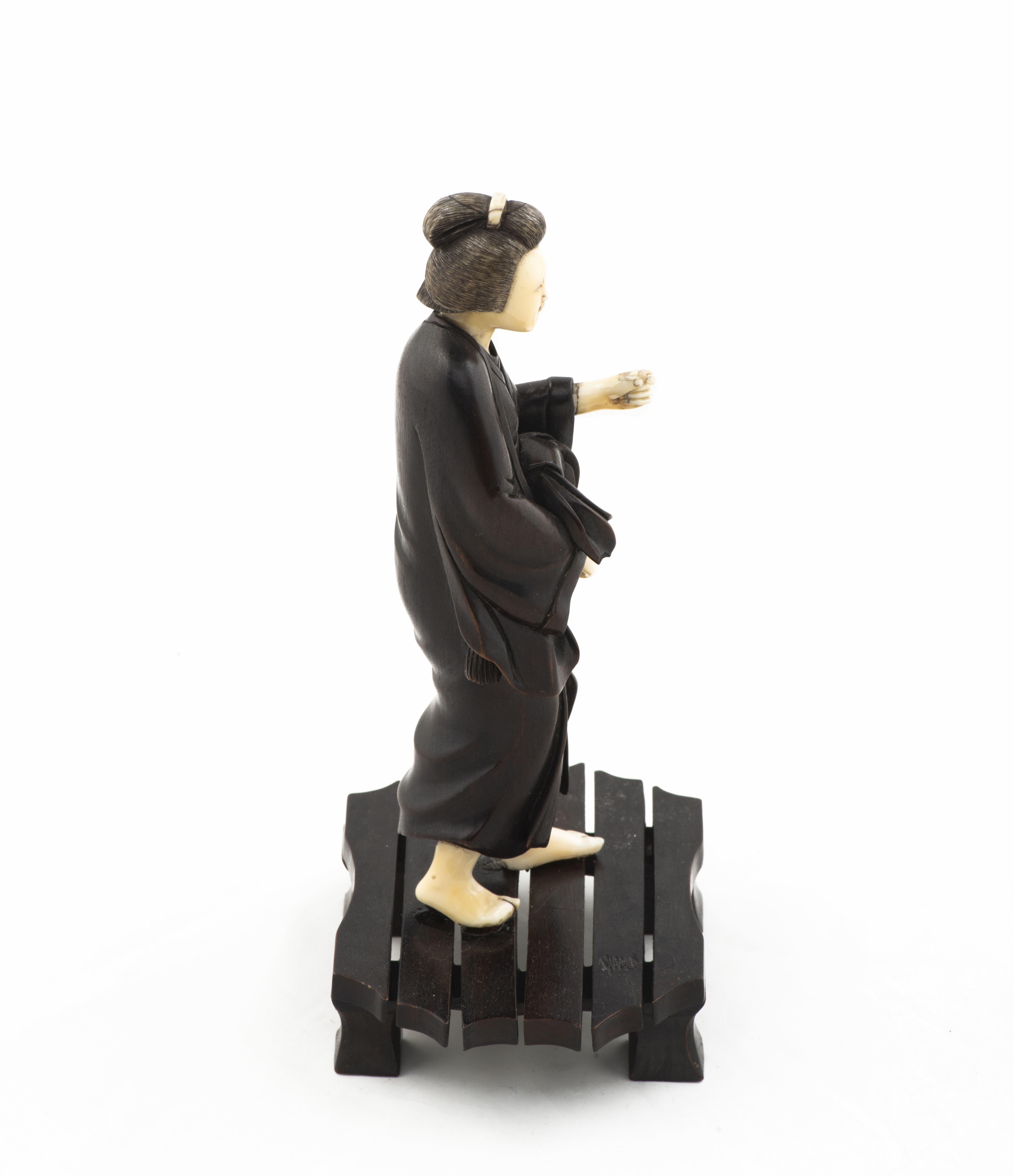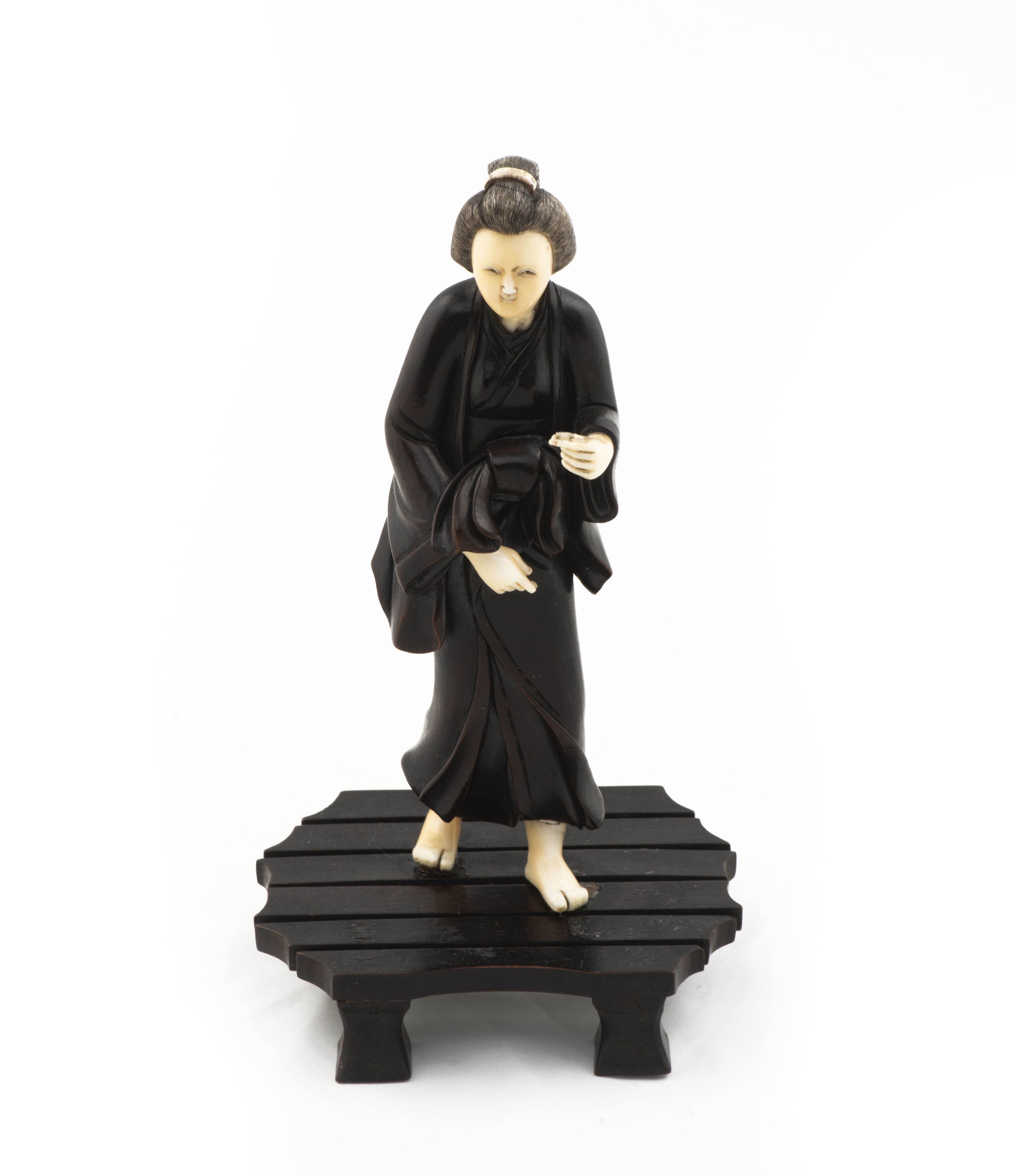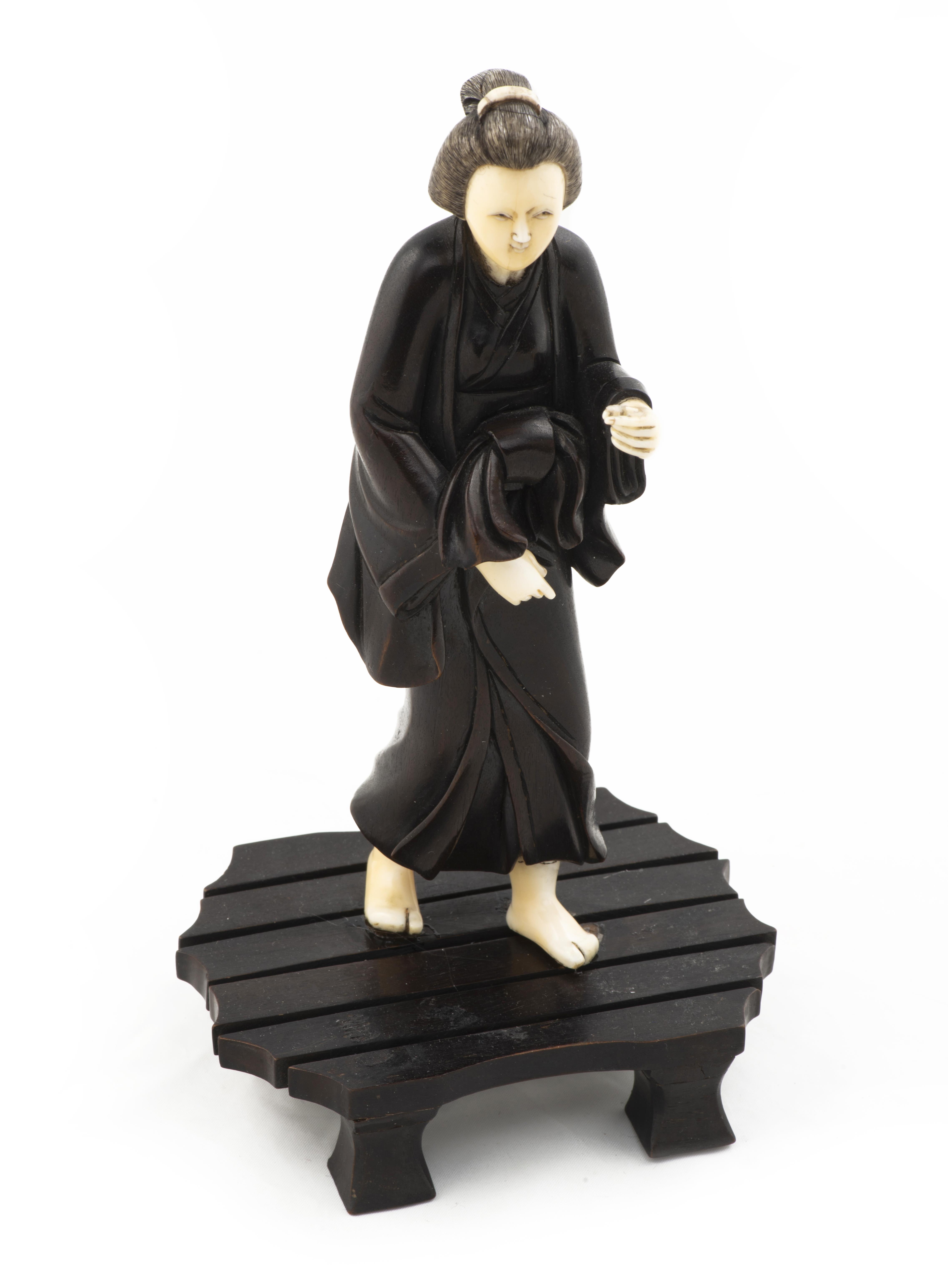 Statuette japonaise en bois, tête, pieds et mains en ivoire, représentant une femme marchant