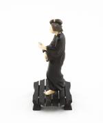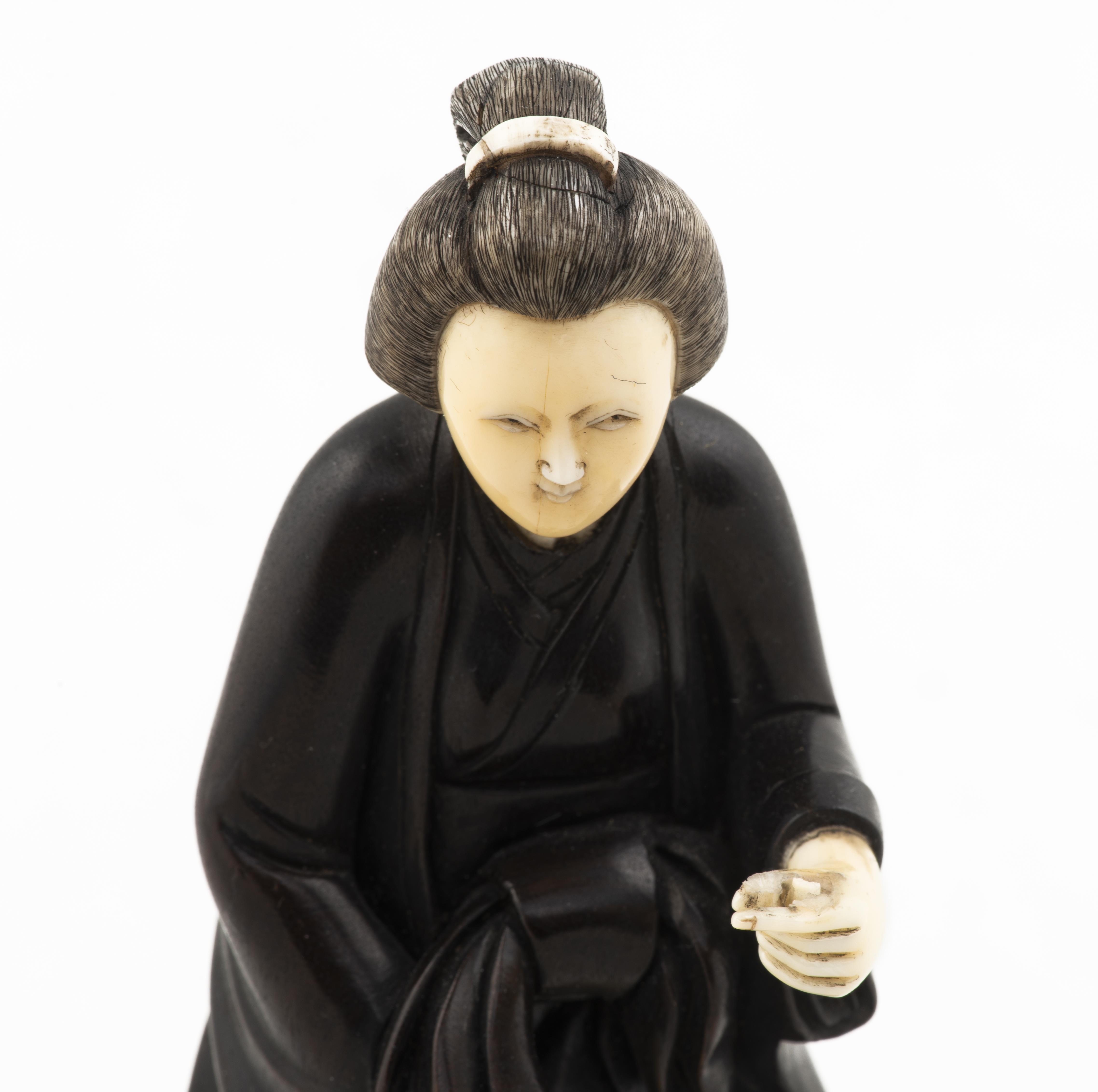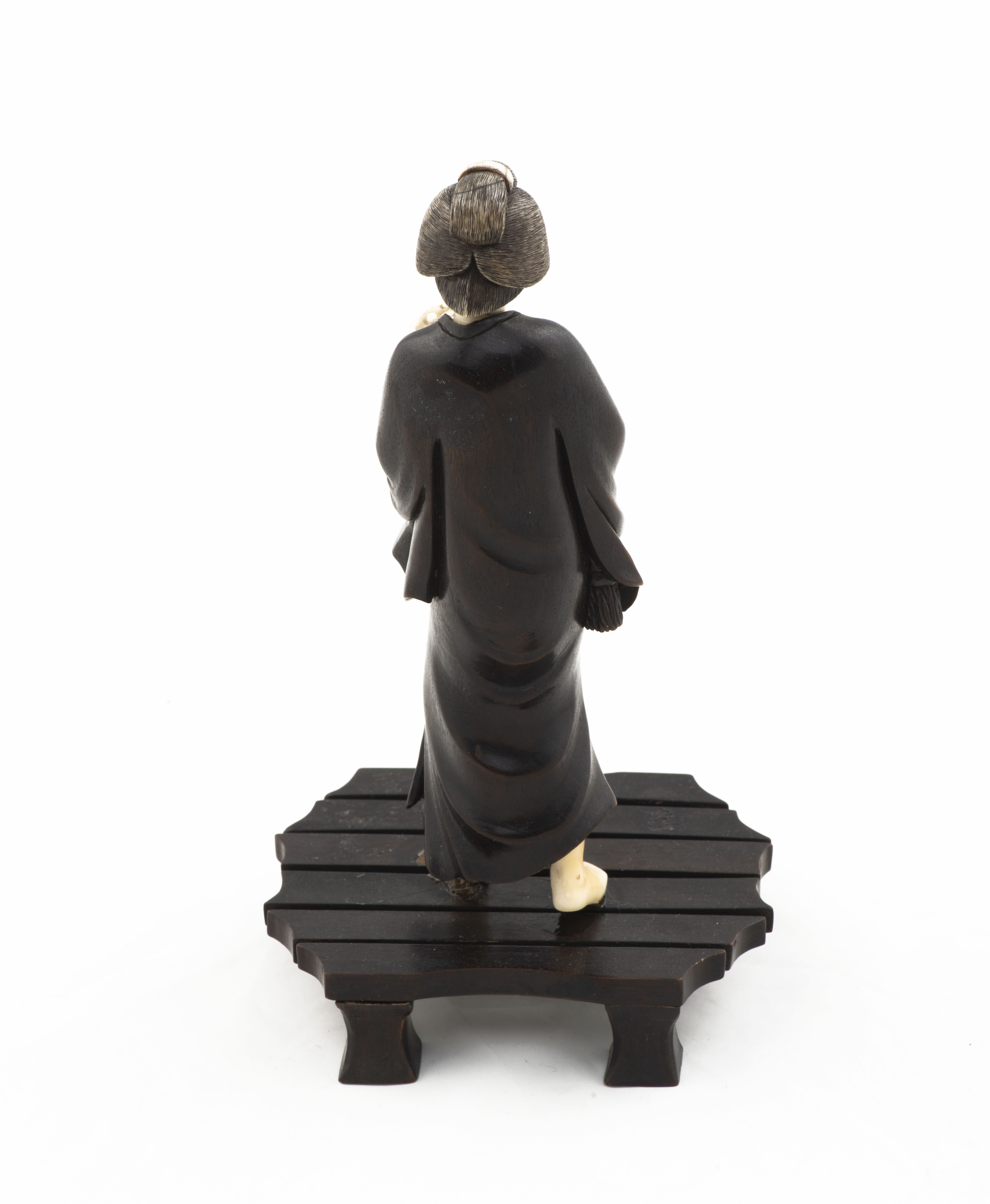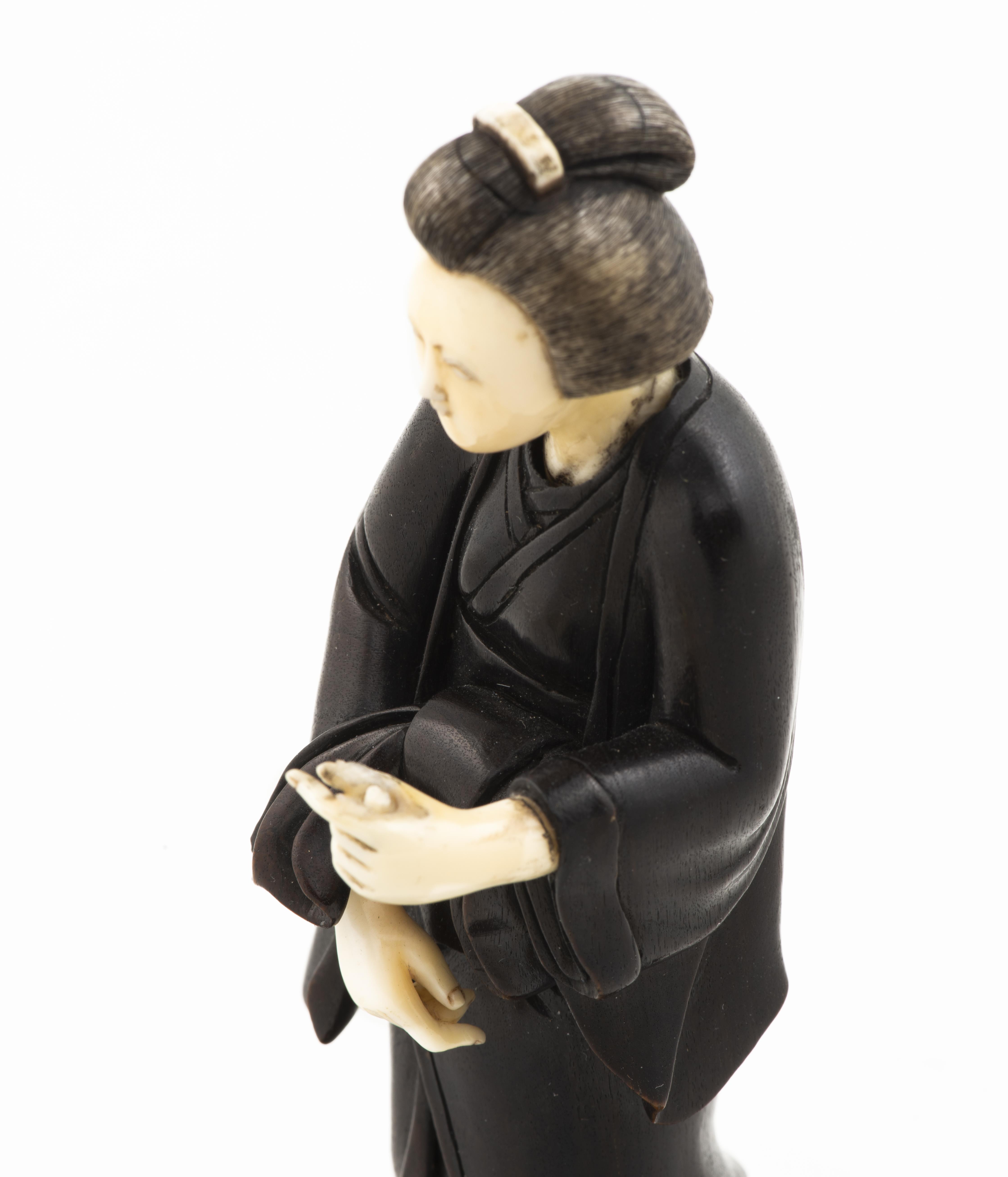 Statuette japonaise en bois, tête, pieds et mains en ivoire, représentant une femme marchant