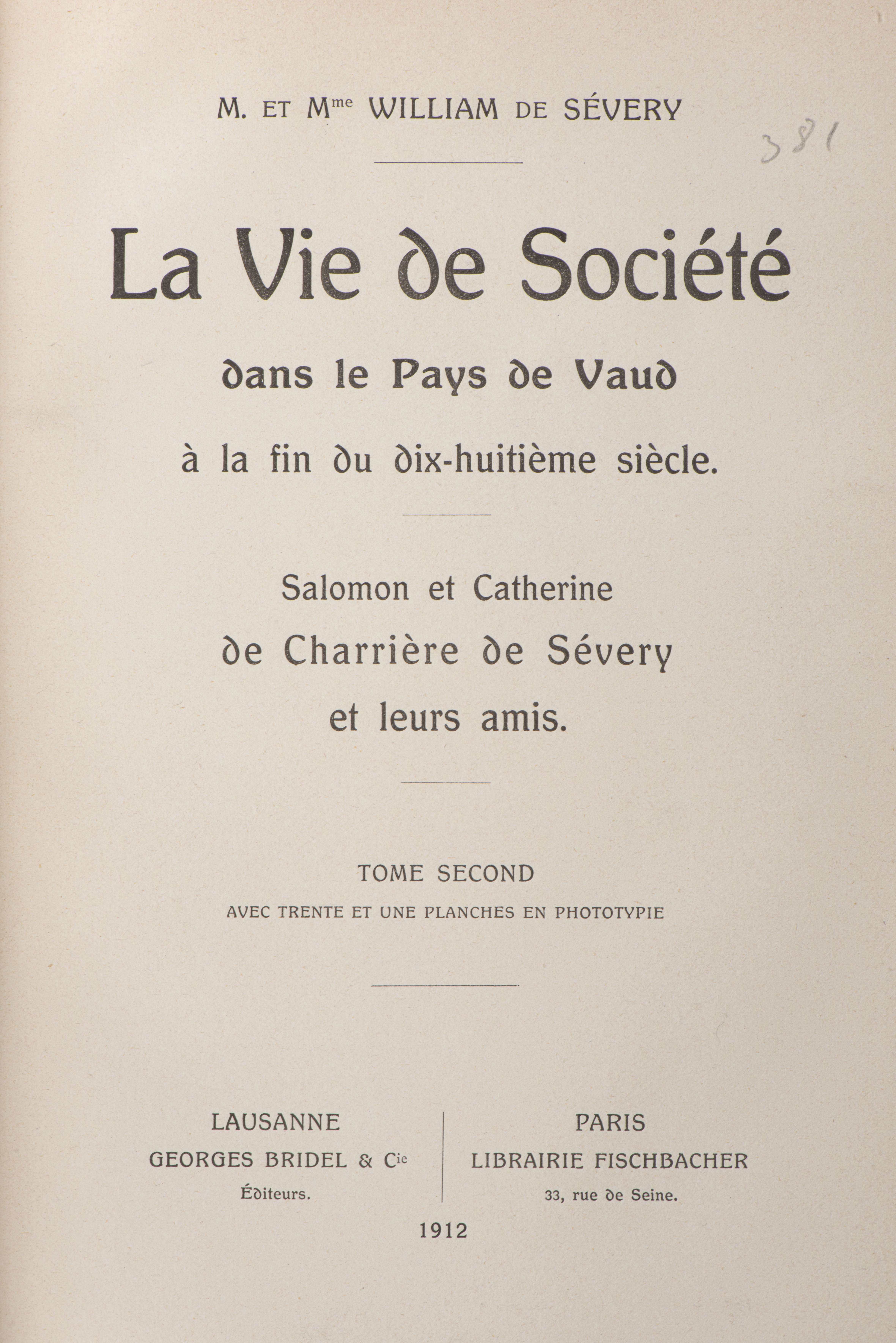 Sévery M. et Mme WILLIAM, "La Vie de Société dans le Pays de Vaud à la fin du dix-huitième siècle", Salomon et Catherine de Charrières de Sévery et leurs amis, Georges Bridel / Librairie Fischbacher, Lausanne/Paris, 1911-1912, 2 volumes, demi-chagrin rouge à coins, dos à 5 nerfs avec titre, filets et roulettes dorées, plats et gardes marbrés. Illustré de 69 planches en phototypie, avec cuvettes.