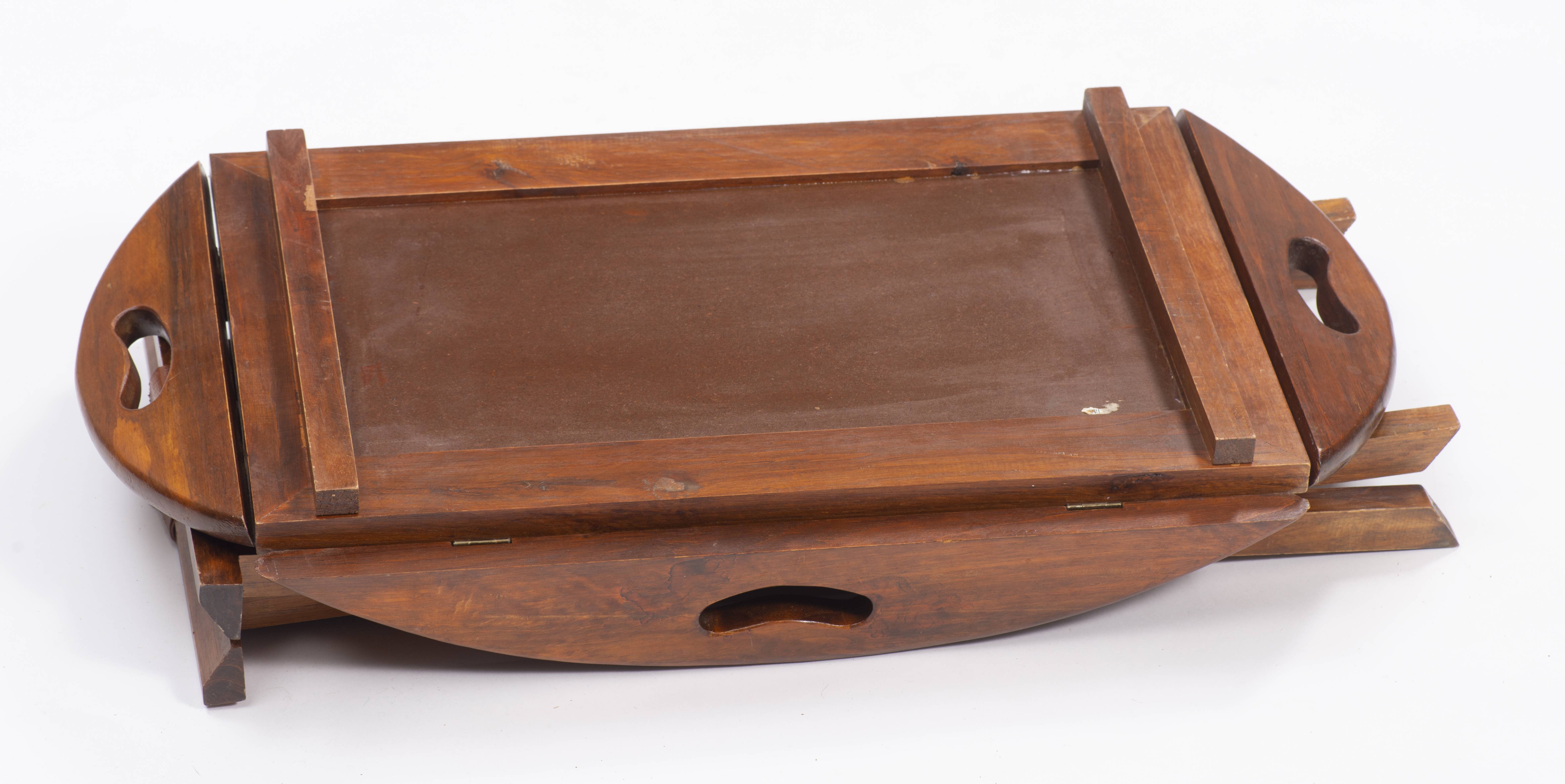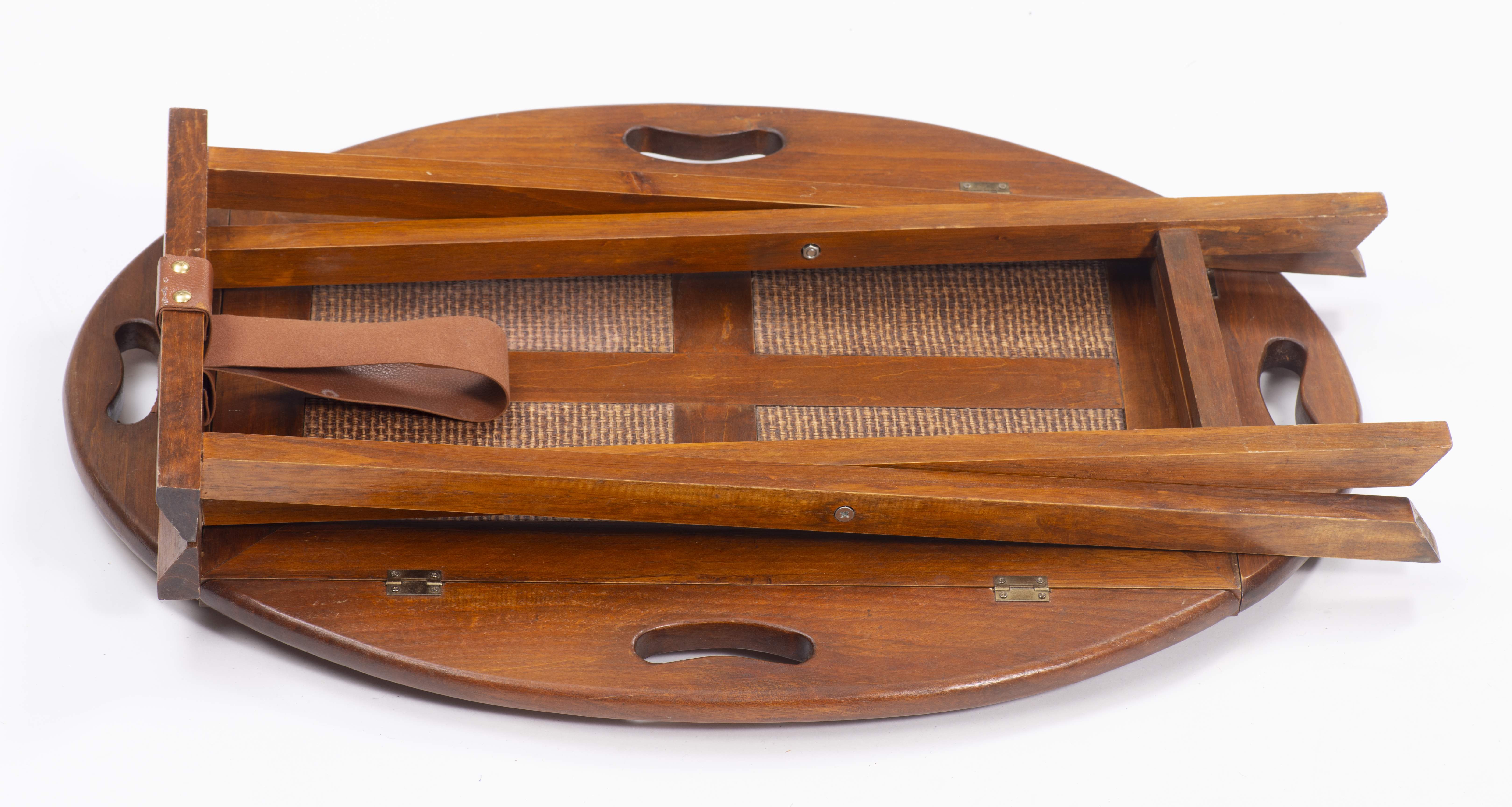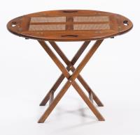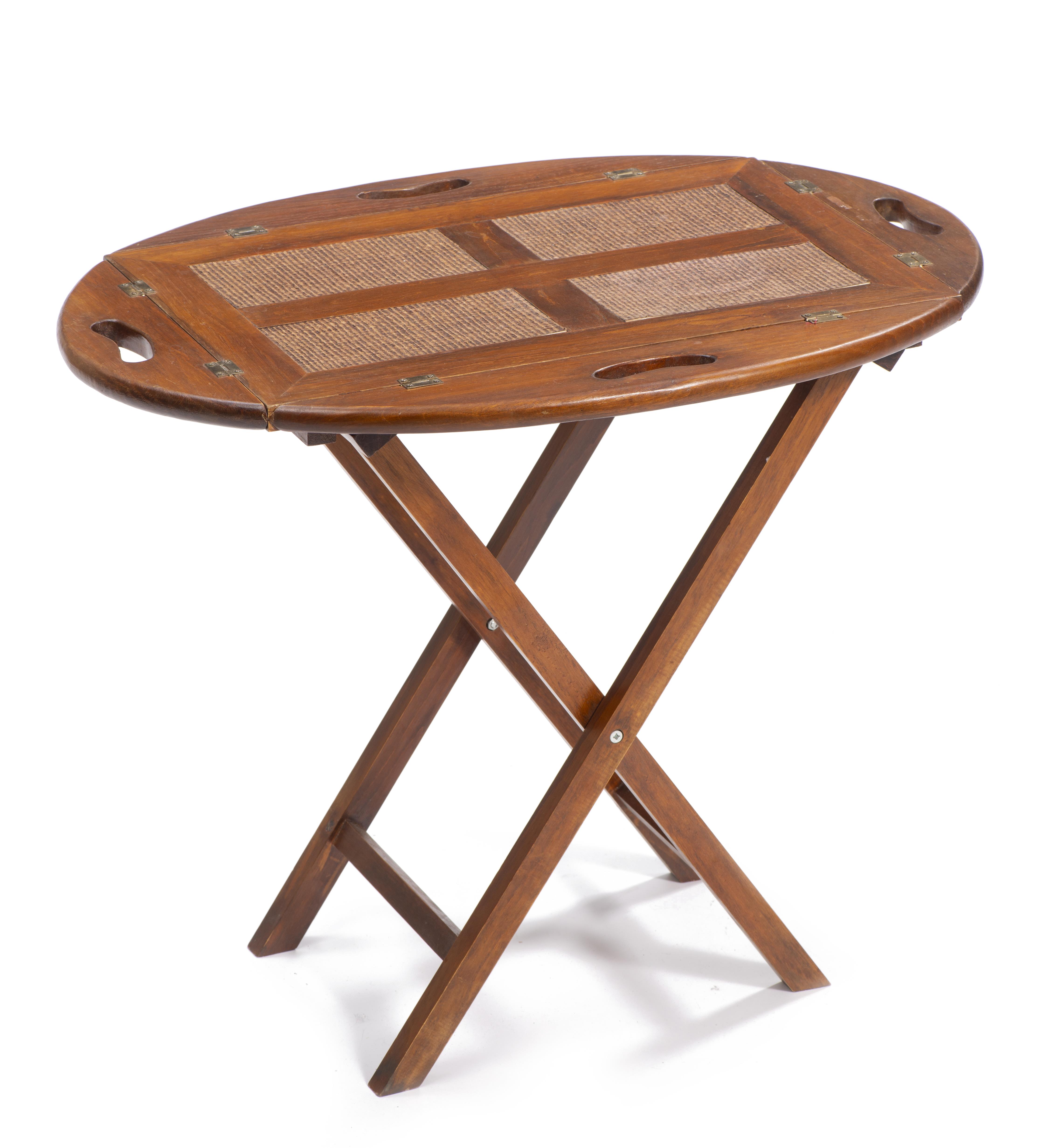 Table basse dite de marine en acajou, plateau amovible ovale à 4 bordures relevables, piétement déployant.