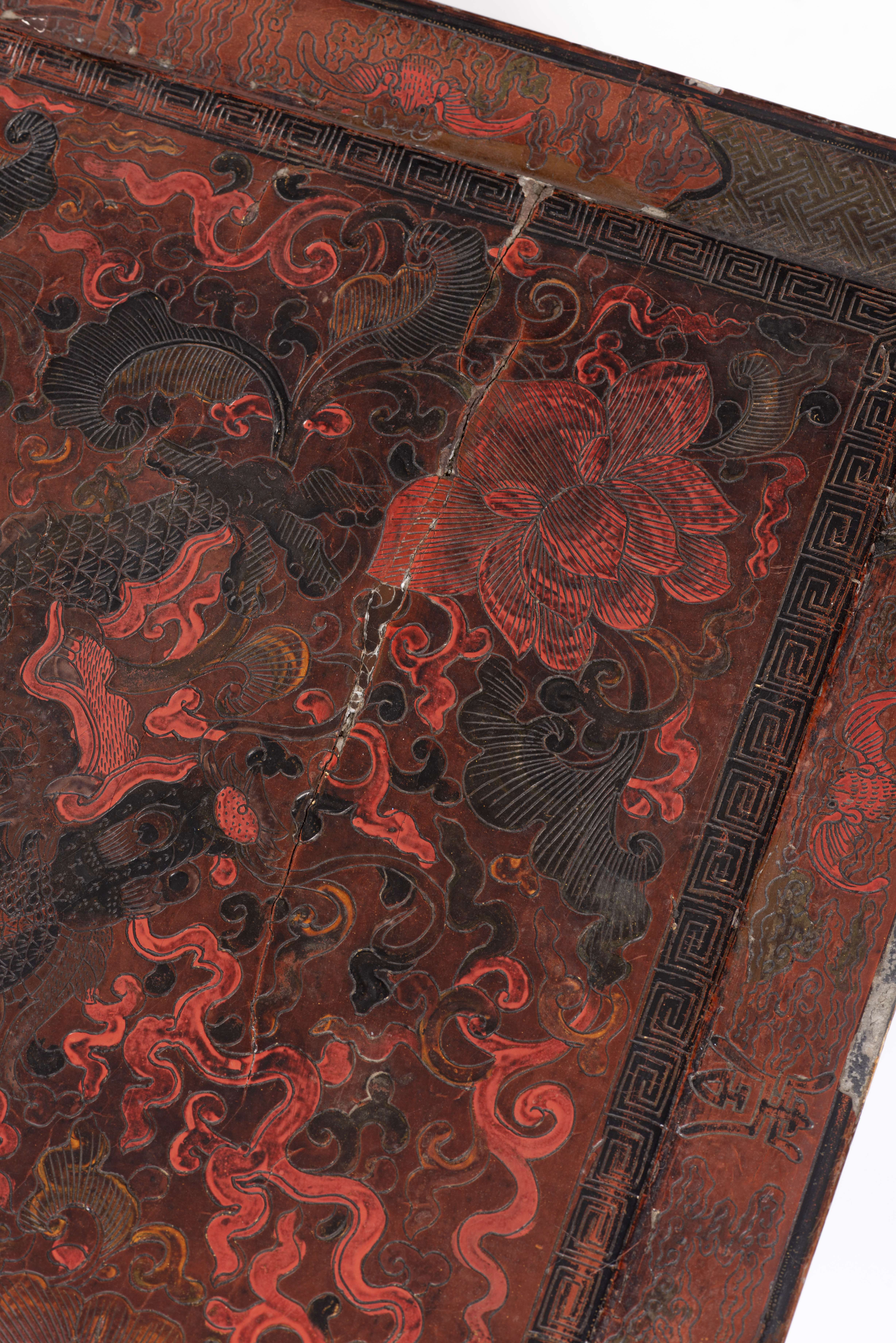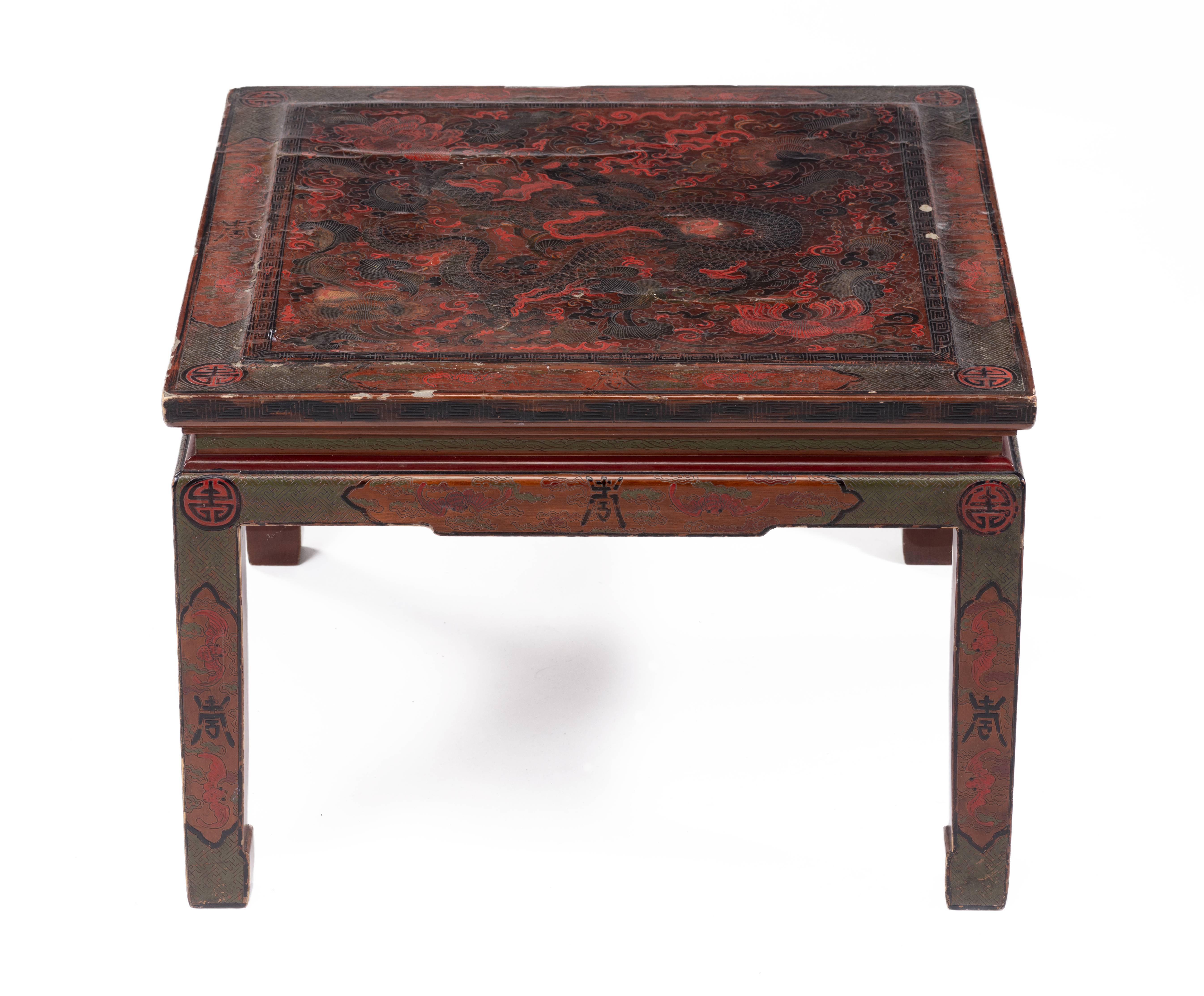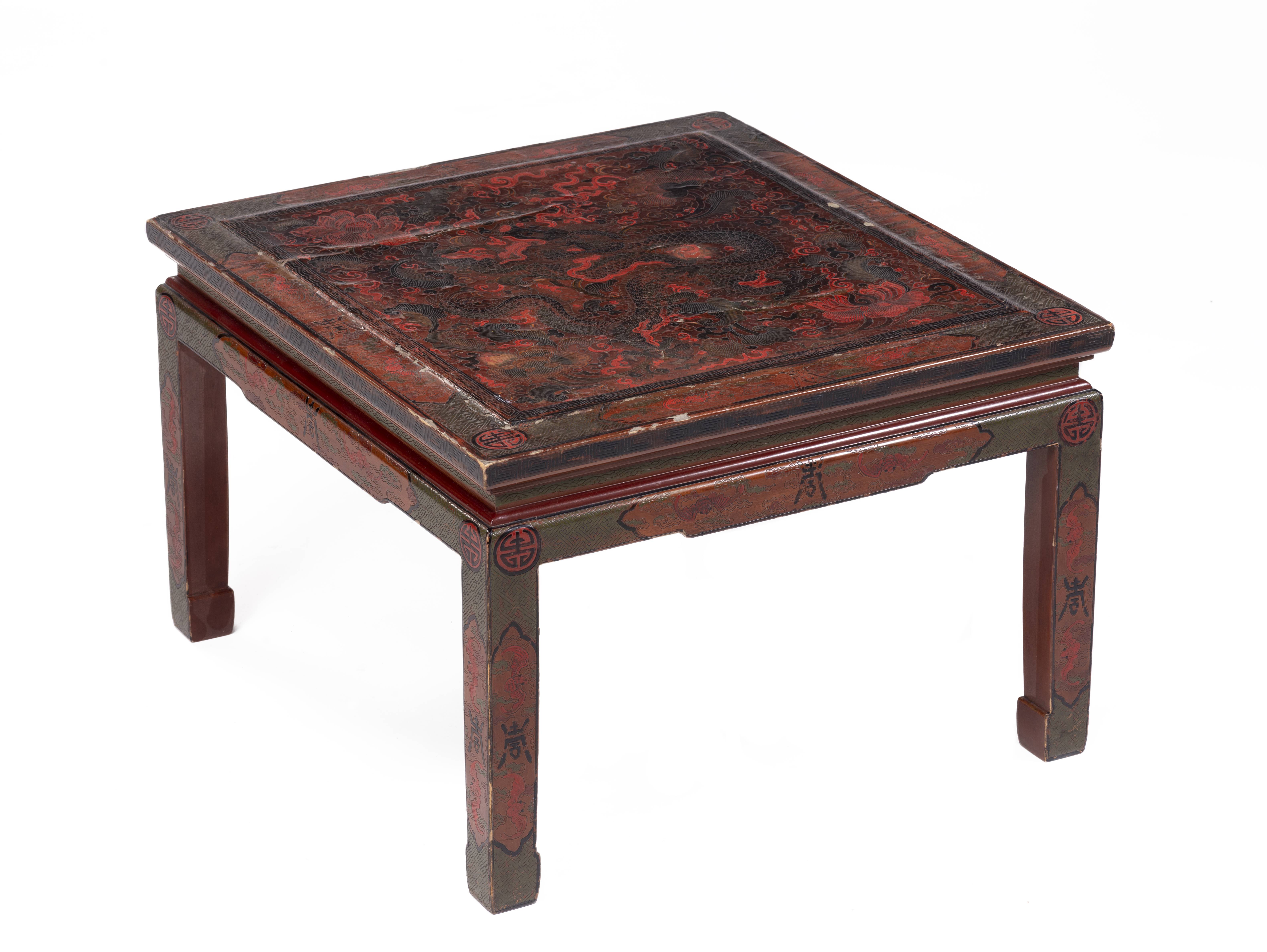 Table basse laquée chinoise à plateau à décor de dragons, lotus, caractères Shou et chauve-souris.