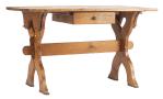 Table d'alpage rustique en sapin à pieds en croix et entretoise assemblée à tenons, 1 tiroir dans le bandeau.
