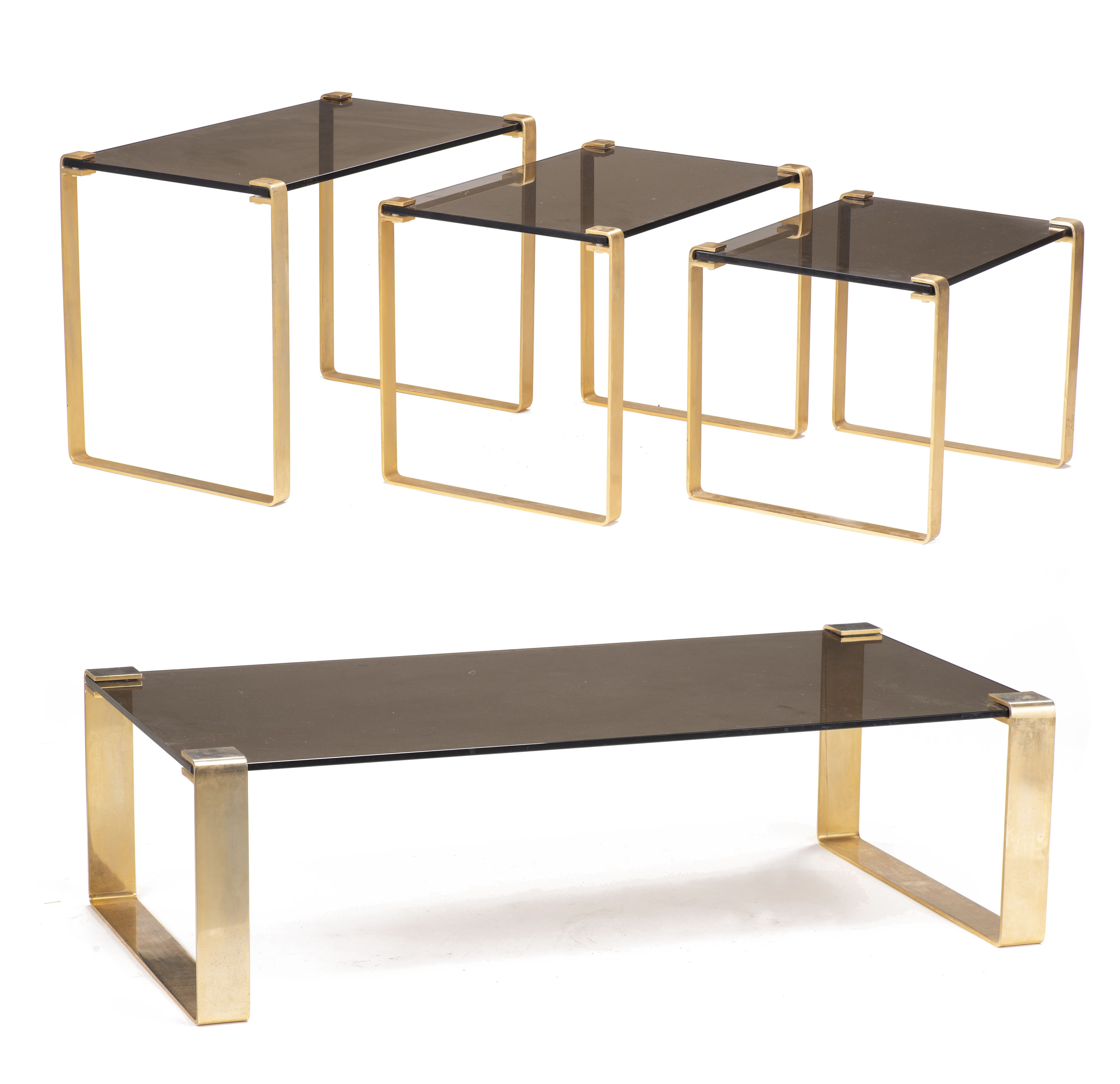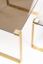 Table en verre et laiton avec trois tables gigognes en suite. Vers 1970