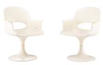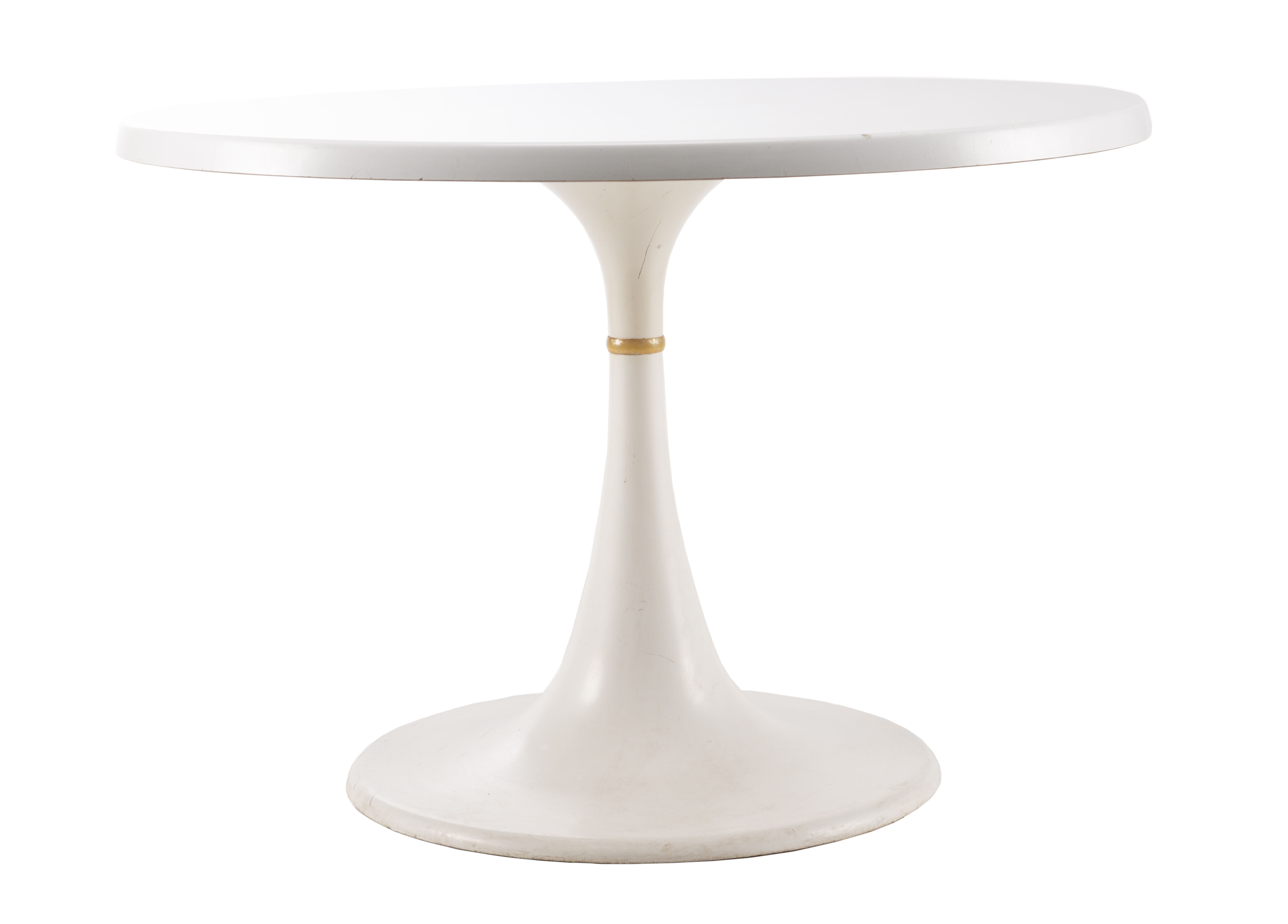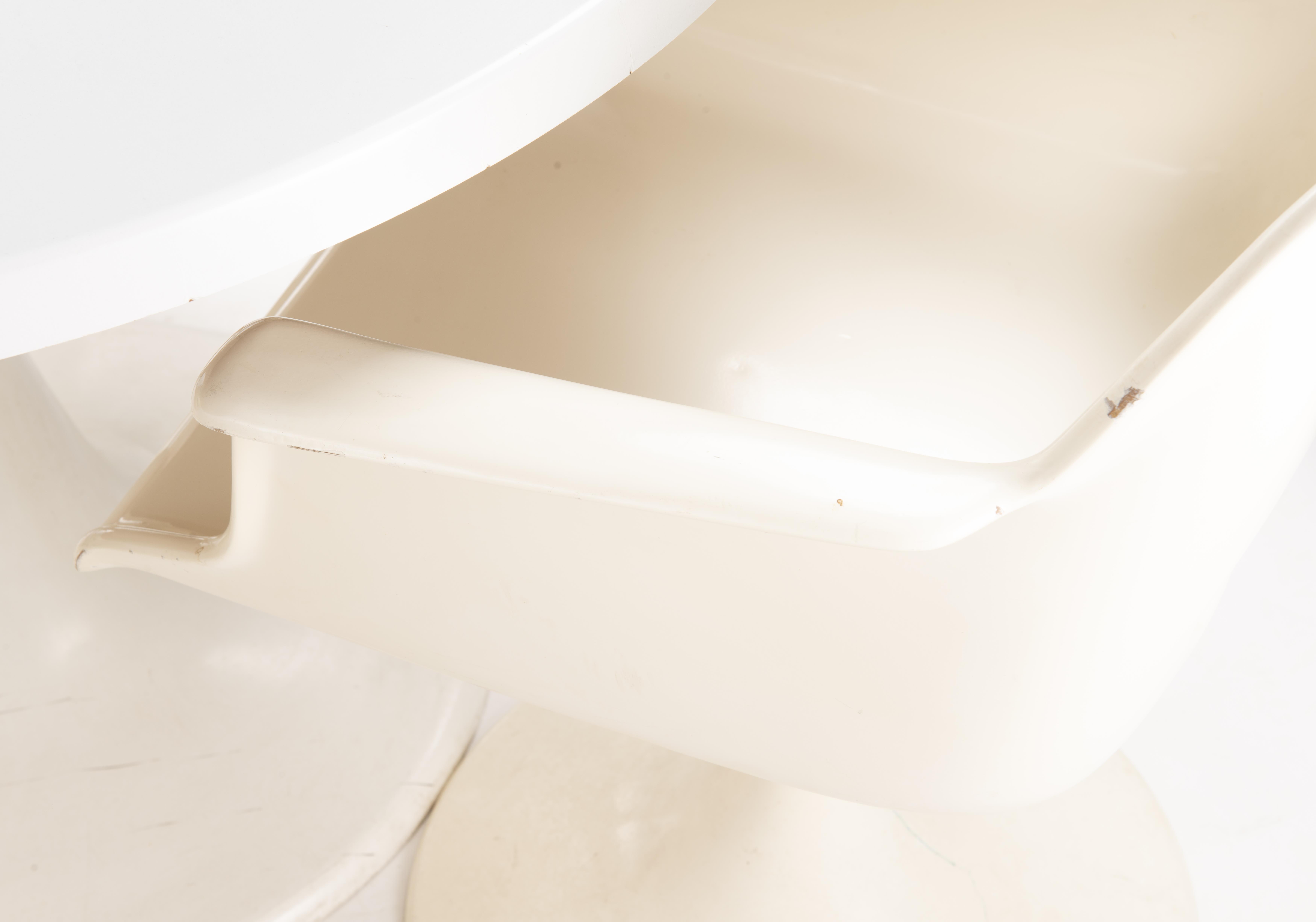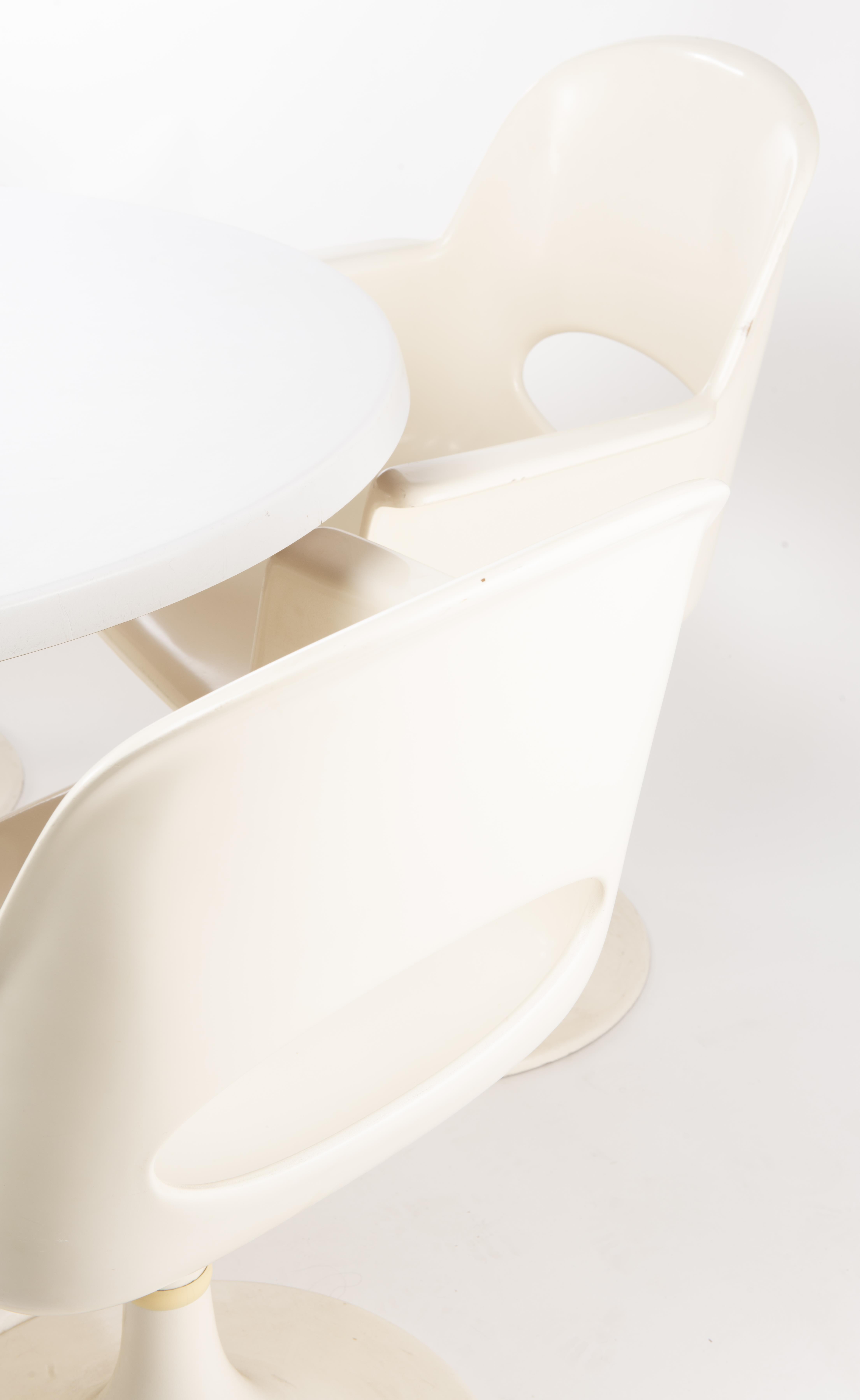 Table tulipe ronde, pied en fibre de verre et plateau laqué blanc, avec ses quatre fauteuils en suite. Modèle de style Eero Saarinen. Années 60.