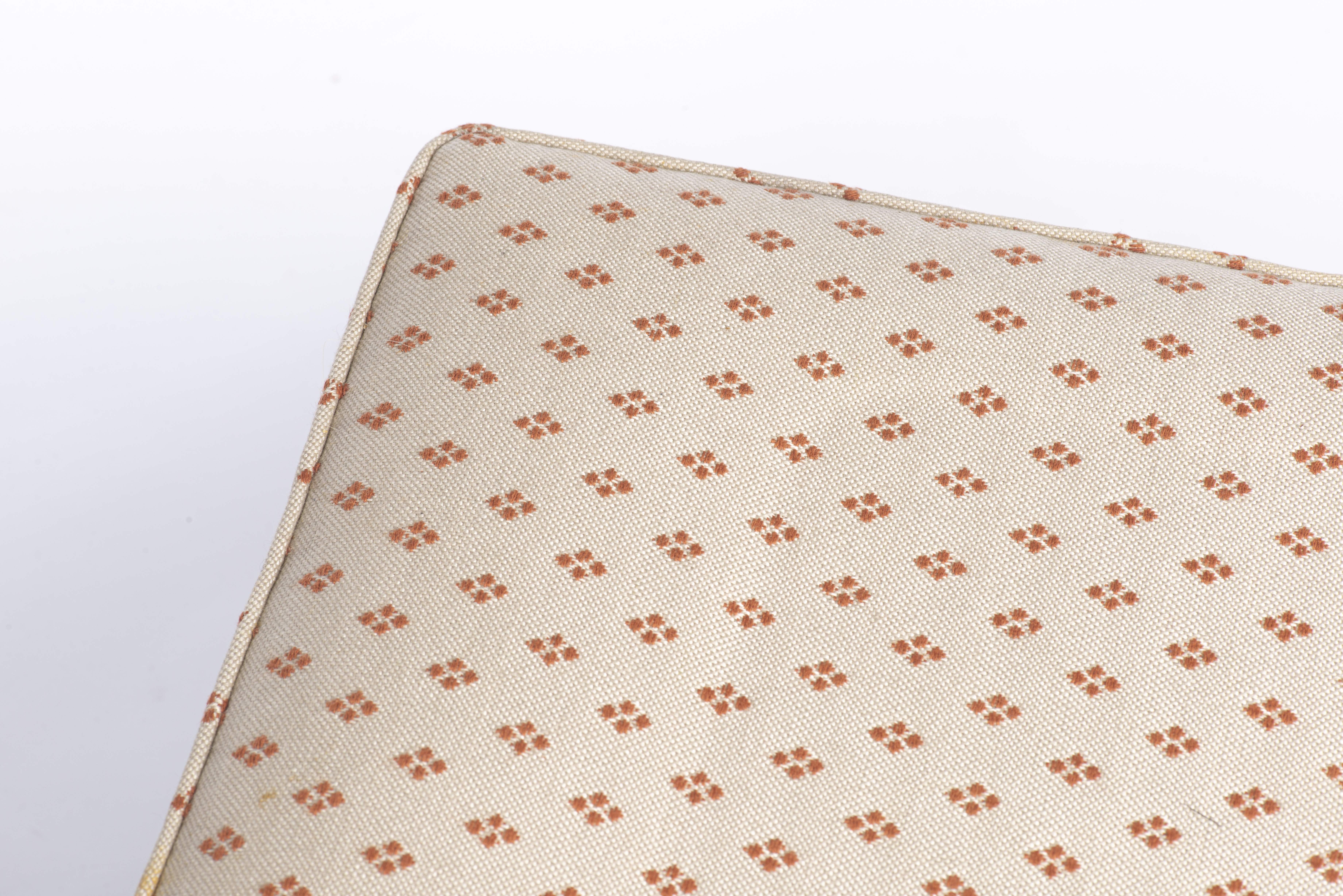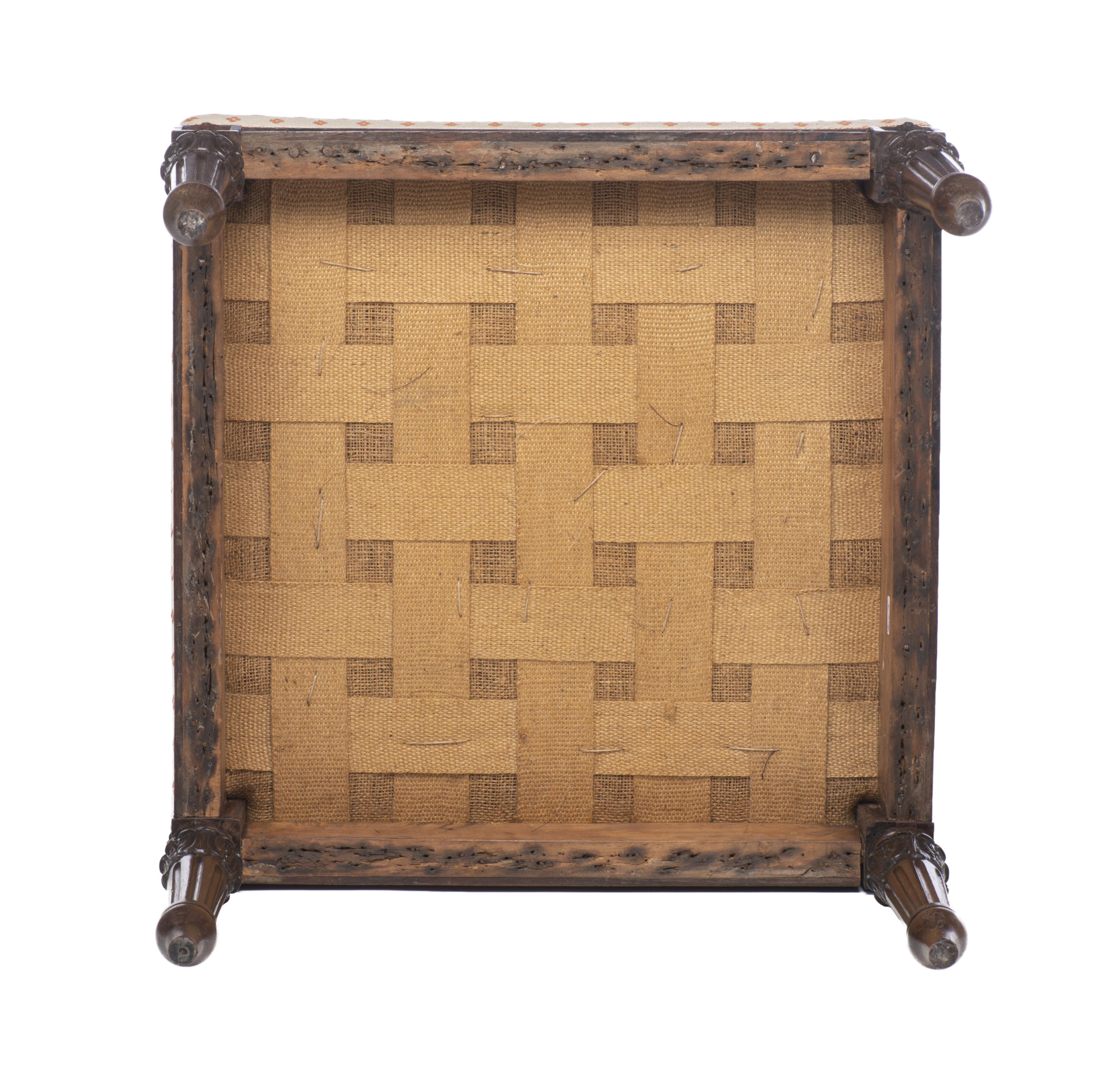 Tabouret carré Louis XVI en acajou et placage d'acajou recouvert d'une tapisserie à décor de points en losange lie de vin sur champ beige.