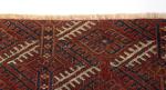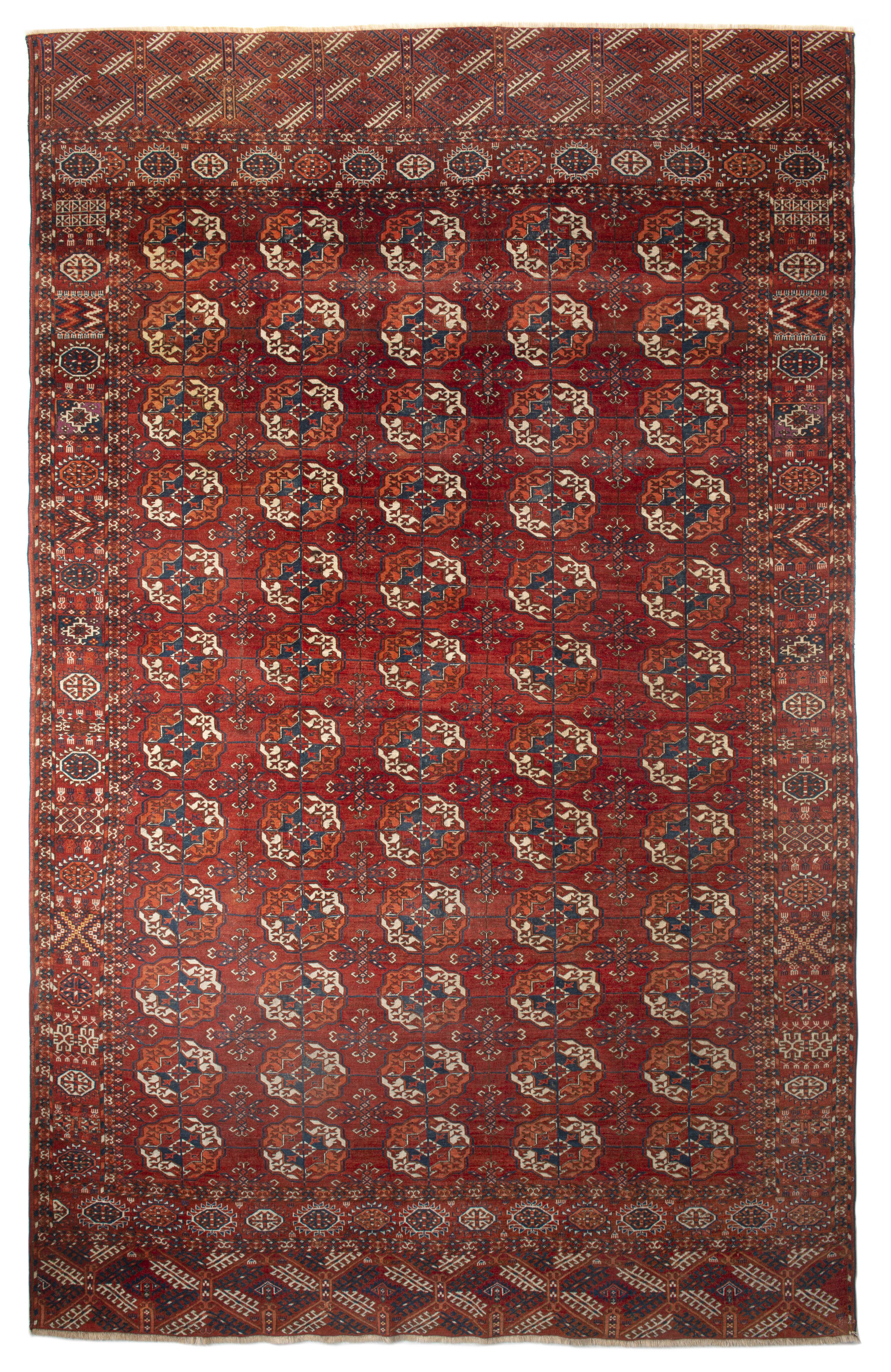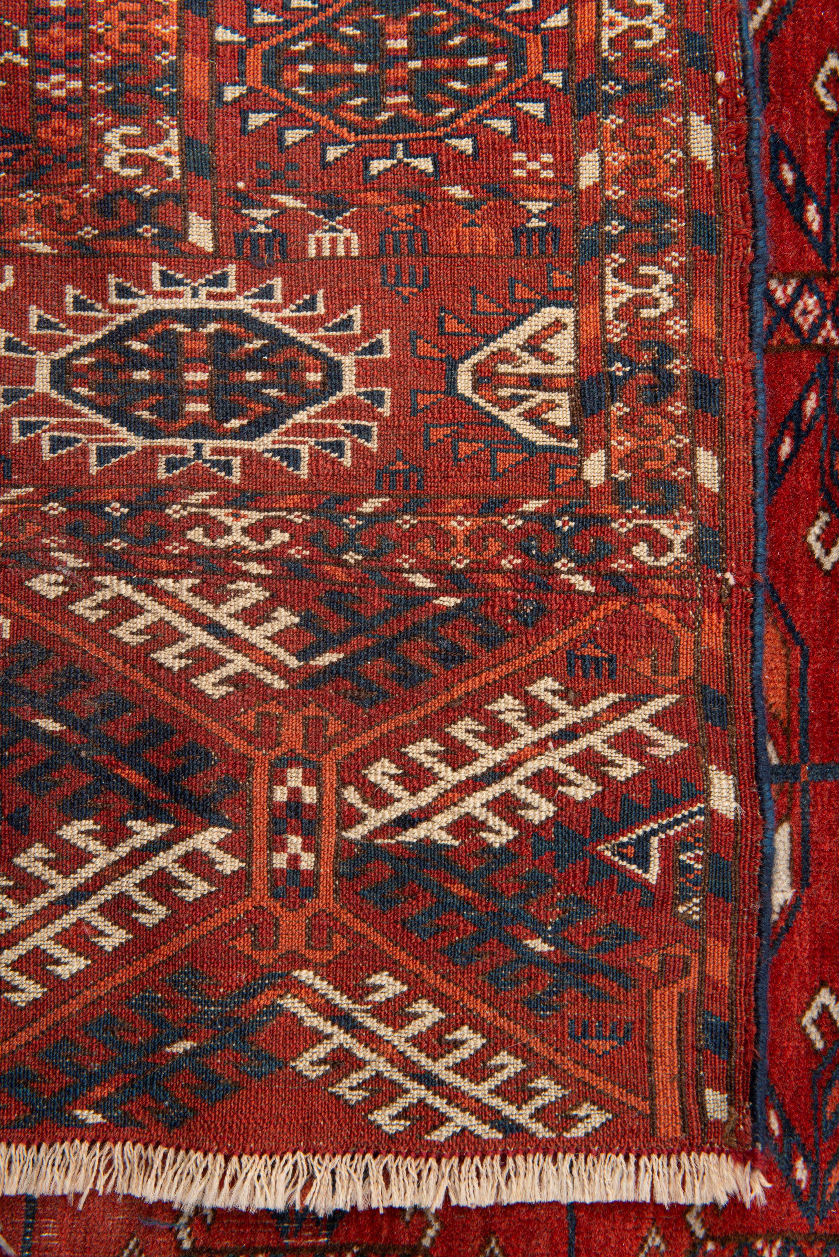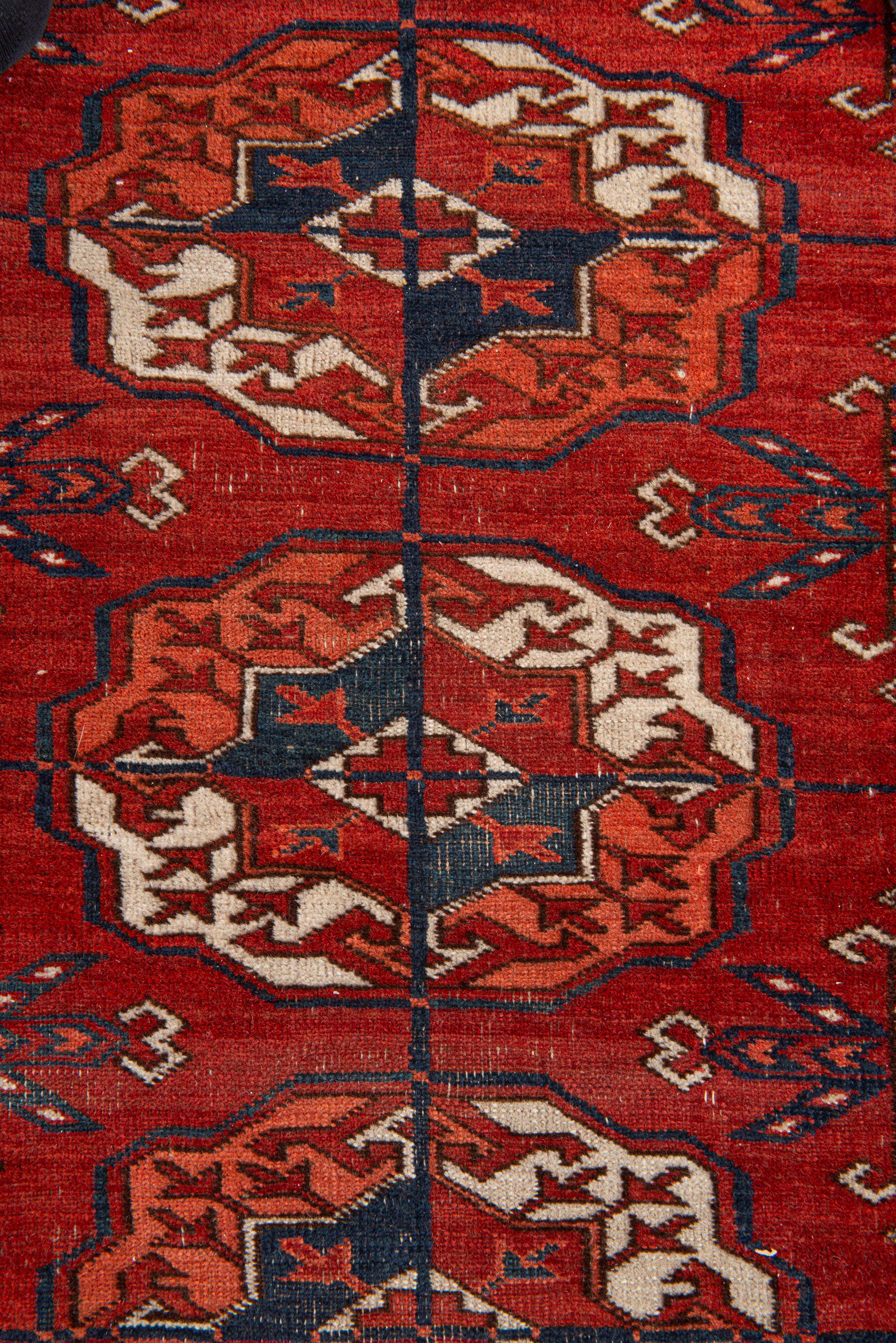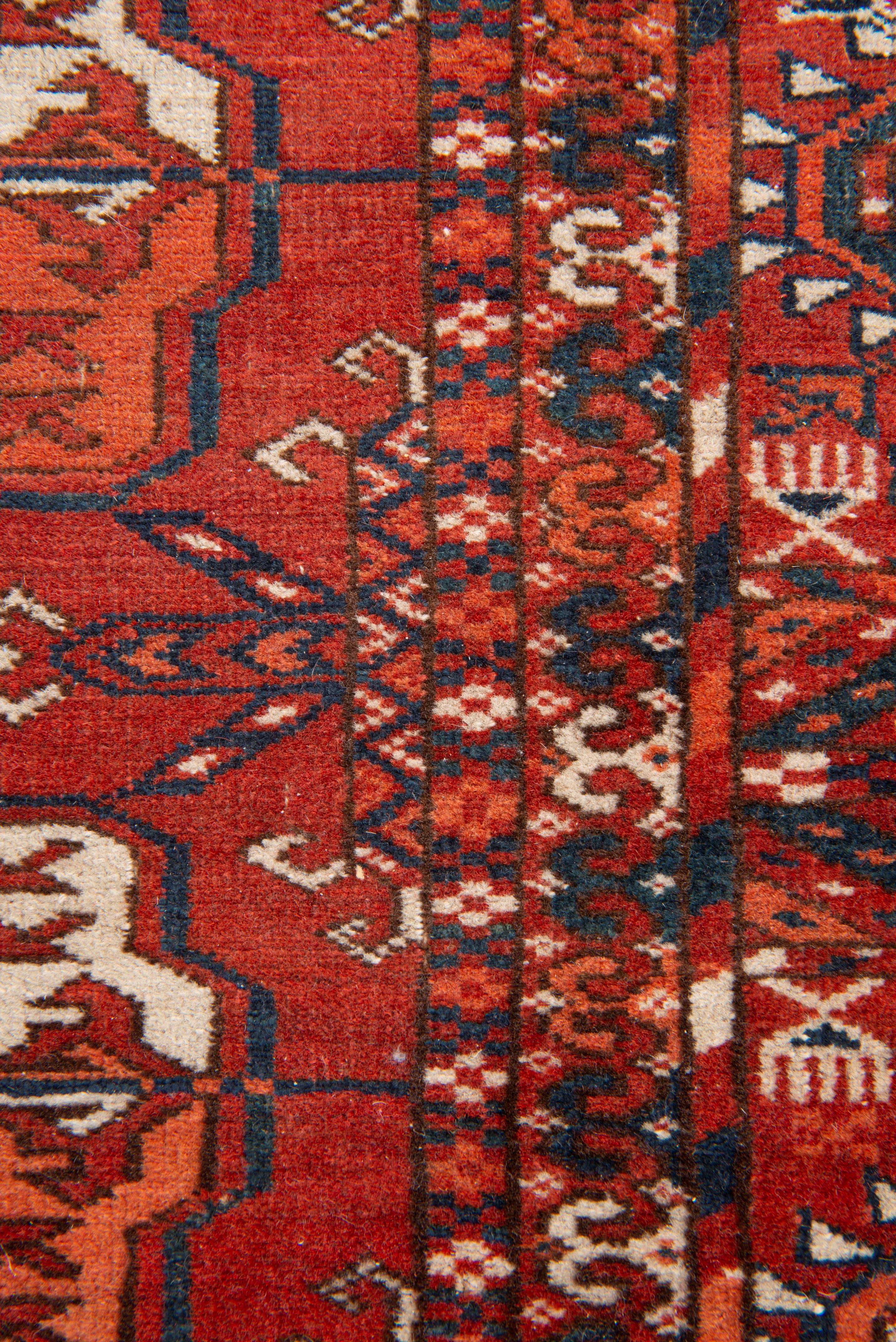 Tapis Boukhara ancien à guls noir, oranges et blanc sur champ rouge à bordure principale à motifs de peignes à vue