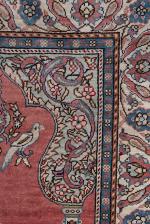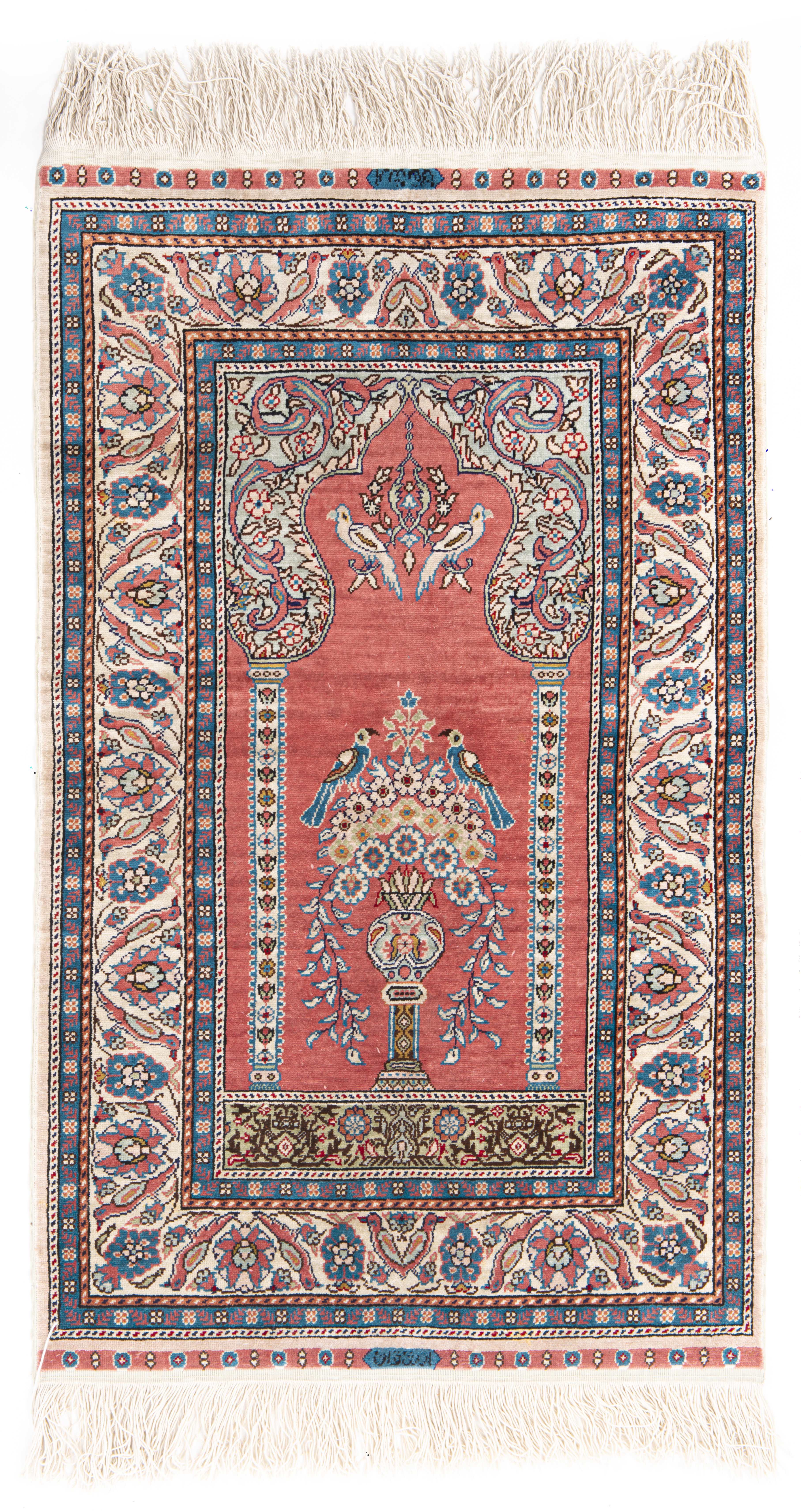 Tapis de prière en soie à décor central d'un mirhab à vase fleuri avec oiseaux et une lampe à perchoir à oiseaux sur champ rouge, bordure principale d'une frise de lotus sur champ beige. Signé dans cartouche en noir sur fond bleu vers les franges.