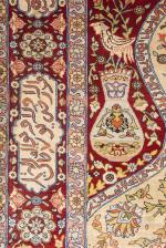 Tapis de prière persan Hereke en soie et fil de métal à décor d'un mihrab à écoinçon de vases fleuris avec oiseaux sur champ rouge, décor principal à rinceaux de lotus sur champ caramel, médaillon dans la partie haute du tapis à inscription sur champ noué de fil métallique or, bordure principale à 6 médaillons de calligraphies en rouge sur champ ocre et rinceaux de lotus sur champ rouge, le tapis est signé en haut à droite au revers
