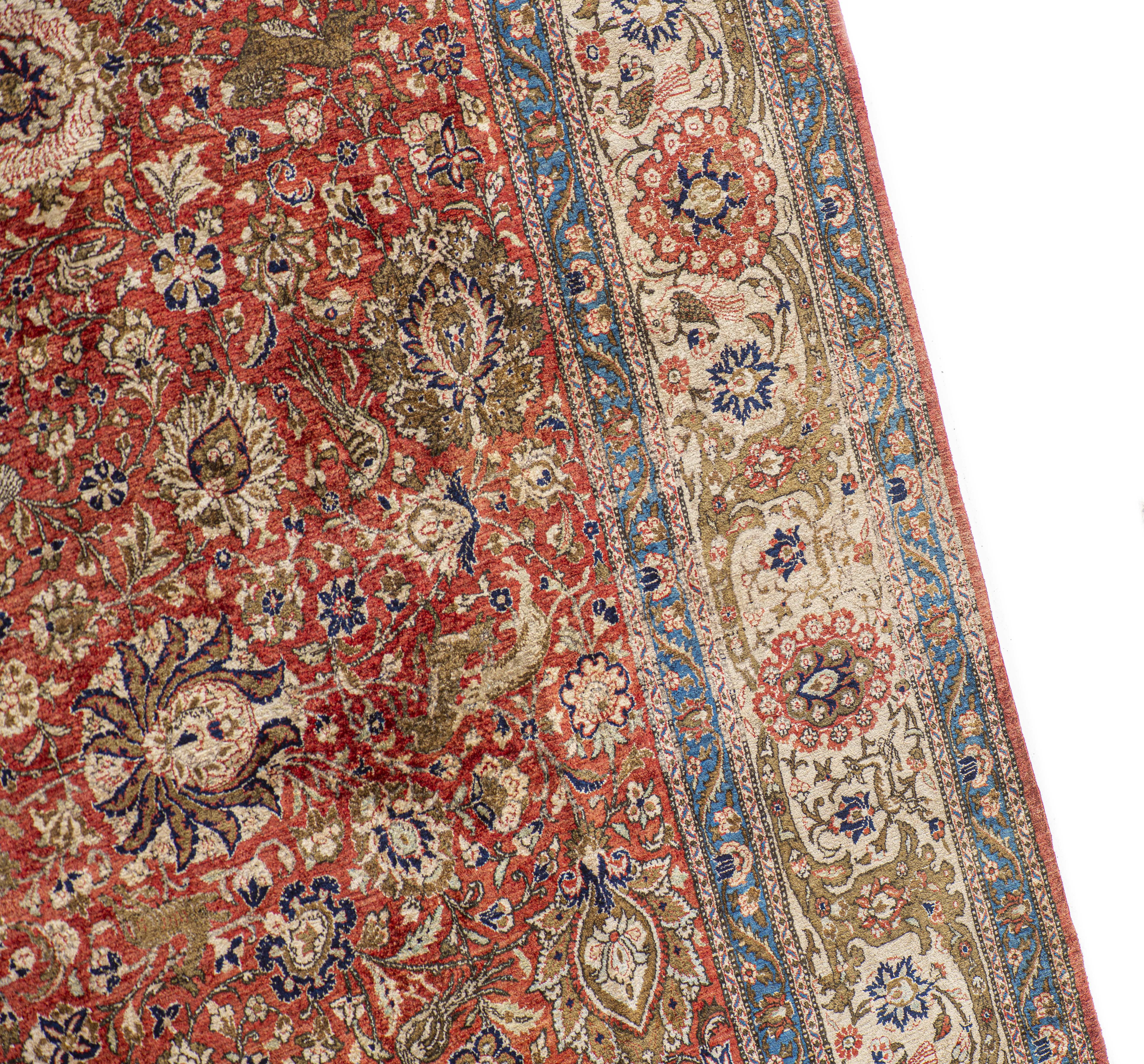 Tapis Ghoom en laine et soie à motif central hérati aux oiseaux et banderoles de nuages sur champ pricipal rouge parsemé d'arabesques et d'animaux dont des gazelles, des lions, et des oiseaux, bordure principale composée de médaillons rouges reliés par des bandeaux et entourés d'oiseaux et de gazelles, bordures secondaires à décor de fleurs et feuilles sur fond bleu, réalisé en nœud persan.