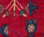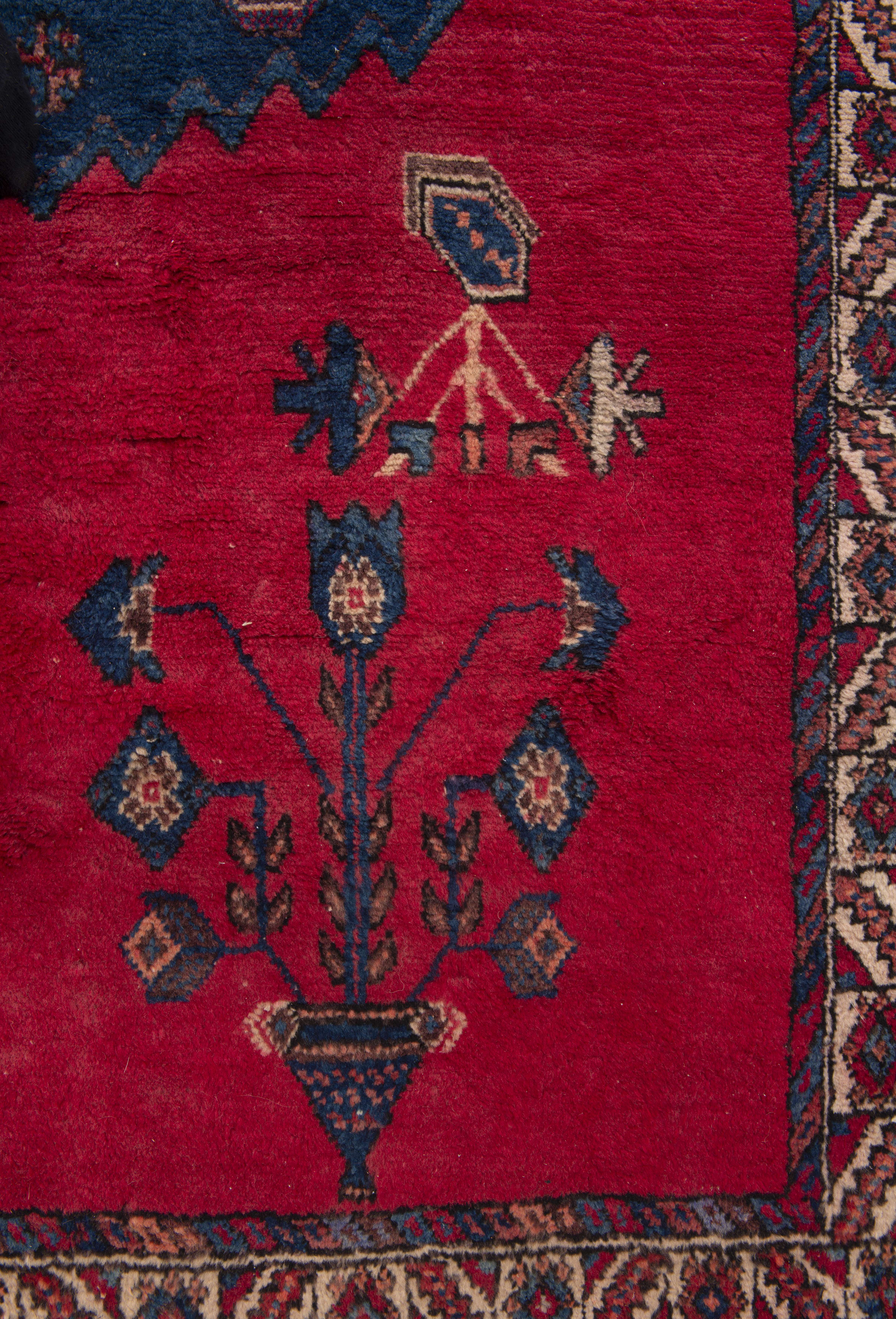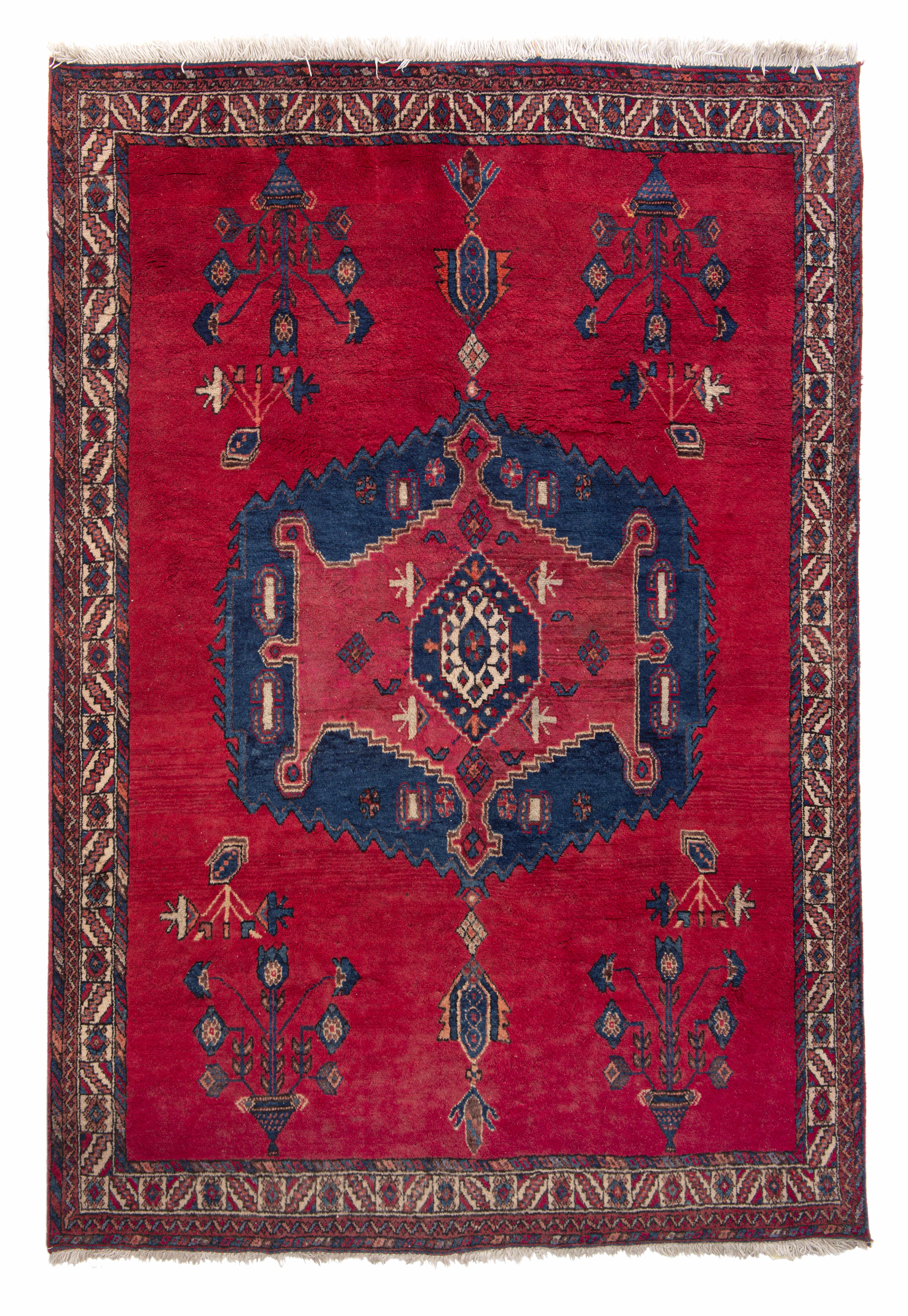 Tapis Sarough Iran à médaillon central couronné et champ principal rouge à décor de 4 vases, bordure principale à frise de fleurs et motif géométrique de raies en caissons. Laine à trame de coton. Ancien.