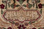 Tapis turc Hereke de prière en soie et trame de soie avec médaillon central à verset sur champ de fils métalliques, champ principal beige à décor d'encorbellements de fleurs, mirhab à décor de nœuds de nuages sur champ gris, bordure principale à frise de lotus sur champ brun et 3 médaillons latéraux et supérieur de versets du coran sur champ vert foncé.