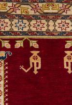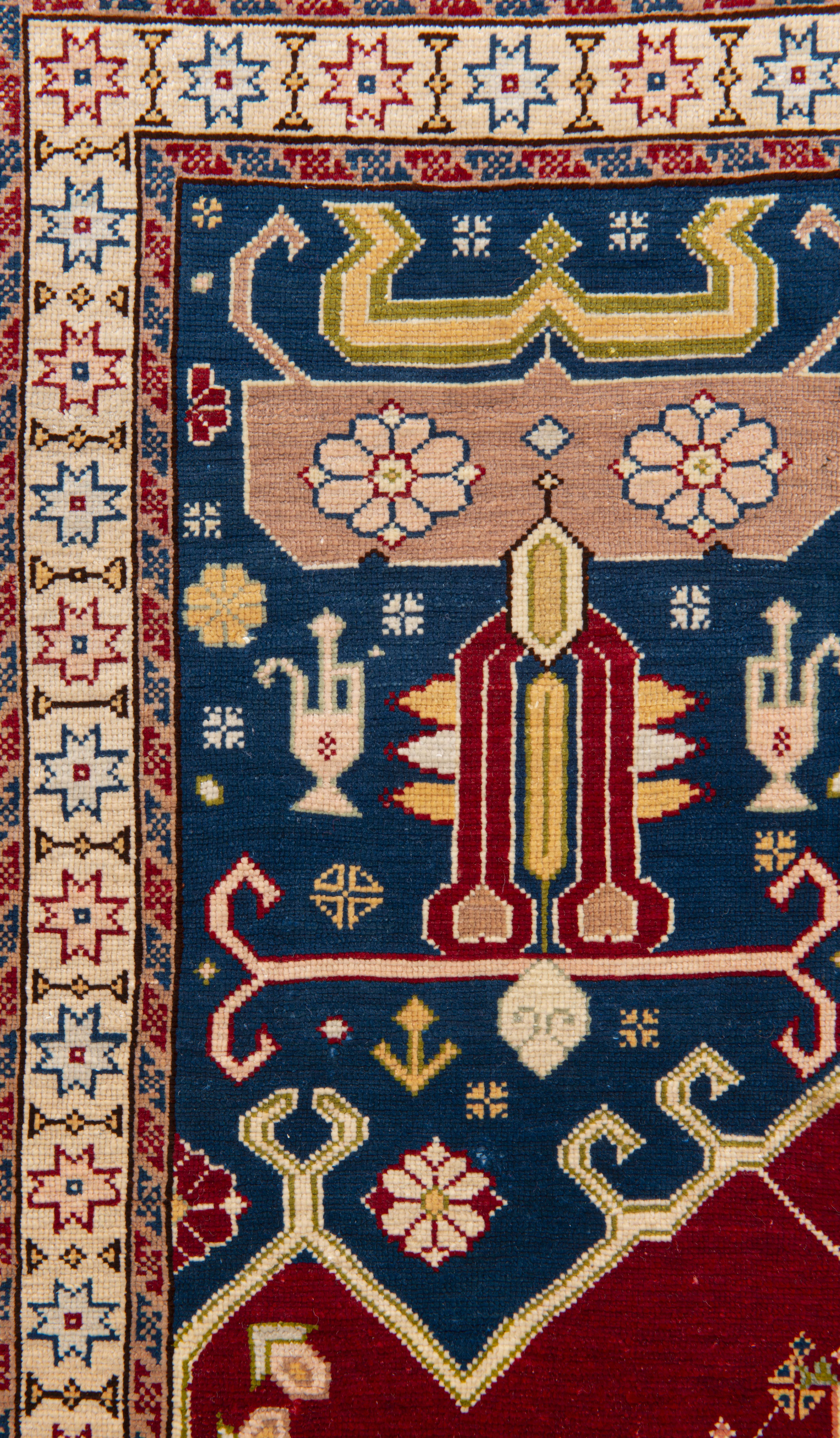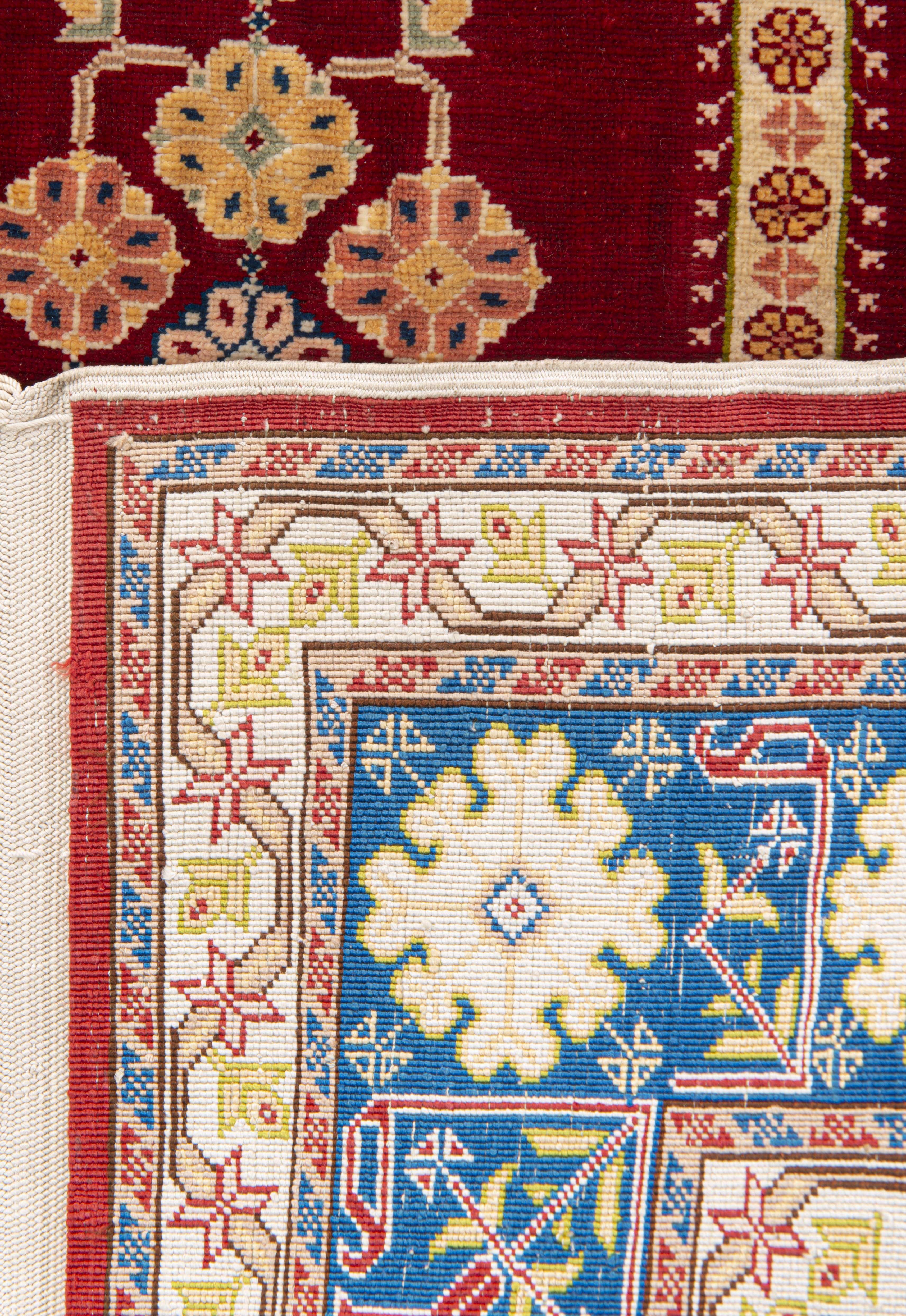 Tapis turc Hereke de prière en soie à trame de soie avec lampe fleurie sur champ principal rouge deux colonnes fleuries surmontées d'une verseuse, mirhab à champ bleu avec décor géométrique, verseuses et fleurs, bordure principale à frise florale sur champ bleu.