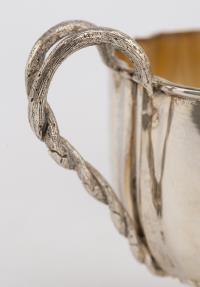 Tasse à chocolat et sous-tasse en argent français 1er titre avec intérieur vermeil et anse à décor faux bois tressé avec feuilles, style baroque
