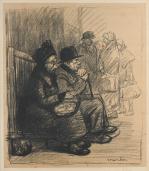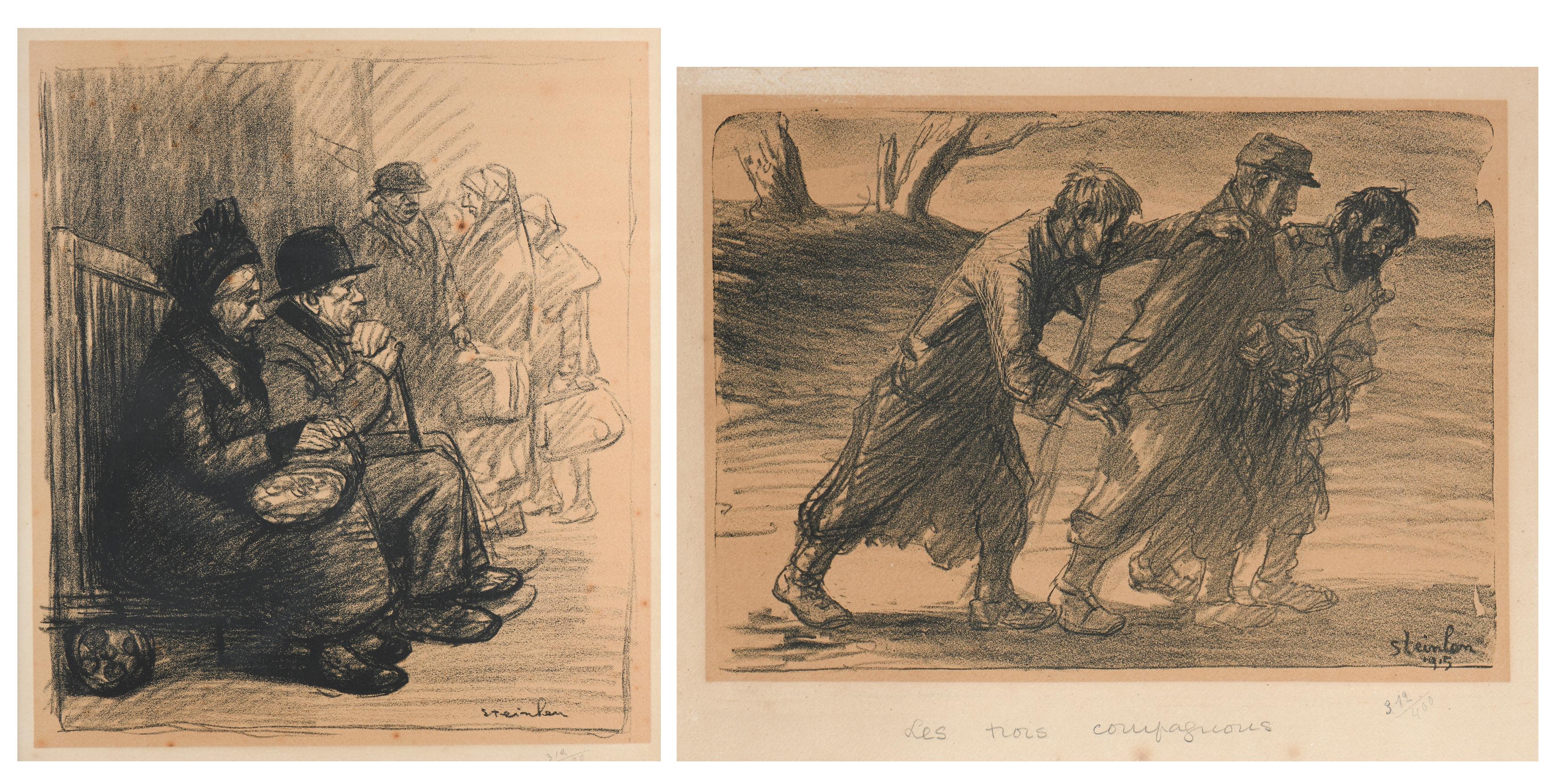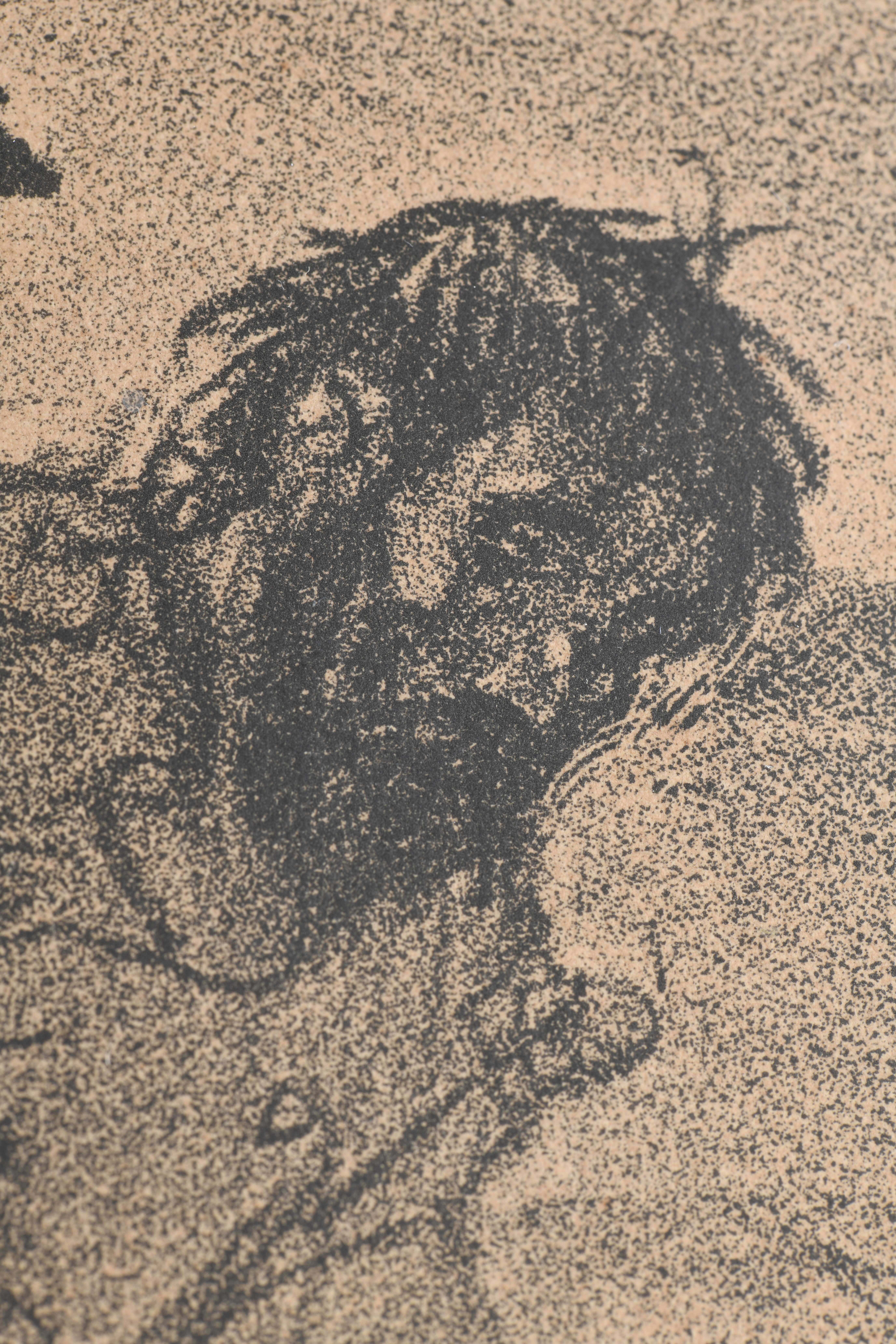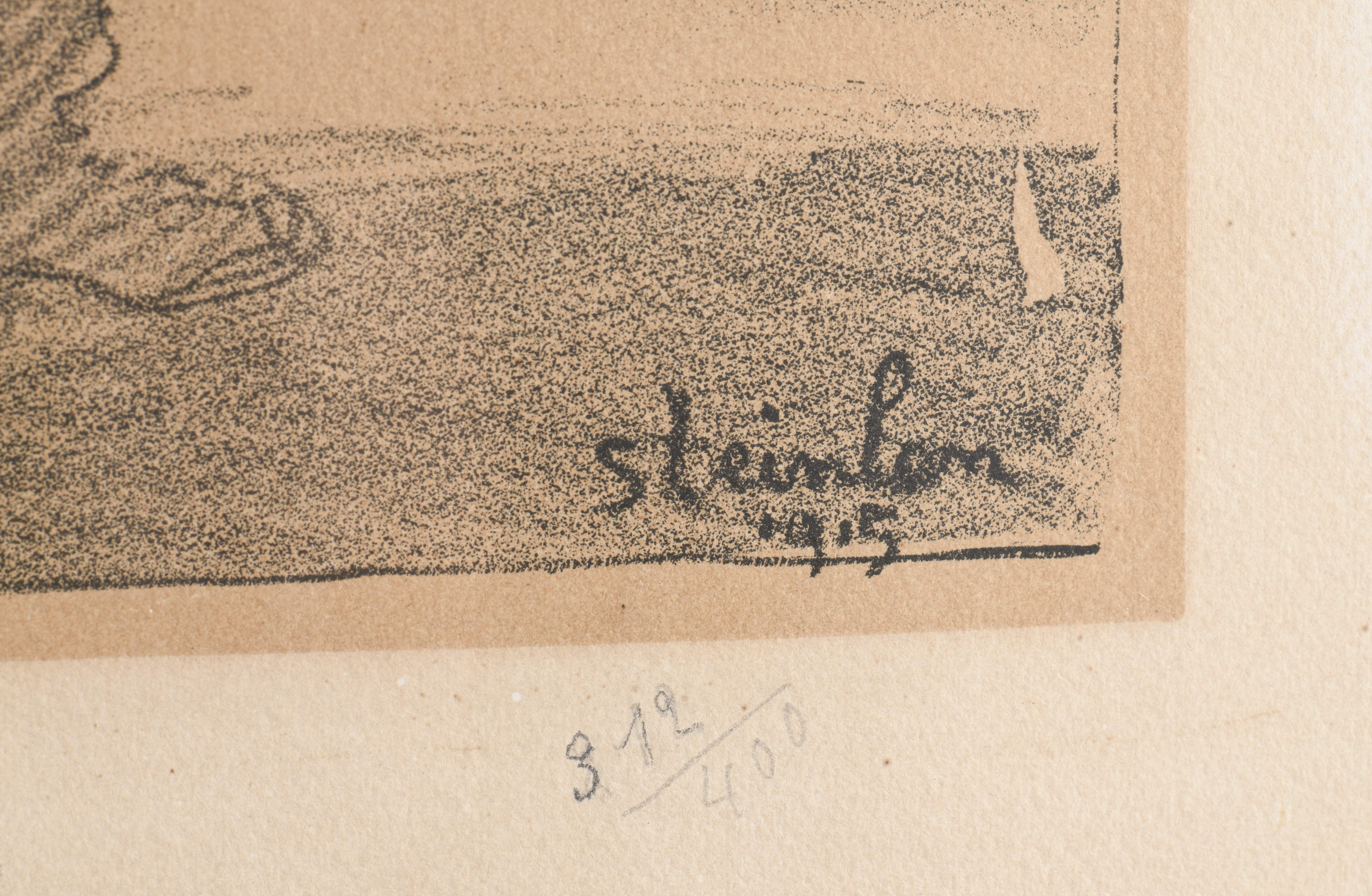 Théophile Alexandre Steinlen (français, né en Suisse, 1859-1923) était un illustrateur, graveur, peintre et sculpteur. Il est né à Lausanne et a étudié à l'Université de Lausanne, il a ensuite travaillé comme apprenti dessinateur dans une usine de textile avant de s'installer en 1881 à Paris dans le quartier de Montmartre. En 1883, il est devenu membre du cercle artistique, littéraire et musical et fréquente le cabaret du Chat Noir où il rencontre, entre autres, Henri de Toulouse-Lautrec, Emile Zola et le chanteur et compositeur Aristide Bruant. Bien qu'il ait créé des affiches, des gravures, des peintures et des sculptures, Steinlen est surtout connu comme illustrateur. Il commence par contribuer aux illustrations de la revue publiée par le Chat Noir. Il est devenu le principal illustrateur du journal et des recueils de chansons publiés par Aristide Bruant, et a également créé de nombreuses couvertures et illustrations pour des partitions et des livres d'autres musiciens et écrivains des années 1890. Tout au long de sa carrière, le travail de Steinlen a été influencé par ses sympathies sociales et politiques pour les dépossédés et les hommes et femmes de la classe ouvrière de Montmartre, que l'on peut voir dans ses couvertures et illustrations pour des journaux socialistes tels que: Gil Blas illustré, Feuille et L' Assiette au beurre. Pendant la Première Guerre mondiale, Steinlen a également créé des lithographies et des gravures représentant les tragédies et les épreuves de la guerre.