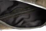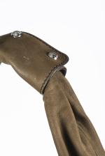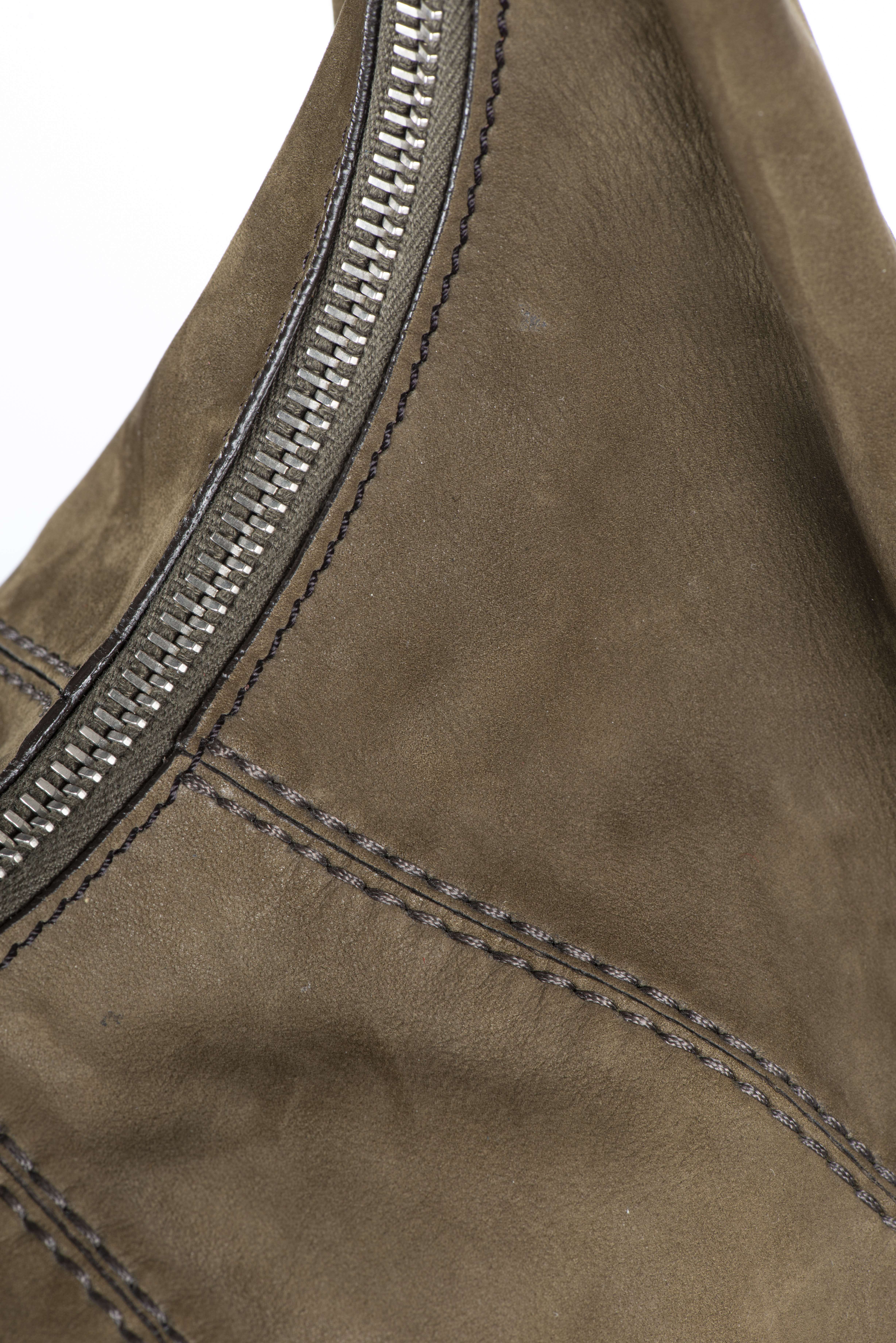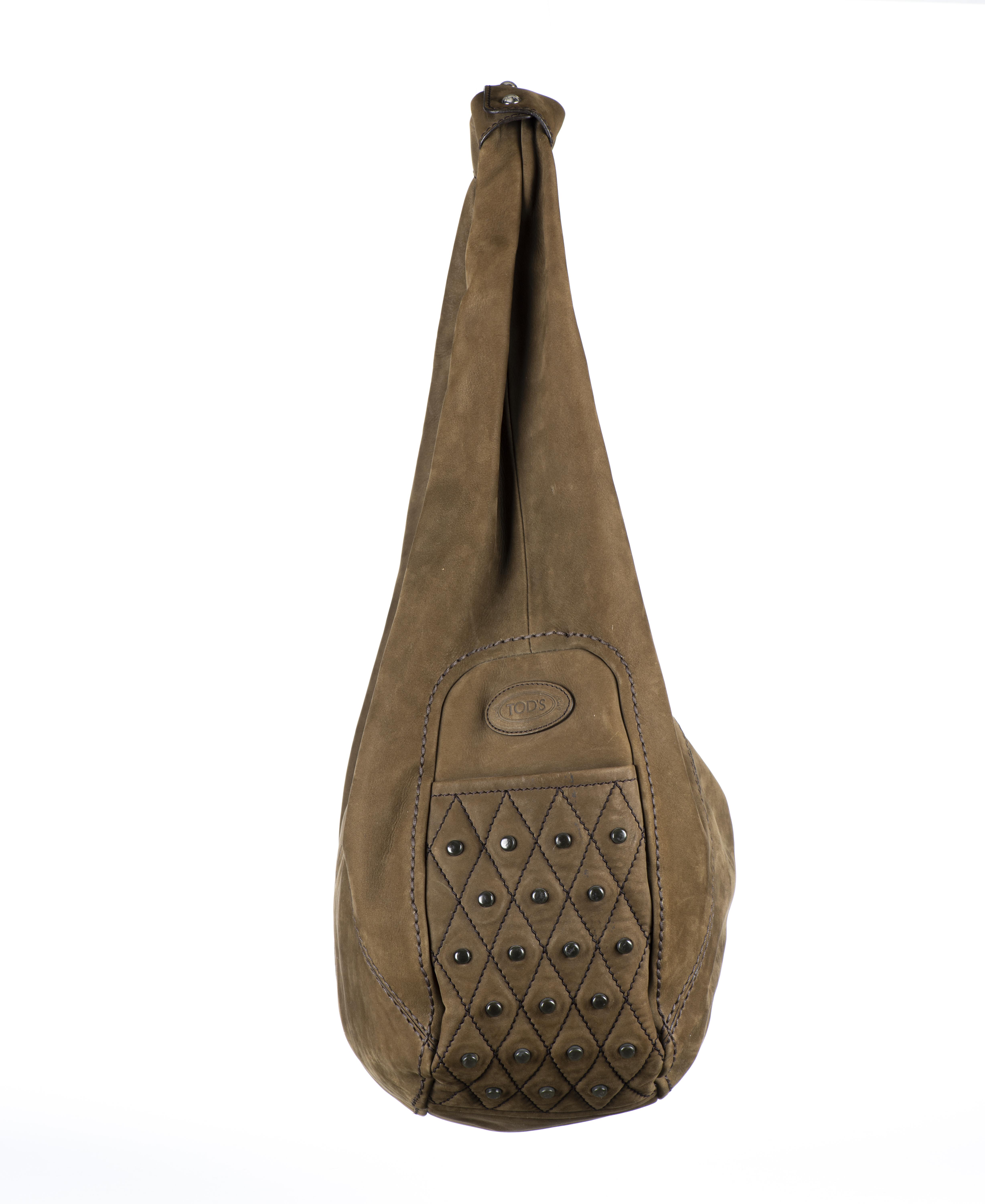 TOD'S, sac cabas en daim kaki à surpiqûres vertes, fermeture éclair, anse et poches extérieures cloutées.