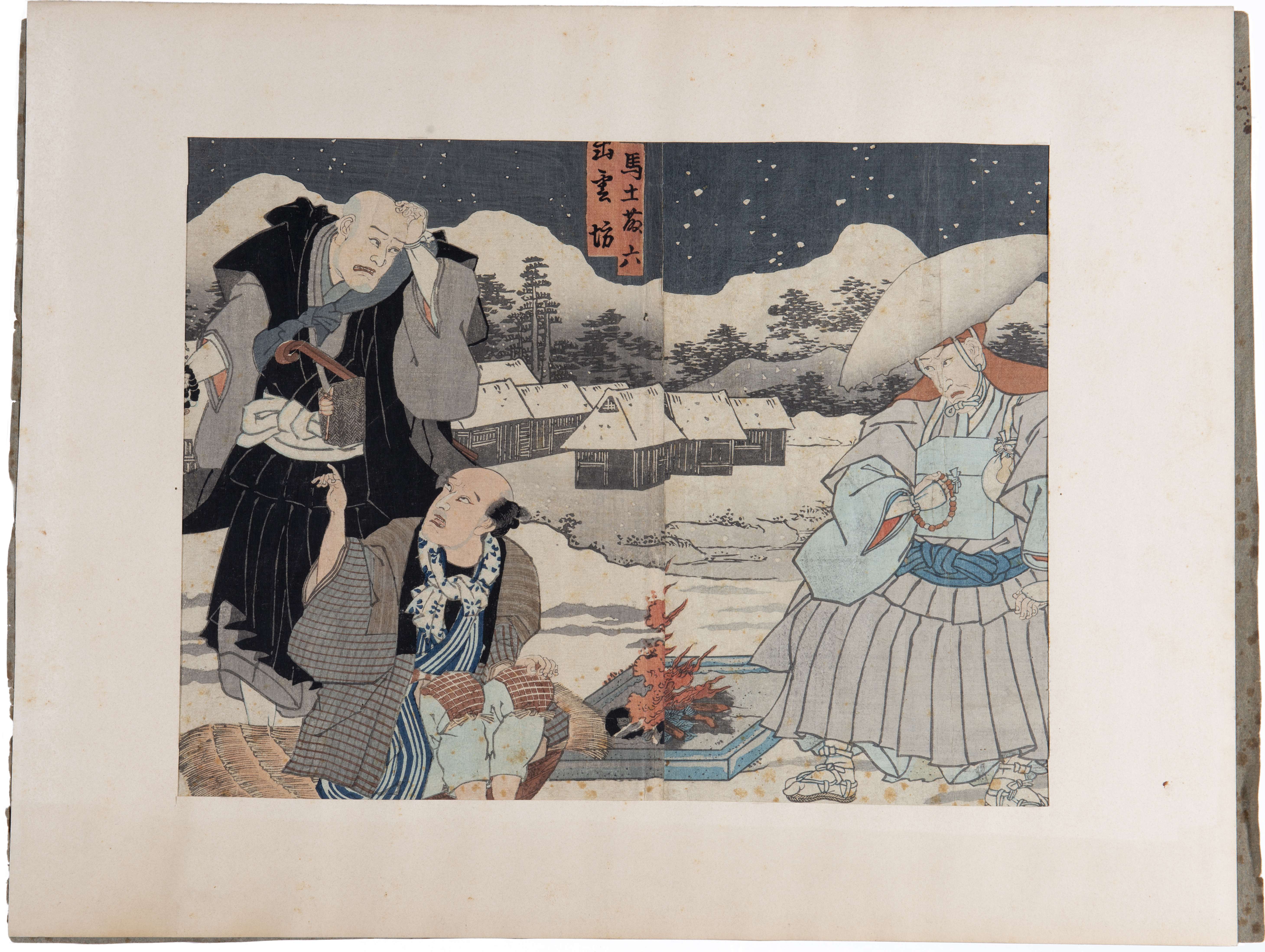 Toyokuni III "Discussion autour du feu". Deux feuilles double oban yoko-e avec cachets de censeur formant une estampe japonaise, datée 1858.
