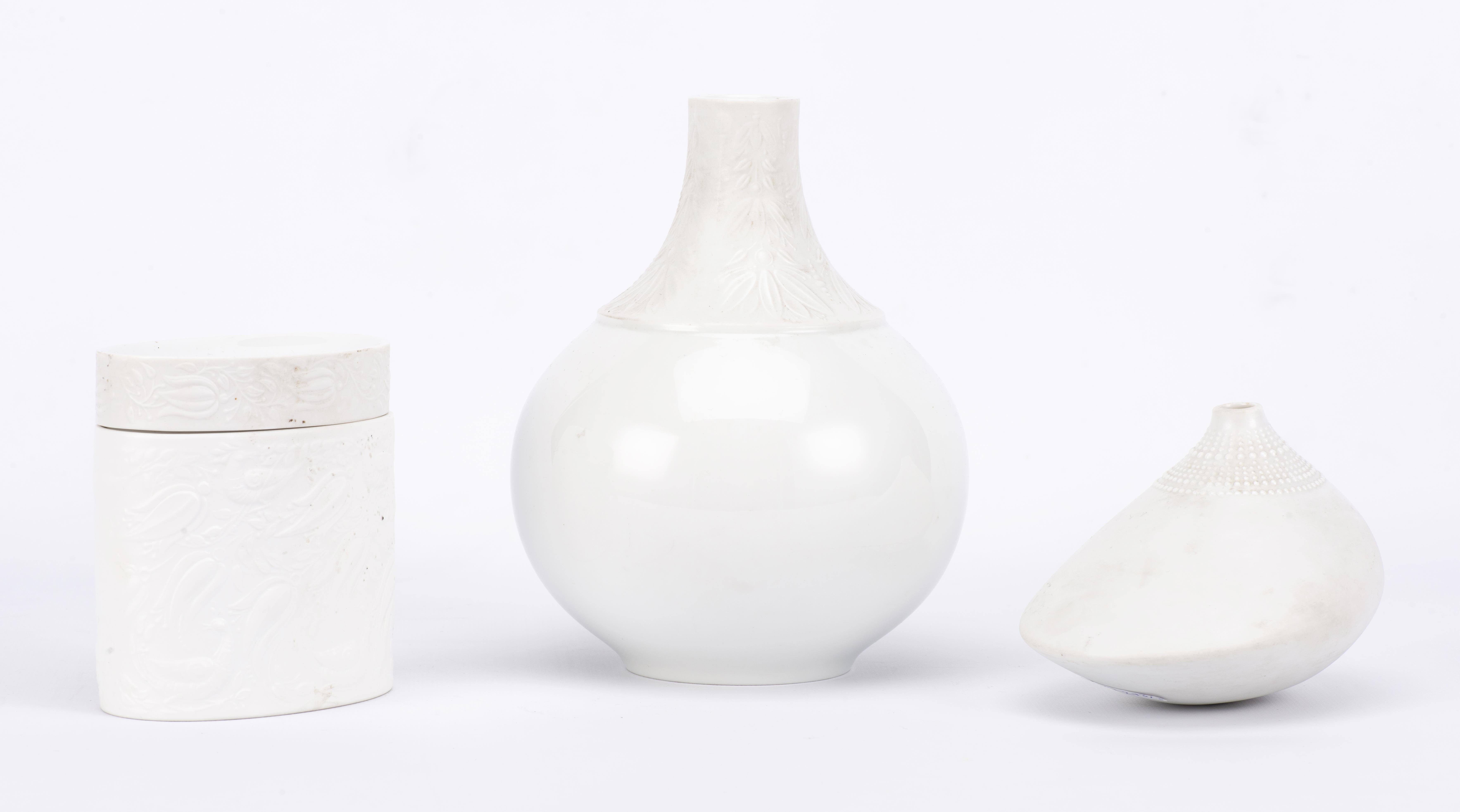 - un vase boule soliflore en porcelaine blanche par Björn Wiinblad, décor en relief de feuilles sur le col.