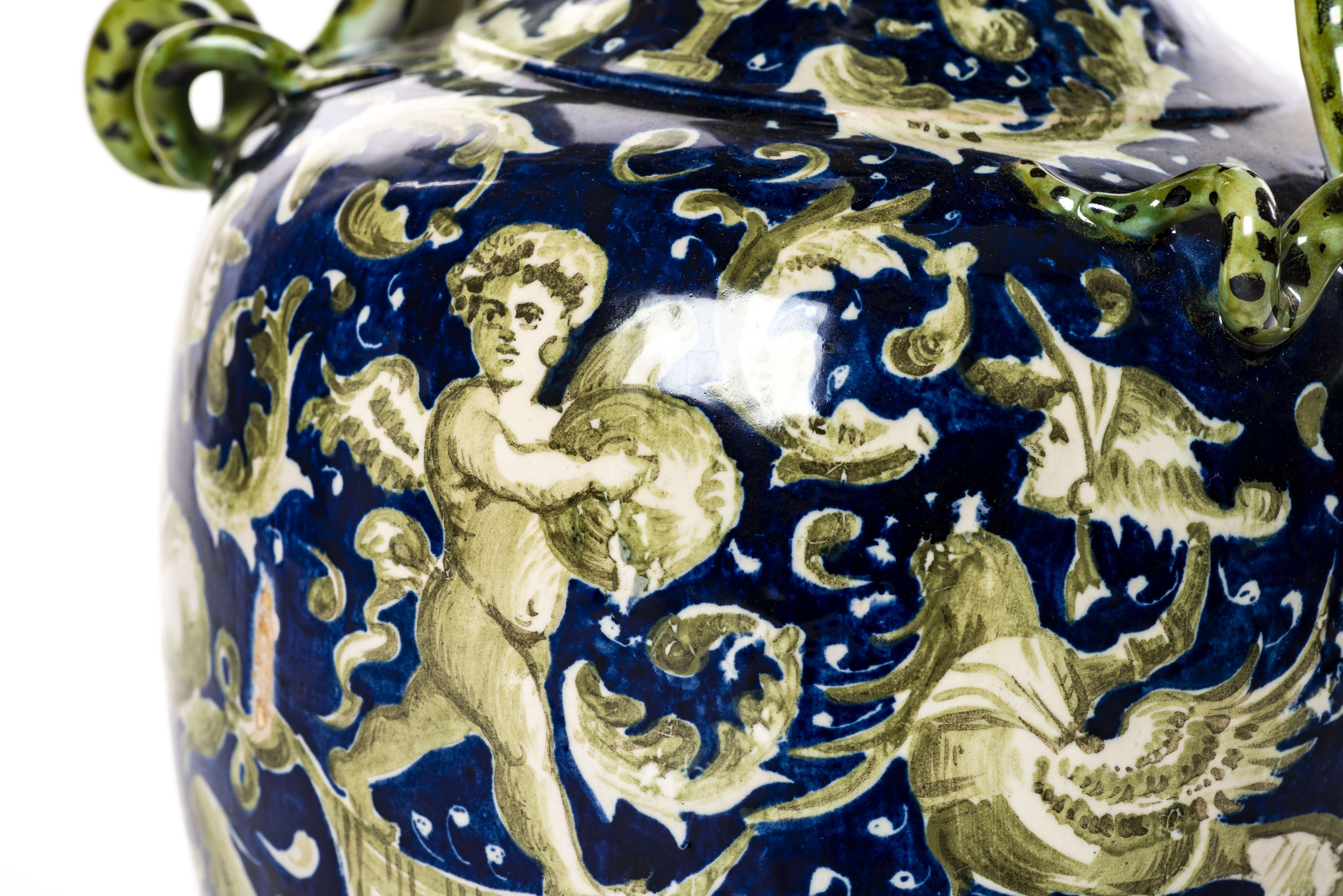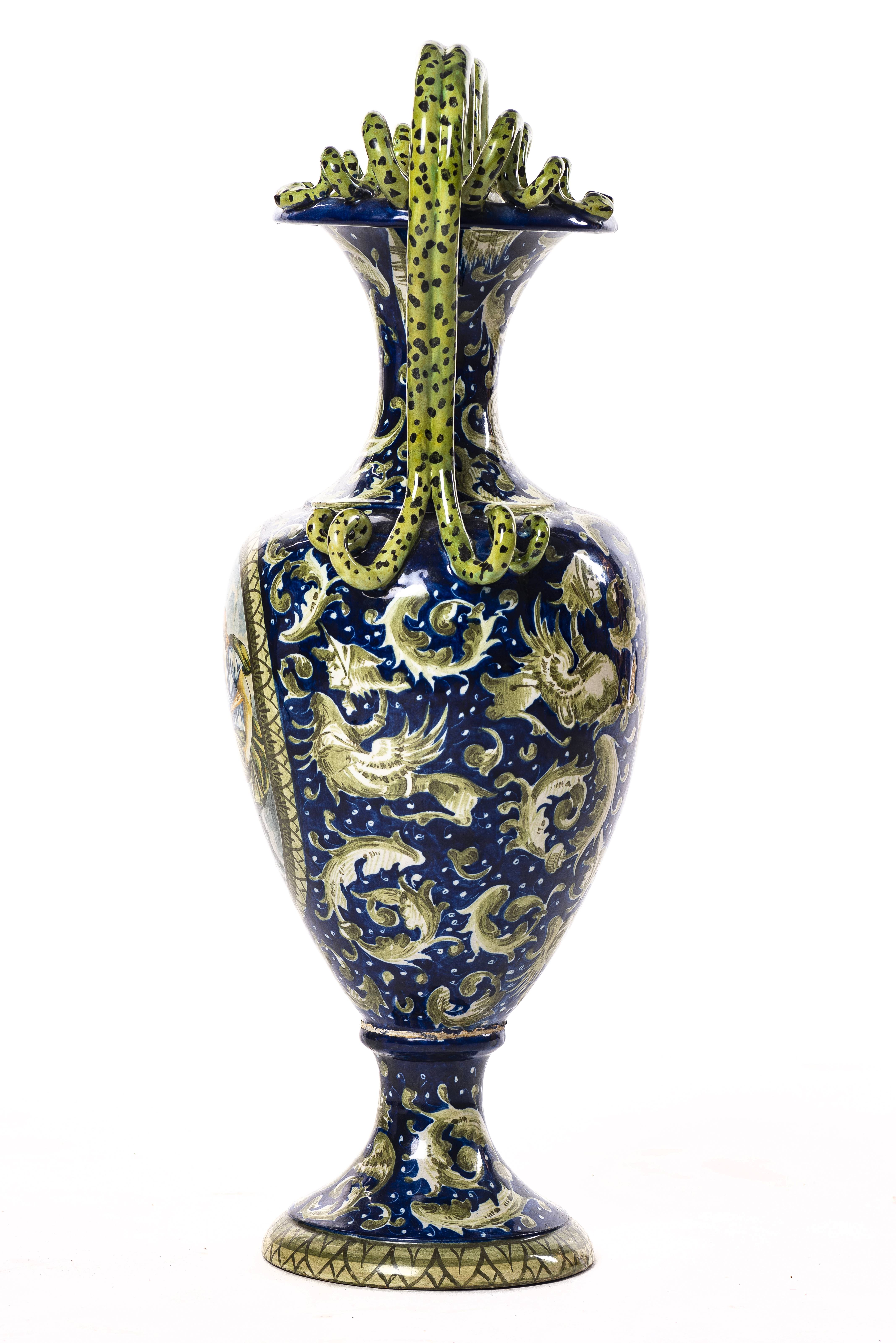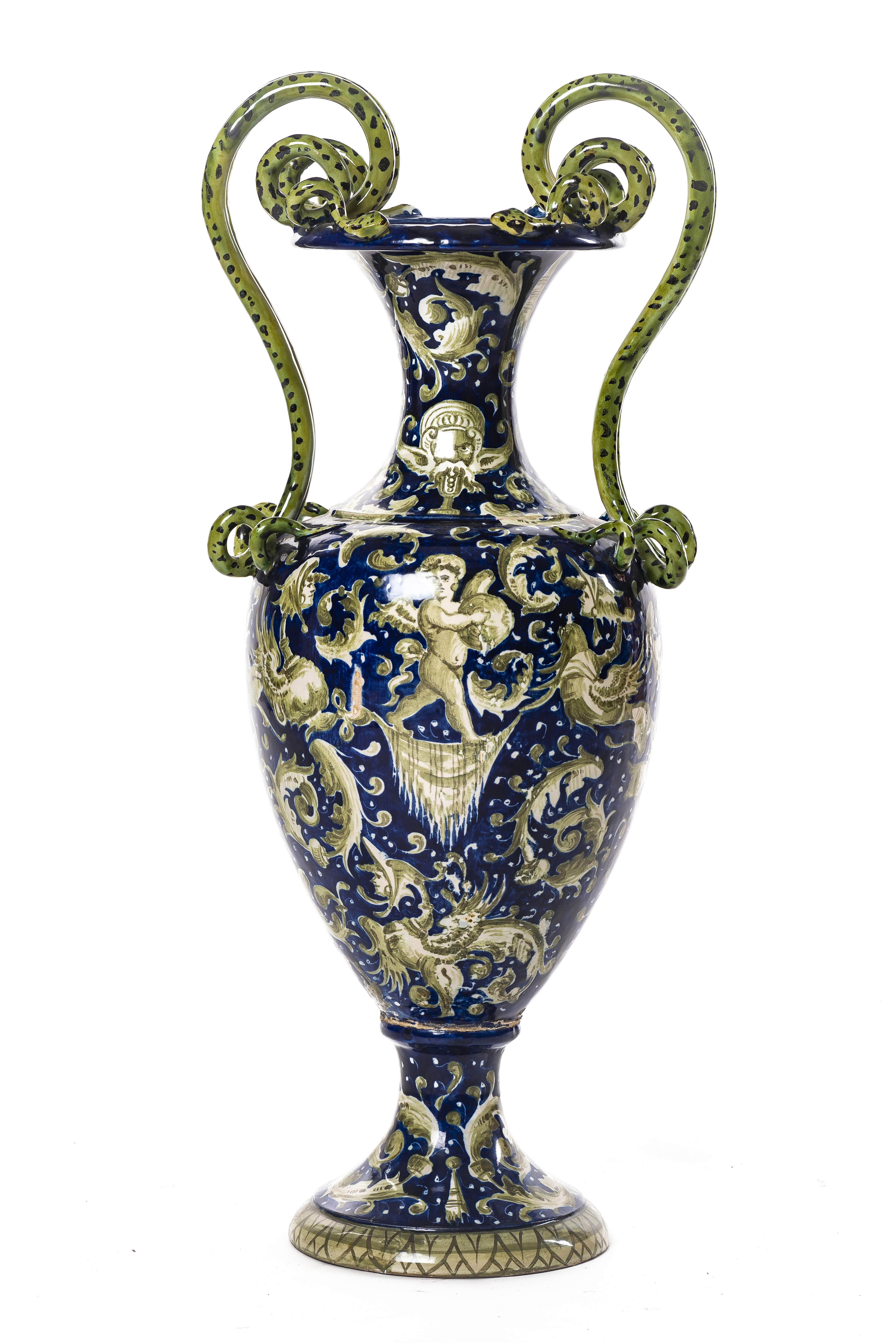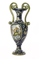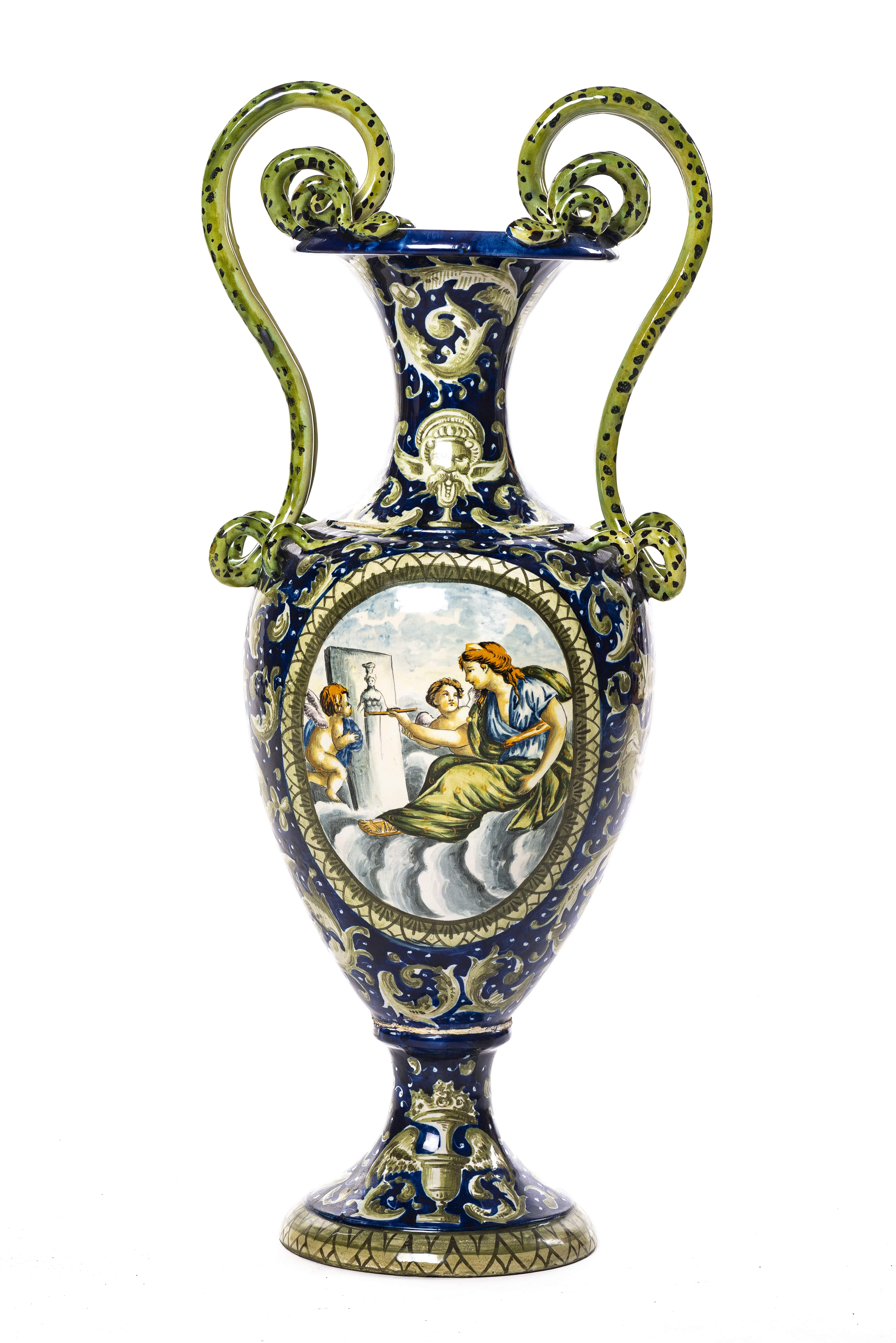 Vase balustre en majolique italienne à décor de grotesques et feuilles d'acanthe vertes sur fond bleu, un médaillon représentant une peintre et deux putti sur l'avers, et un anelot à la boule sans médaillon au revers, deux anses formant des serpents verts s'enroulant sur le rebord du col. Dans le goût des frères Minardi.