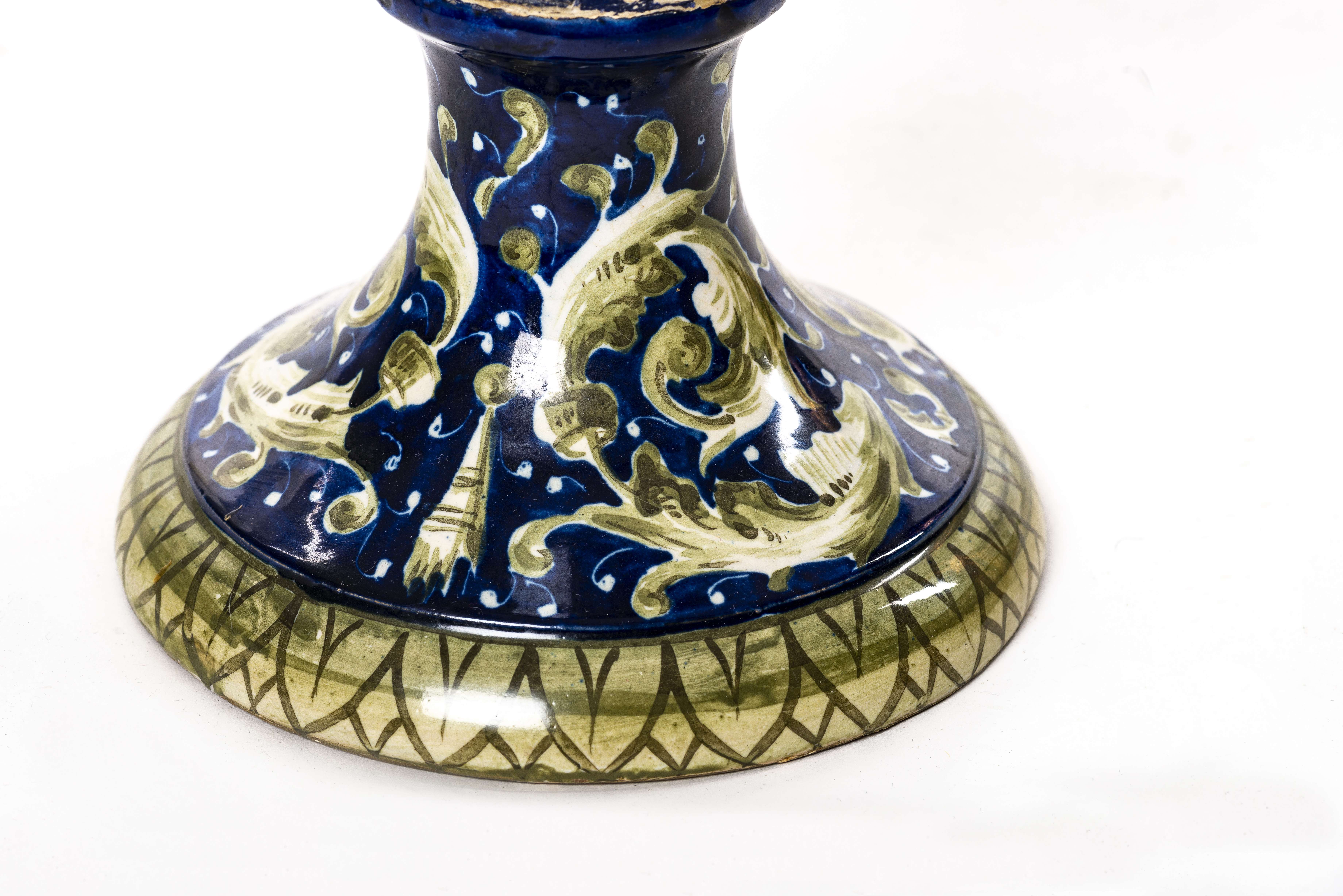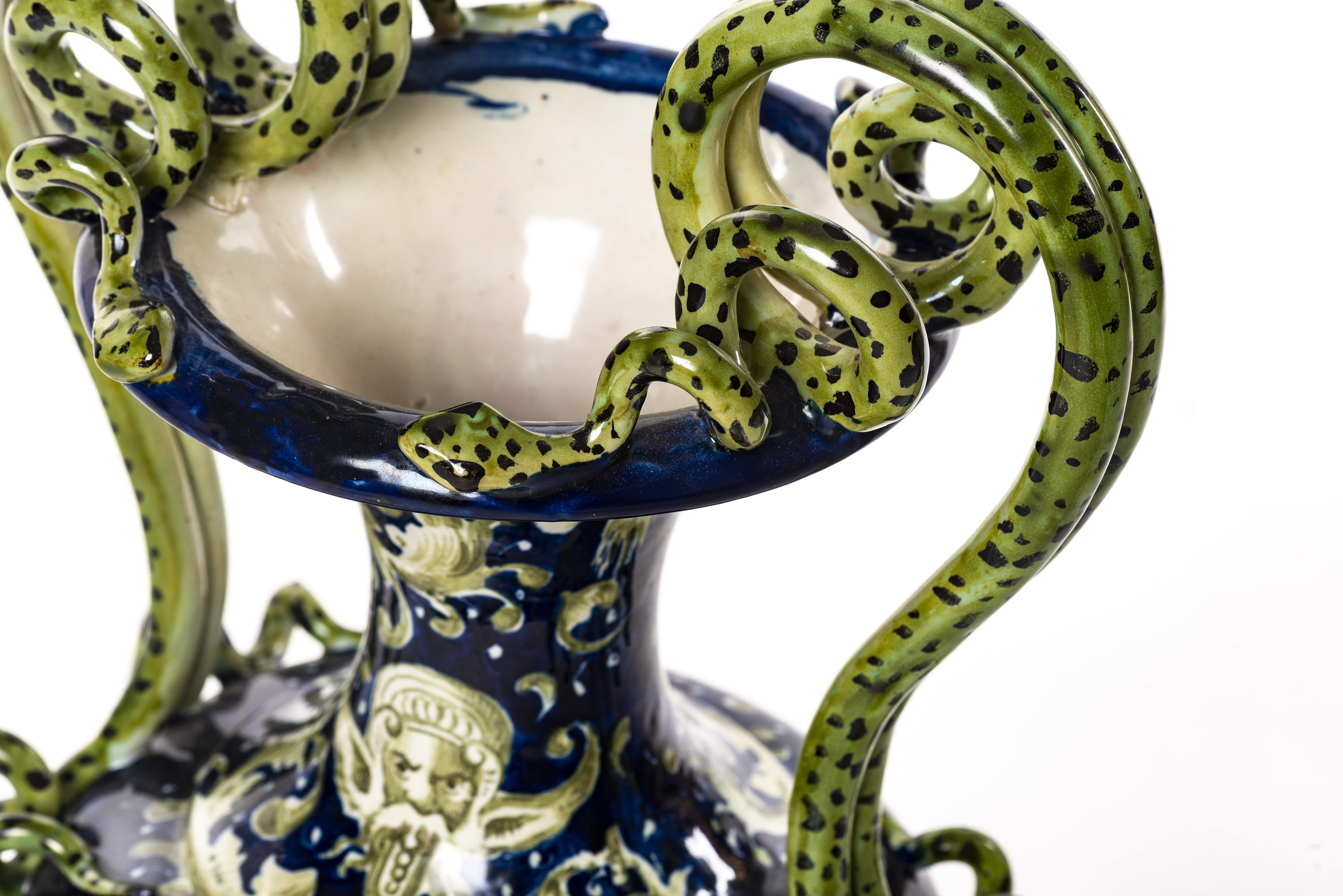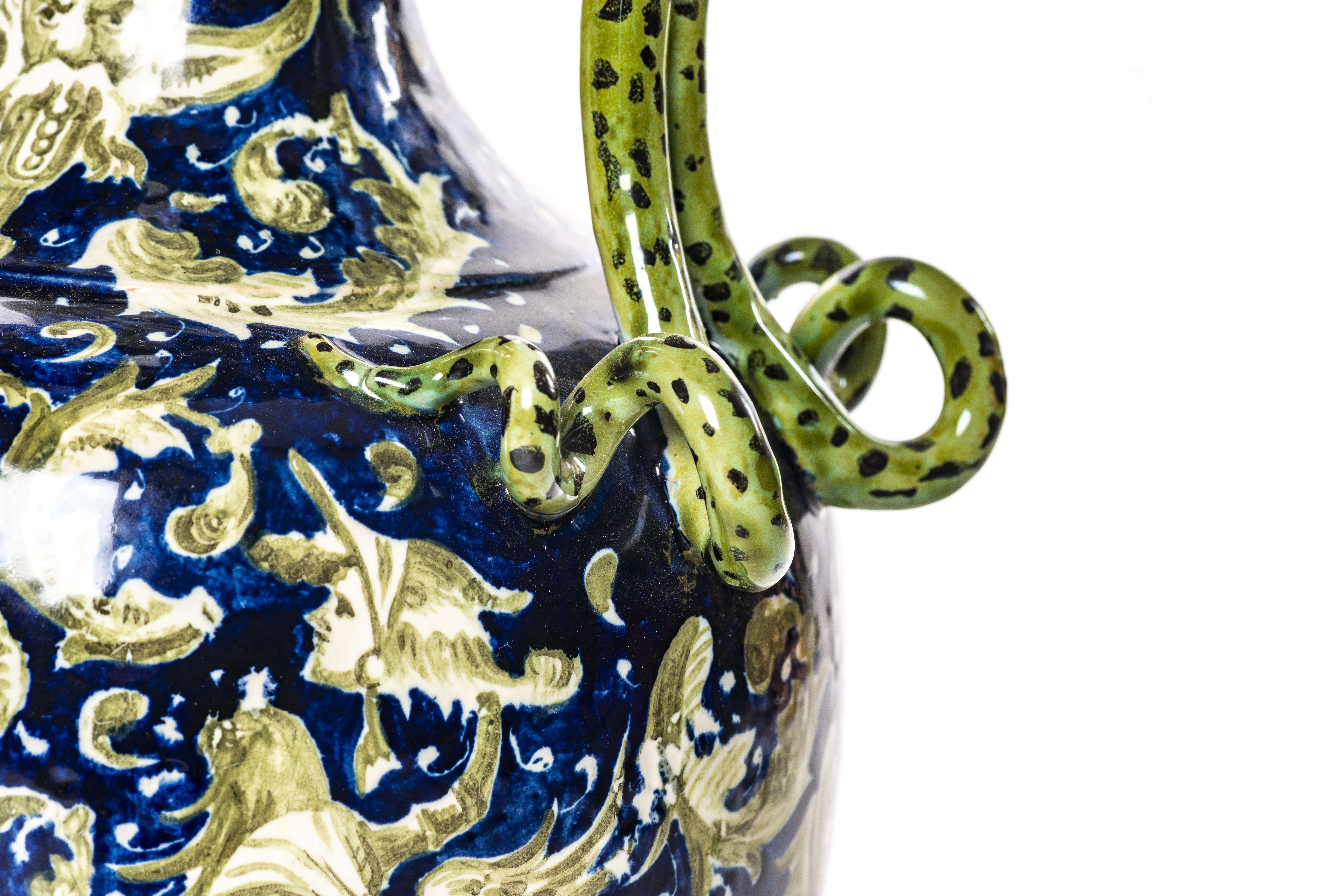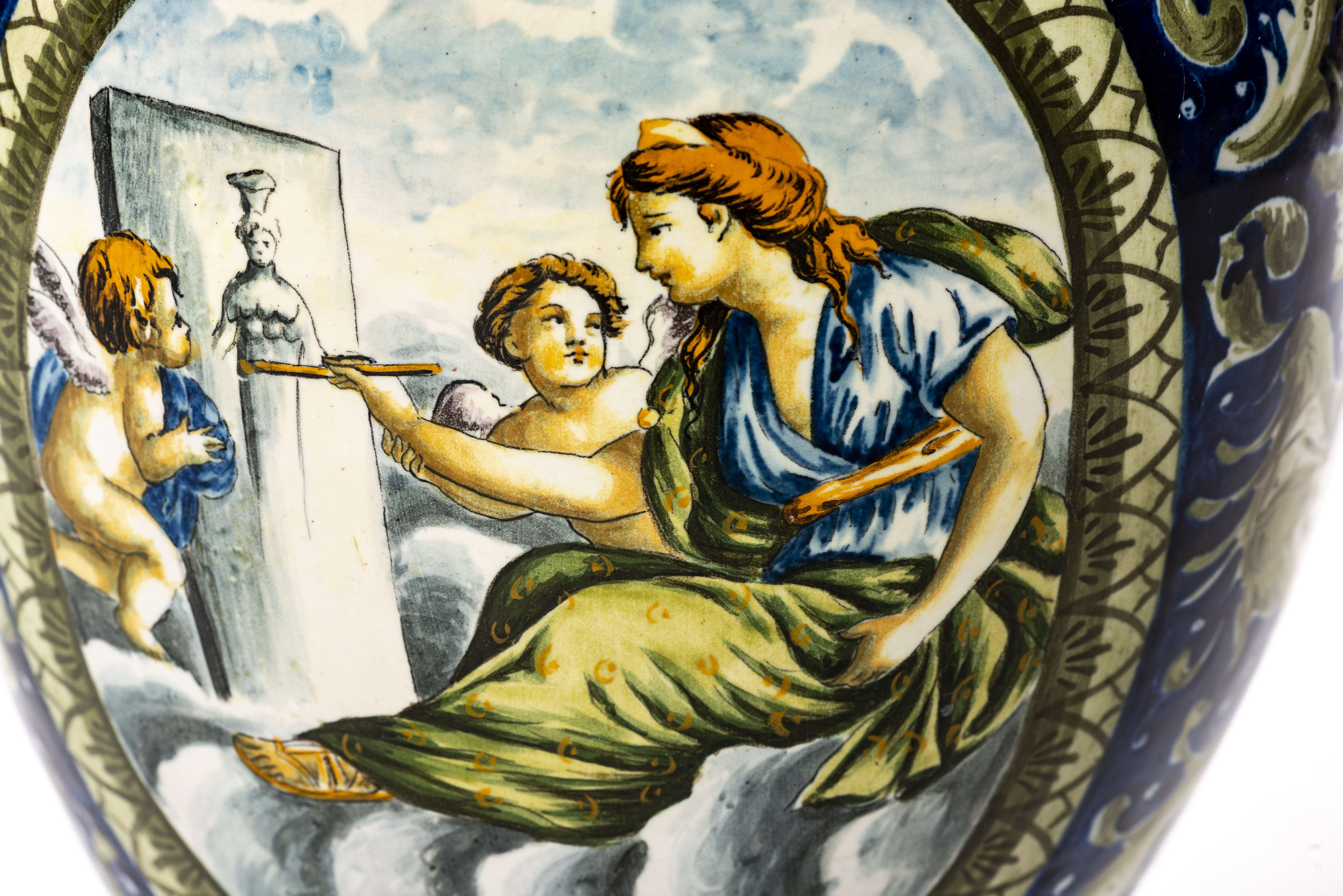 Vase balustre en majolique italienne à décor de grotesques et feuilles d'acanthe vertes sur fond bleu, un médaillon représentant une peintre et deux putti sur l'avers, et un anelot à la boule sans médaillon au revers, deux anses formant des serpents verts s'enroulant sur le rebord du col. Dans le goût des frères Minardi.