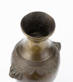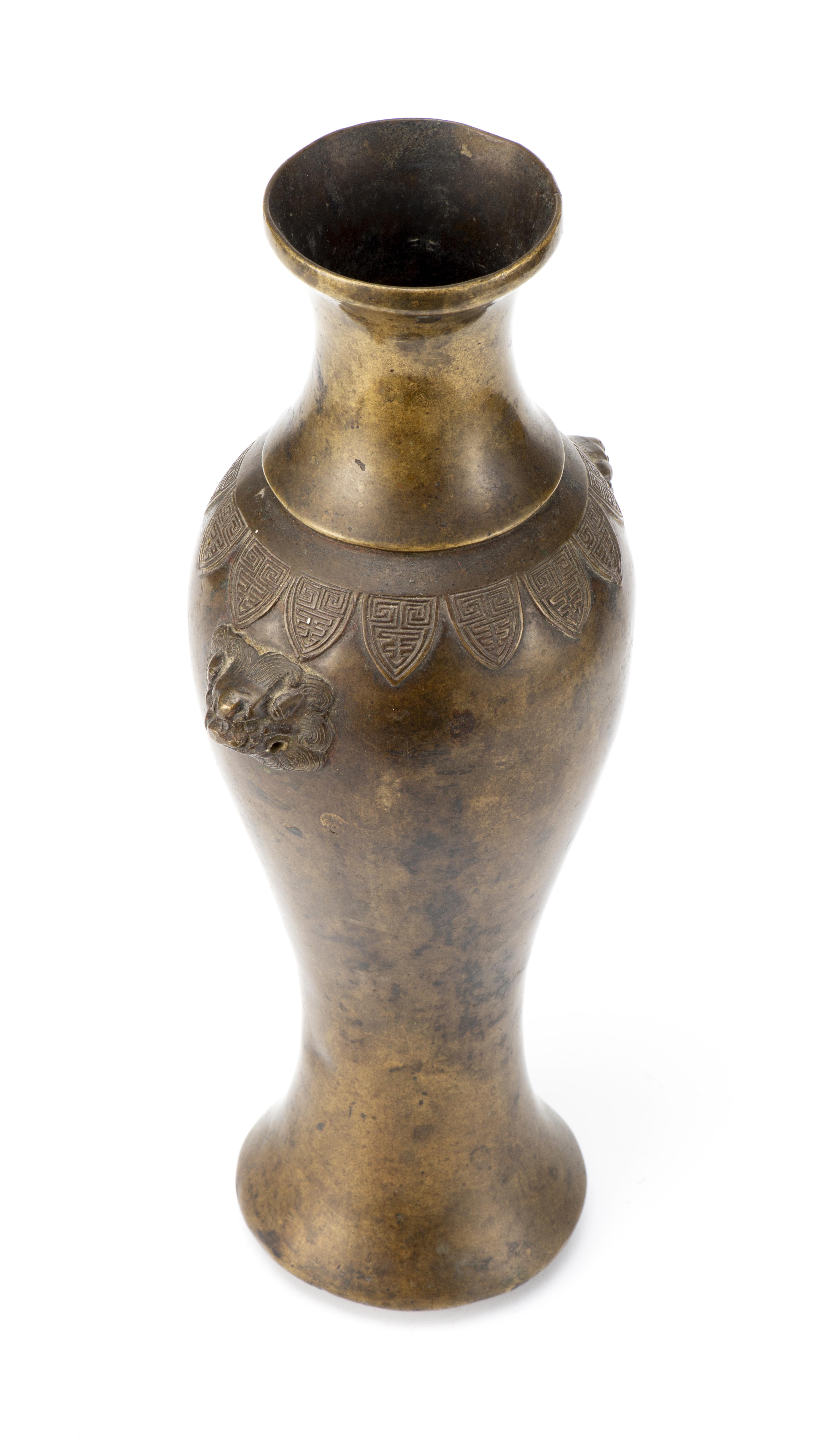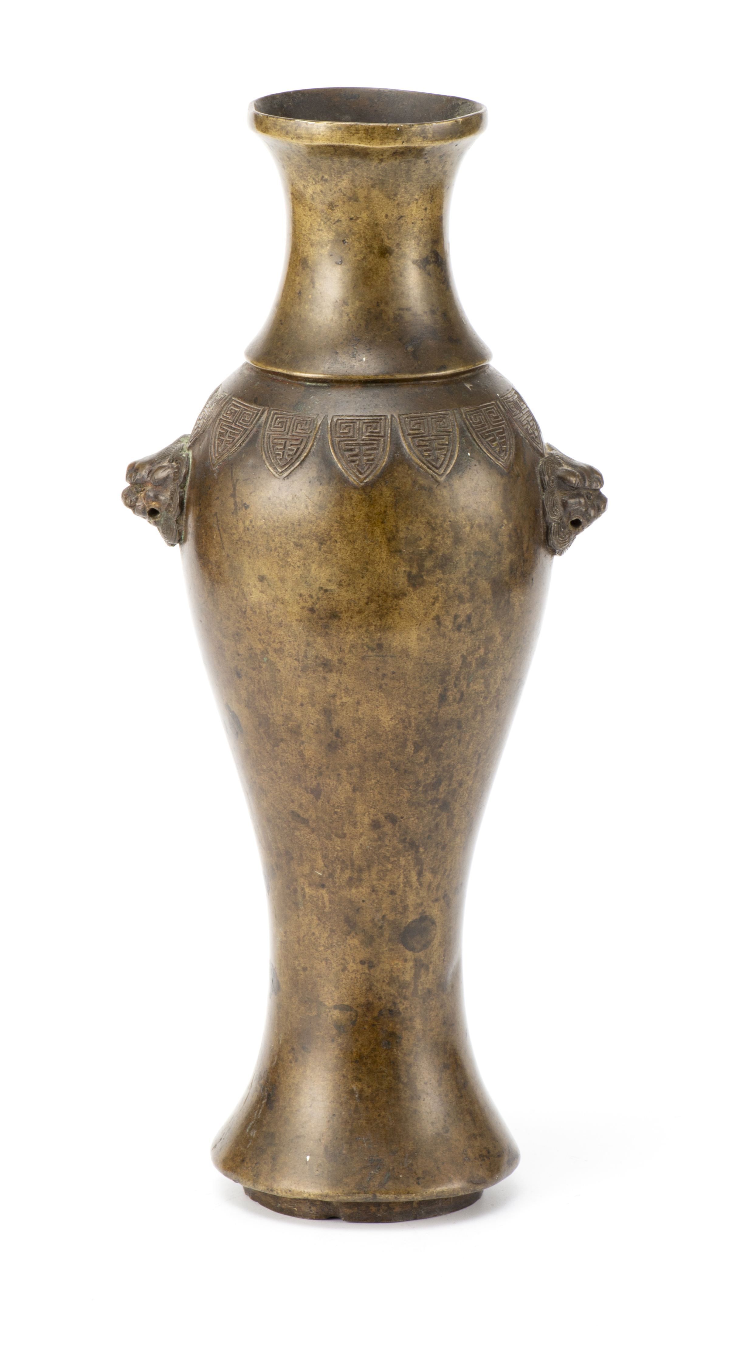 Vase en bronze de Chine à patine médaille de forme ballustre à épaule cerclée et décorée d'une frise de feuilles de plantain, épaule à masques de lions.