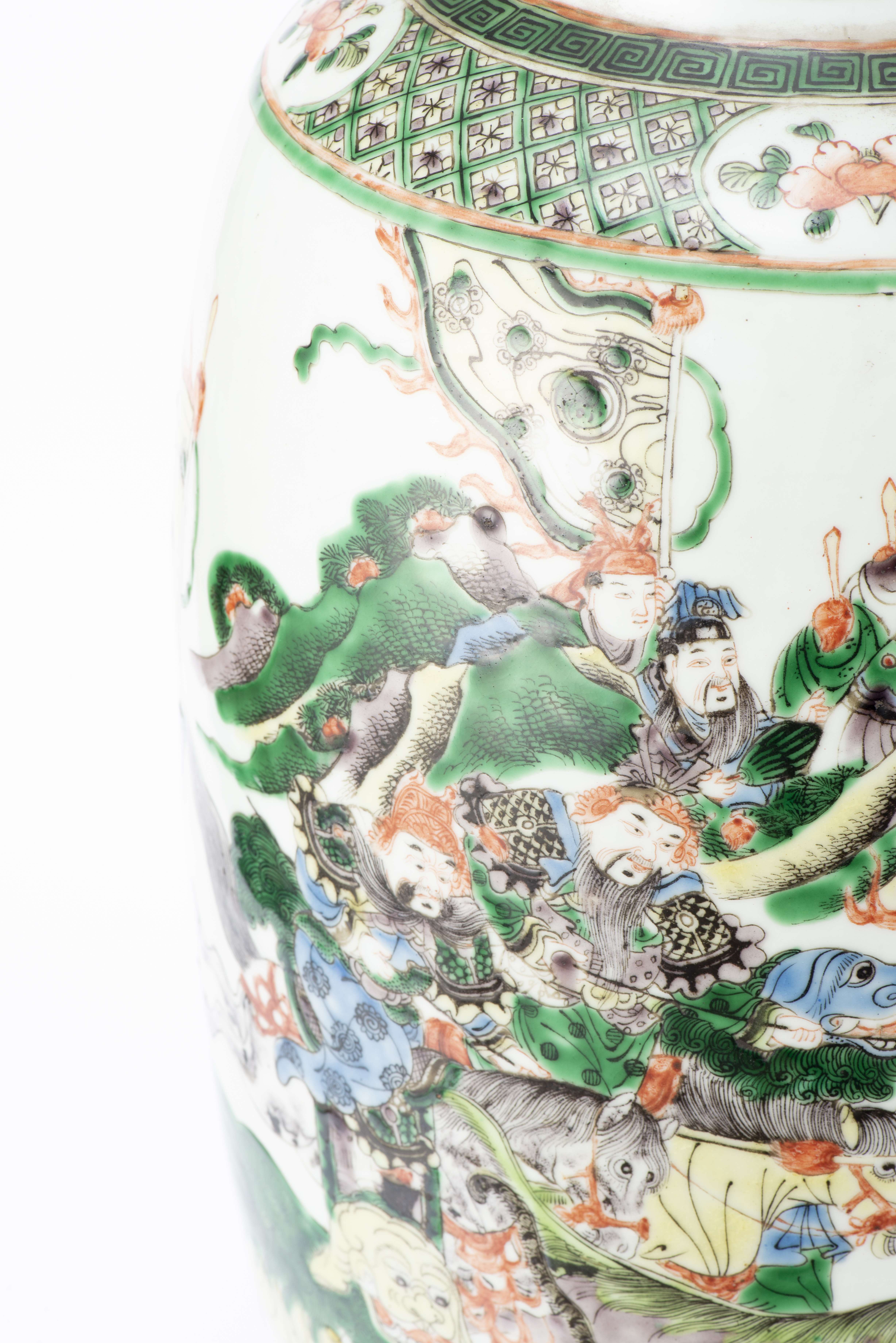 Vase en porcelaine de Chine à décor en famille verte représentant une scène de combat d'un groupe à cheval contre un groupe sur un éléphant Epoque Qing du XIXe. Marque à la feuille en rouge sous la base.