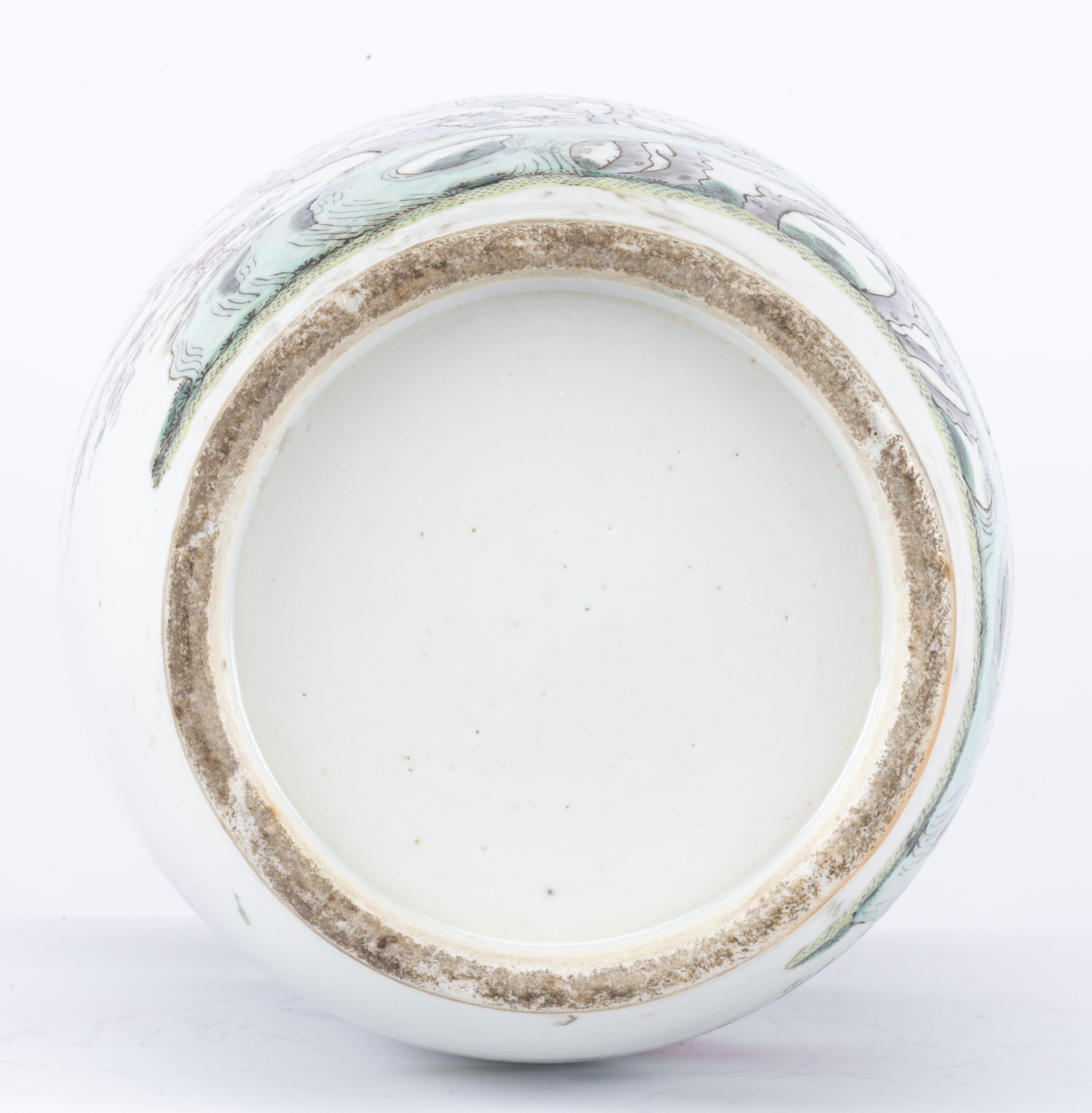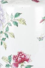 Vase rouleau en porcelaine de Chine à décor en famille rose de fleurs de pivoines et rochers. Fin des Qing.
