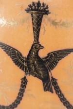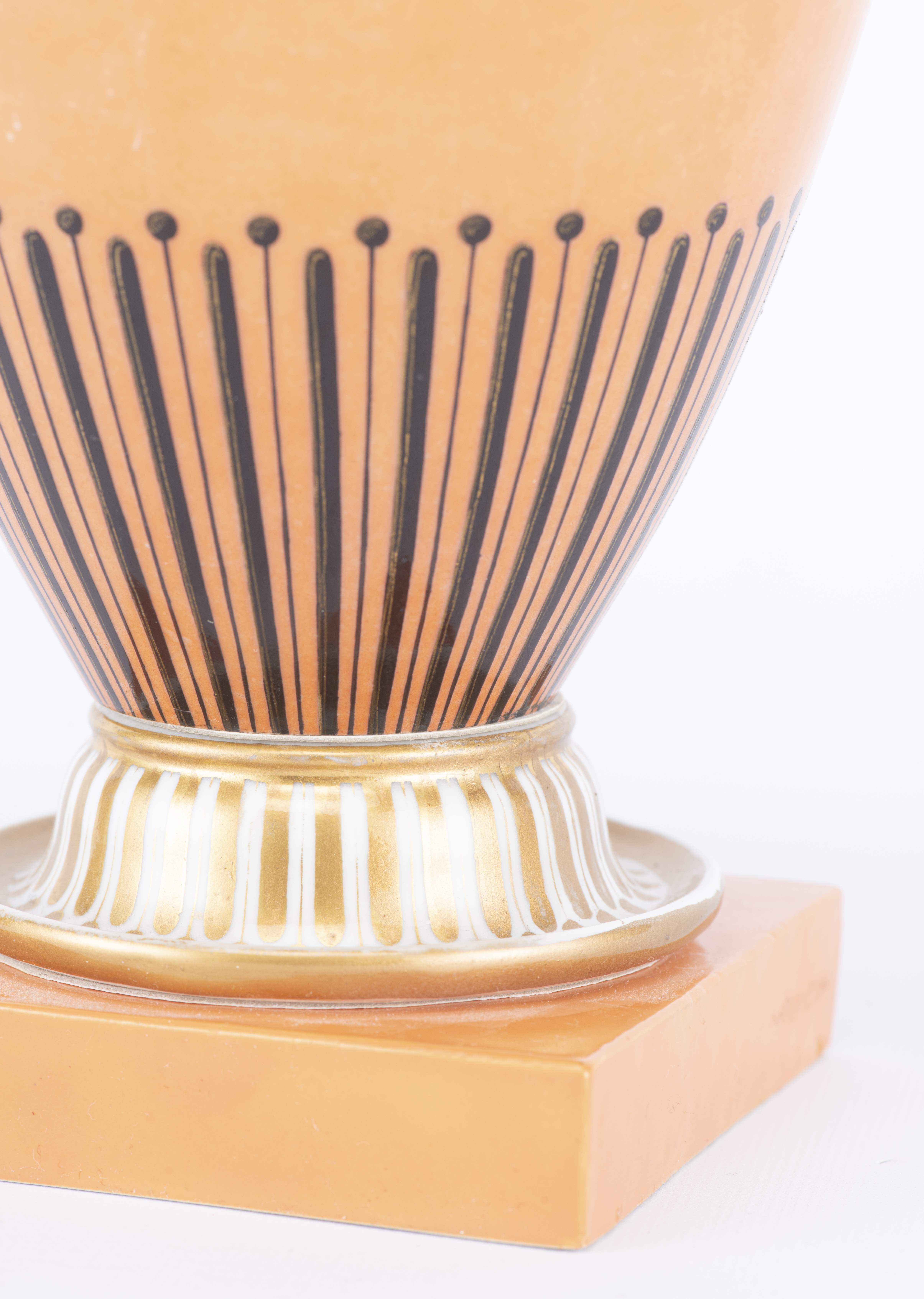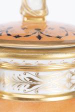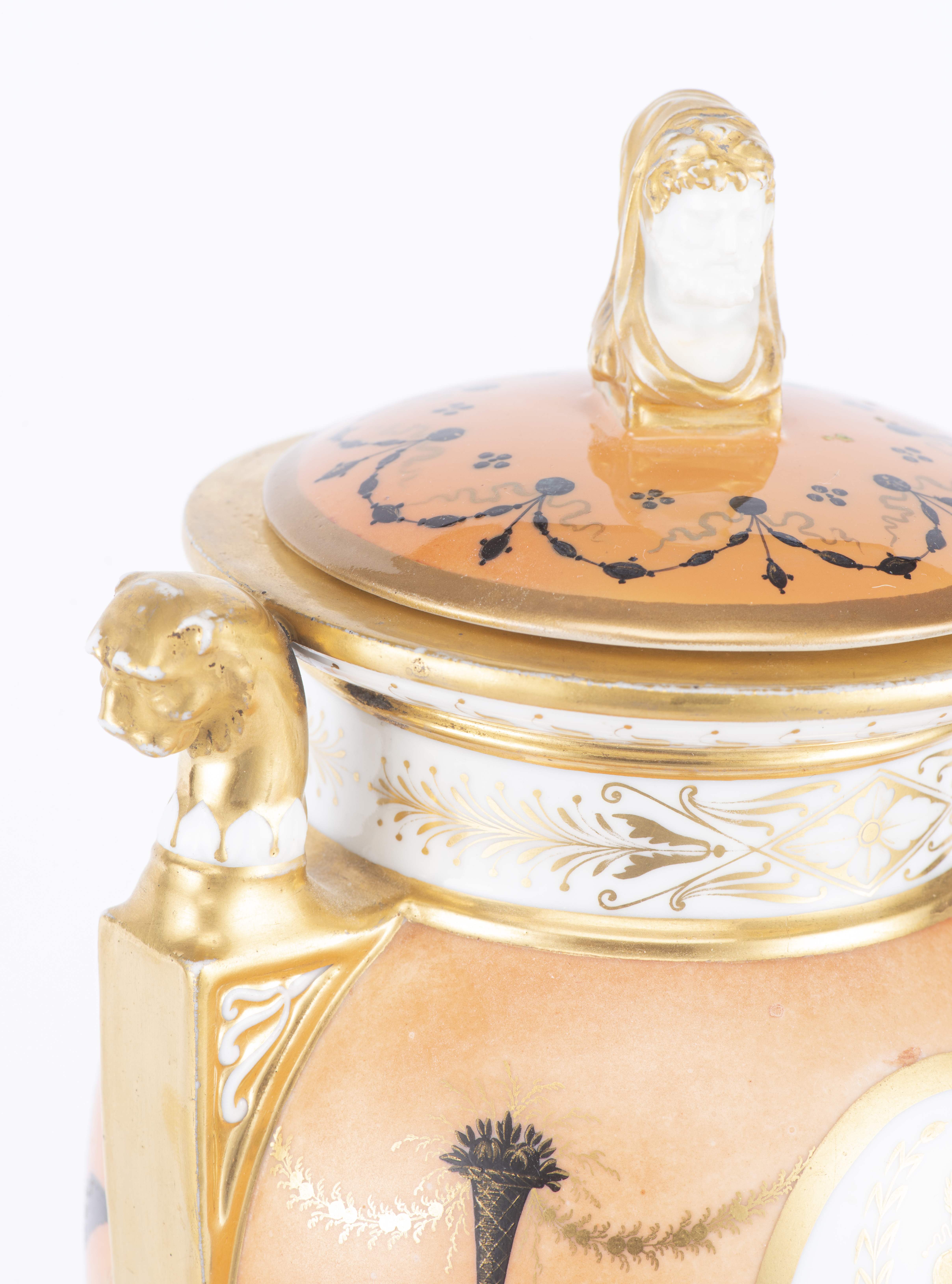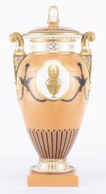 Vase urne à couvercle d'époque 1er Empire en porcelaine de la manufacture NAST (1783-1835) (Paris 70 rue des Amandiers-Popincourt dans le 11e) à décor Pompéien à médaillons et guirlandes d'oiseaux à tête soutenant un panier d'abondance, champ principal brique, base à frise de feuilles d'eau, épaule à 2 anses à tête de lion, couvercle à prise en forme de double visage homme/femme. Décor signé nast sous la base.