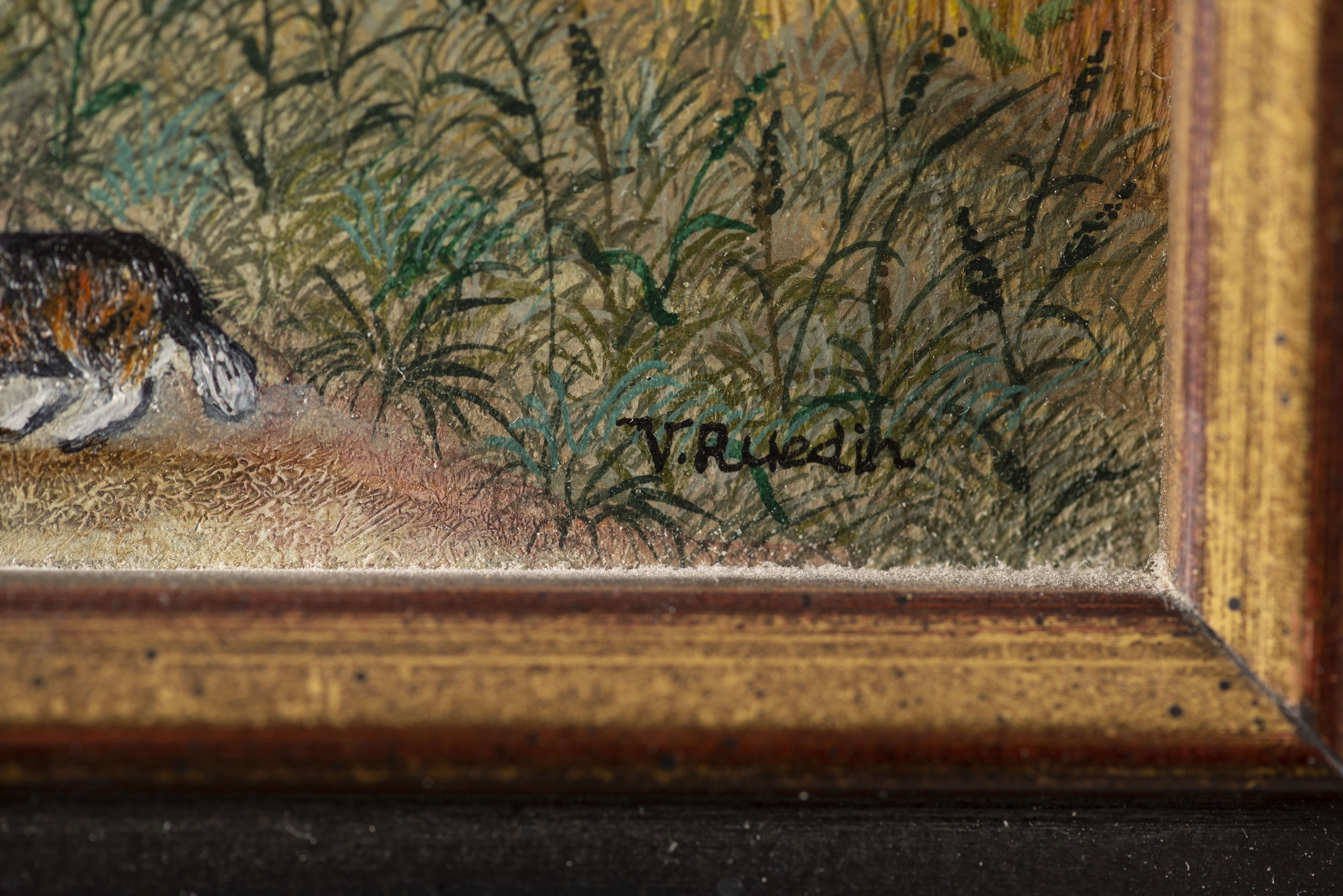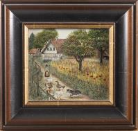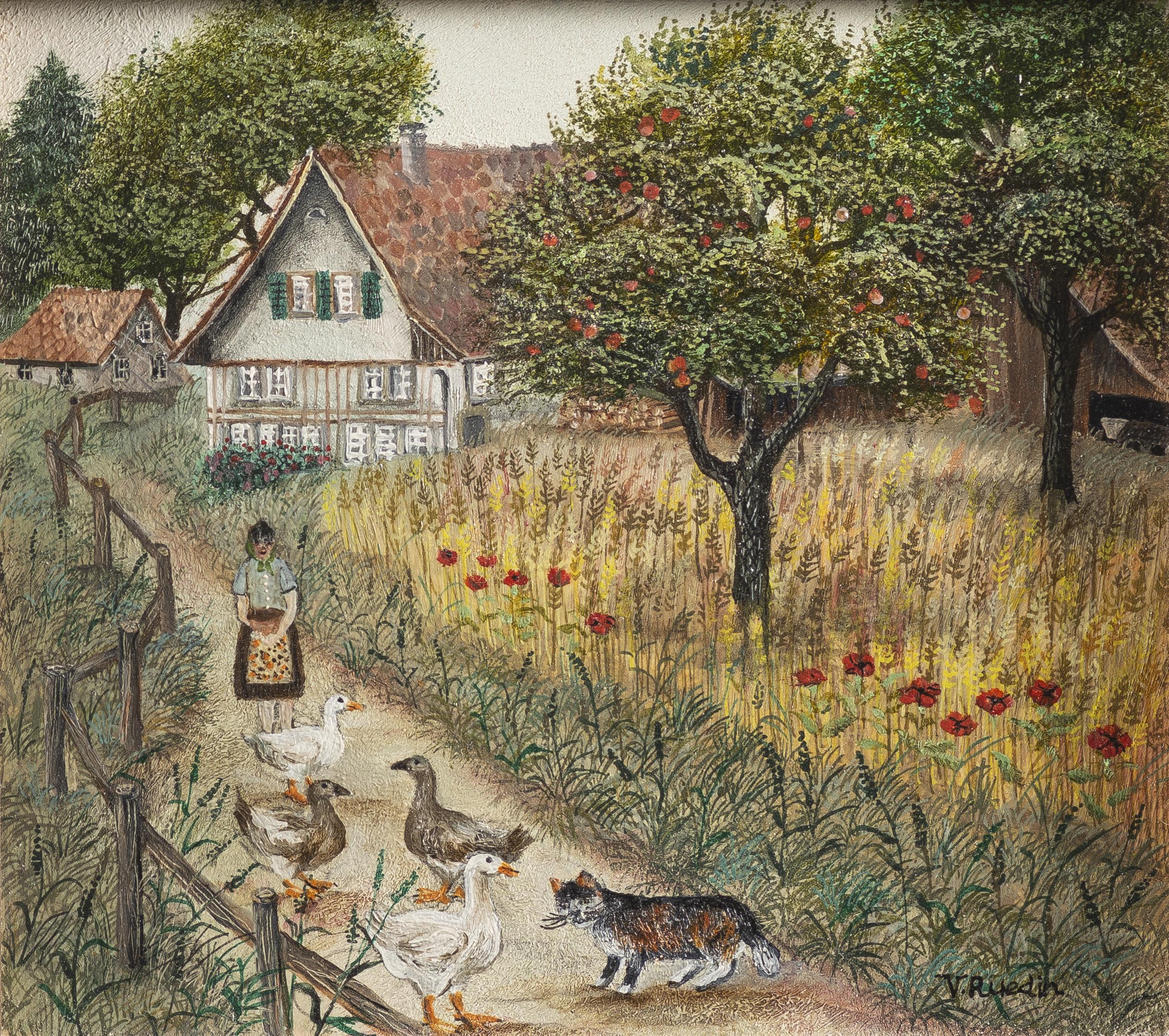 Verena Ruedin (XXe), "Gänse und Busi". Huile sur panneau, sbd et portant le n° 82974.