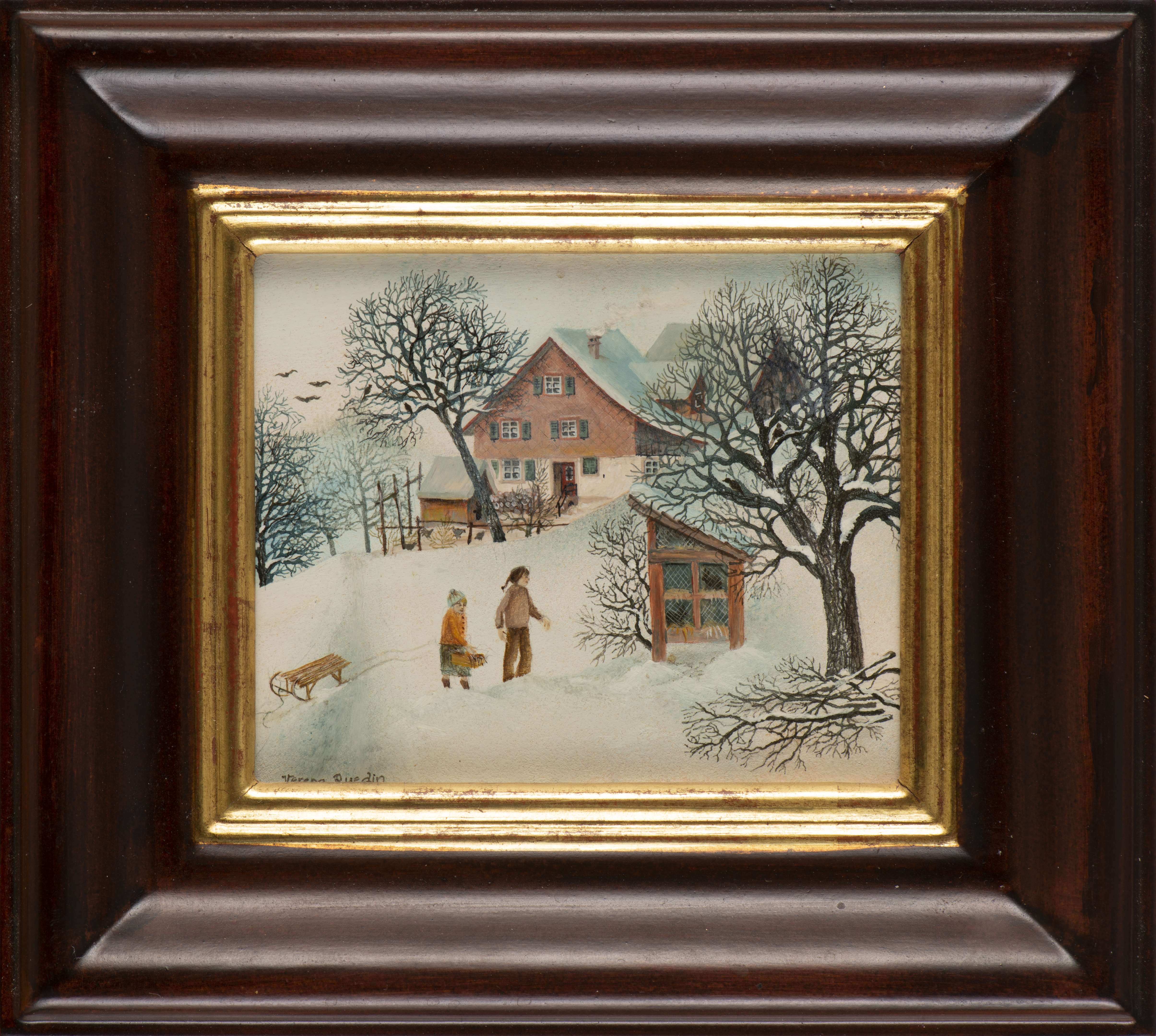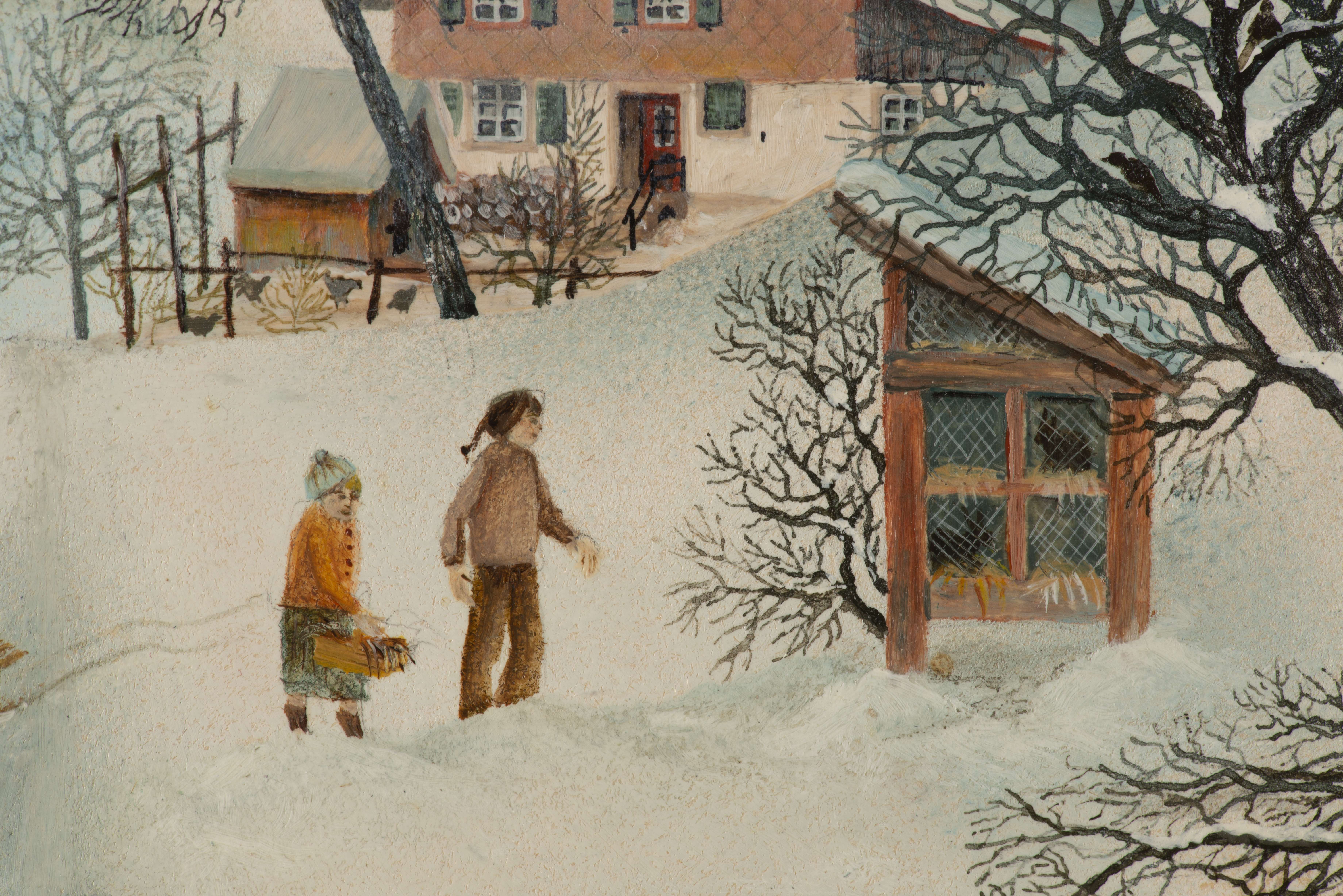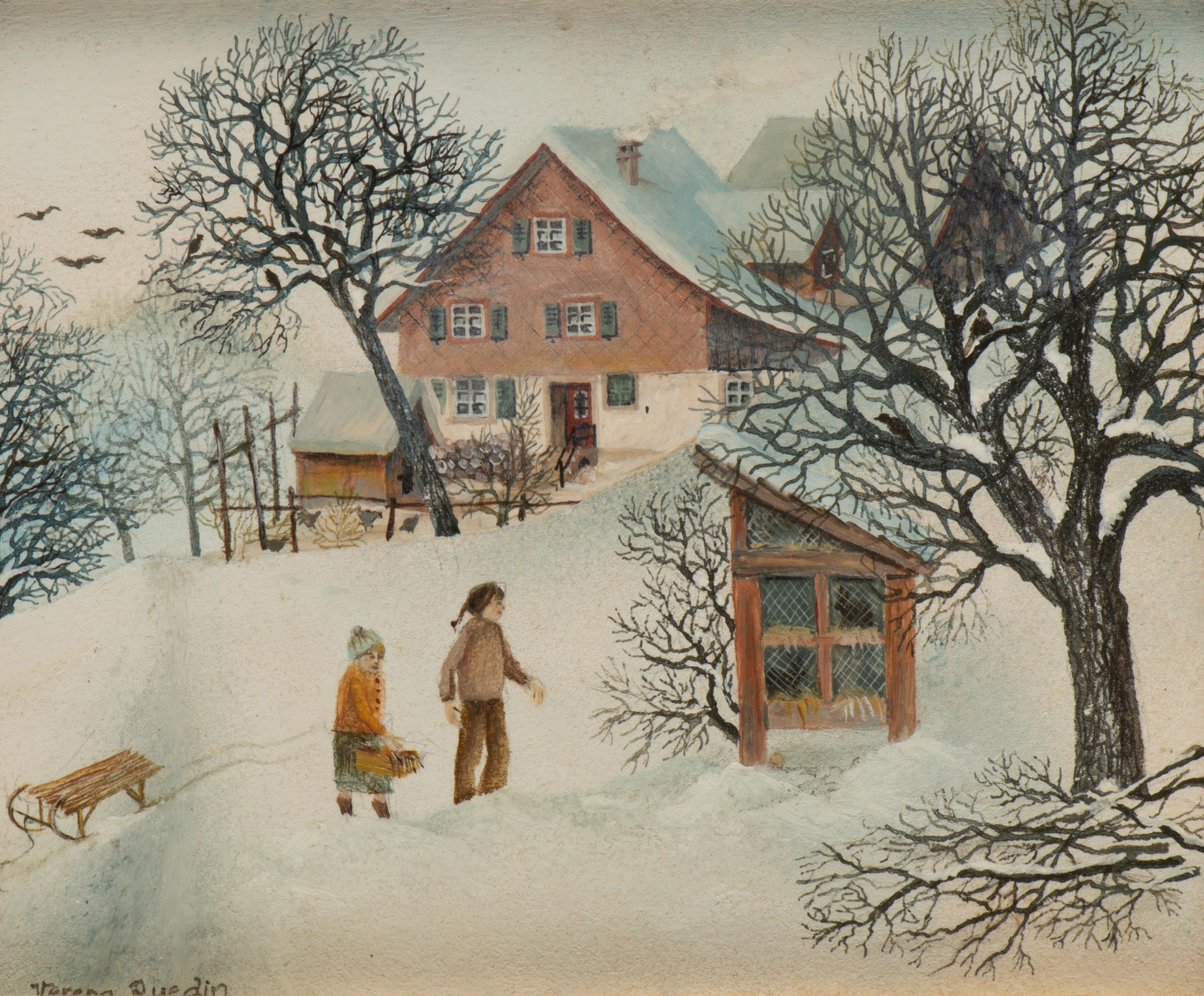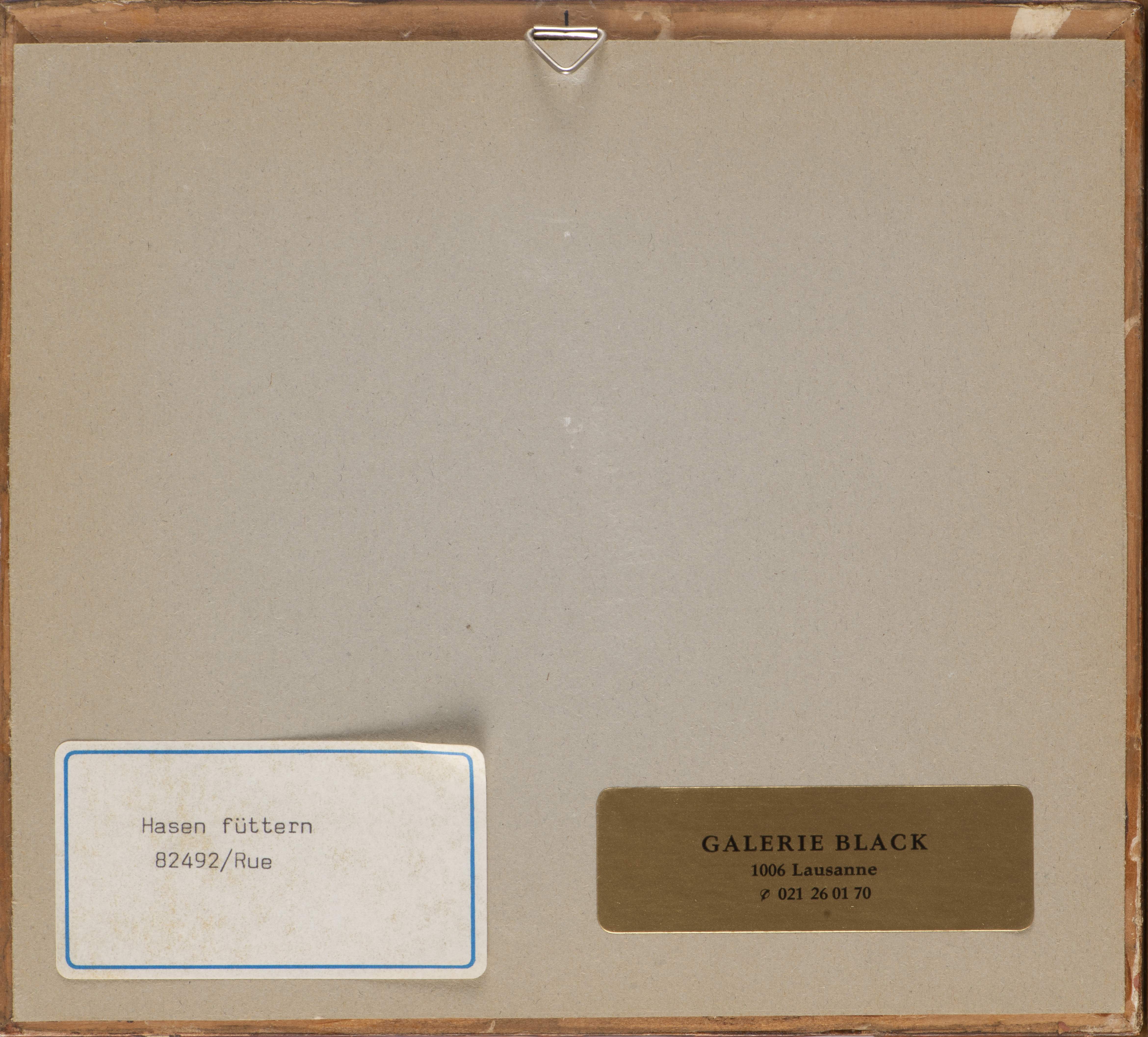 Verena RUEDIN (XXe), "Hasen füttern", huile sur panneau signée en bas à gauche et num. 82492/Rue au dos.