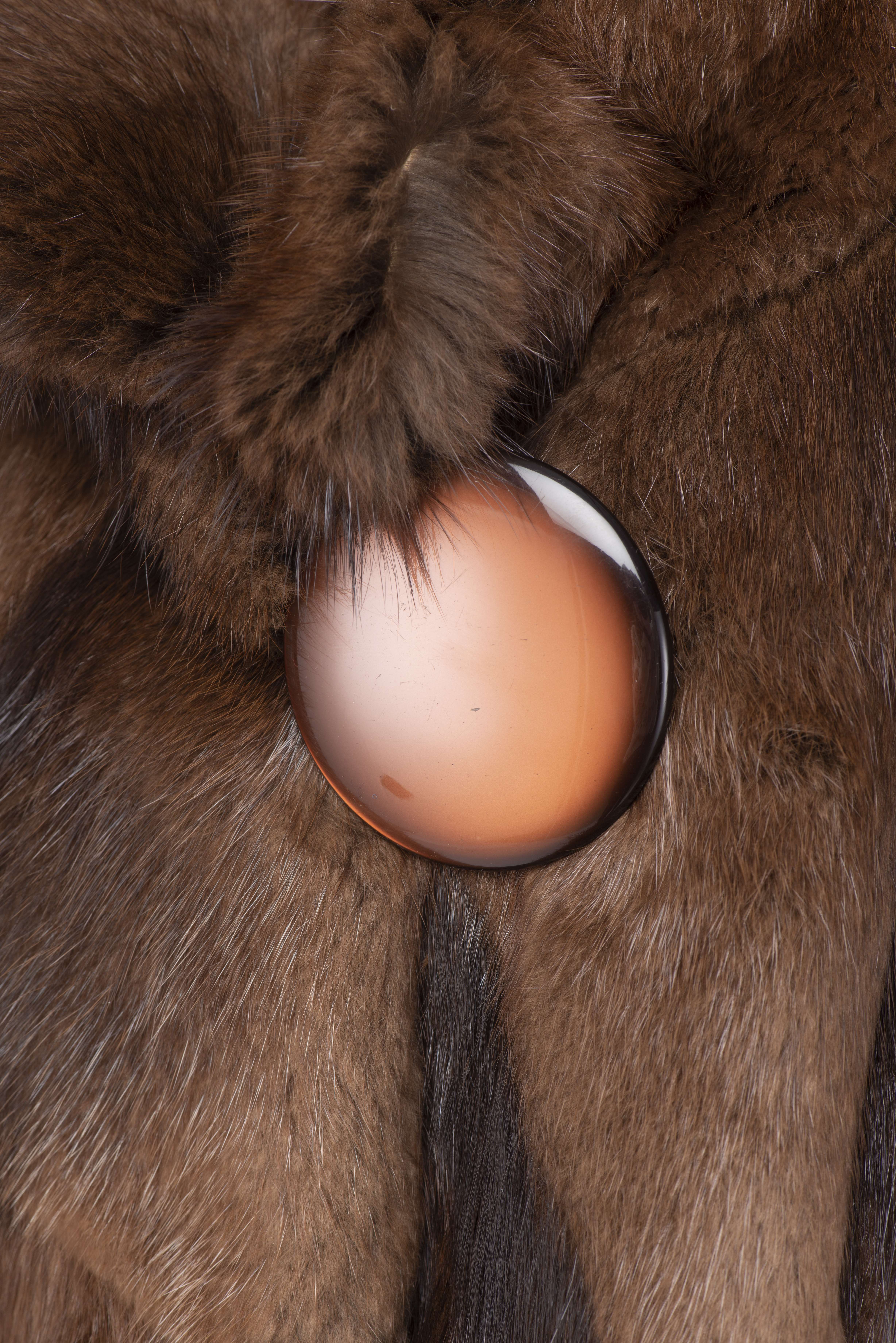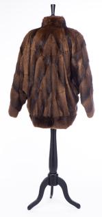 Veste courte en vison brun, 1 gros bouton de fermeture, 2 clips.