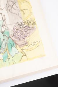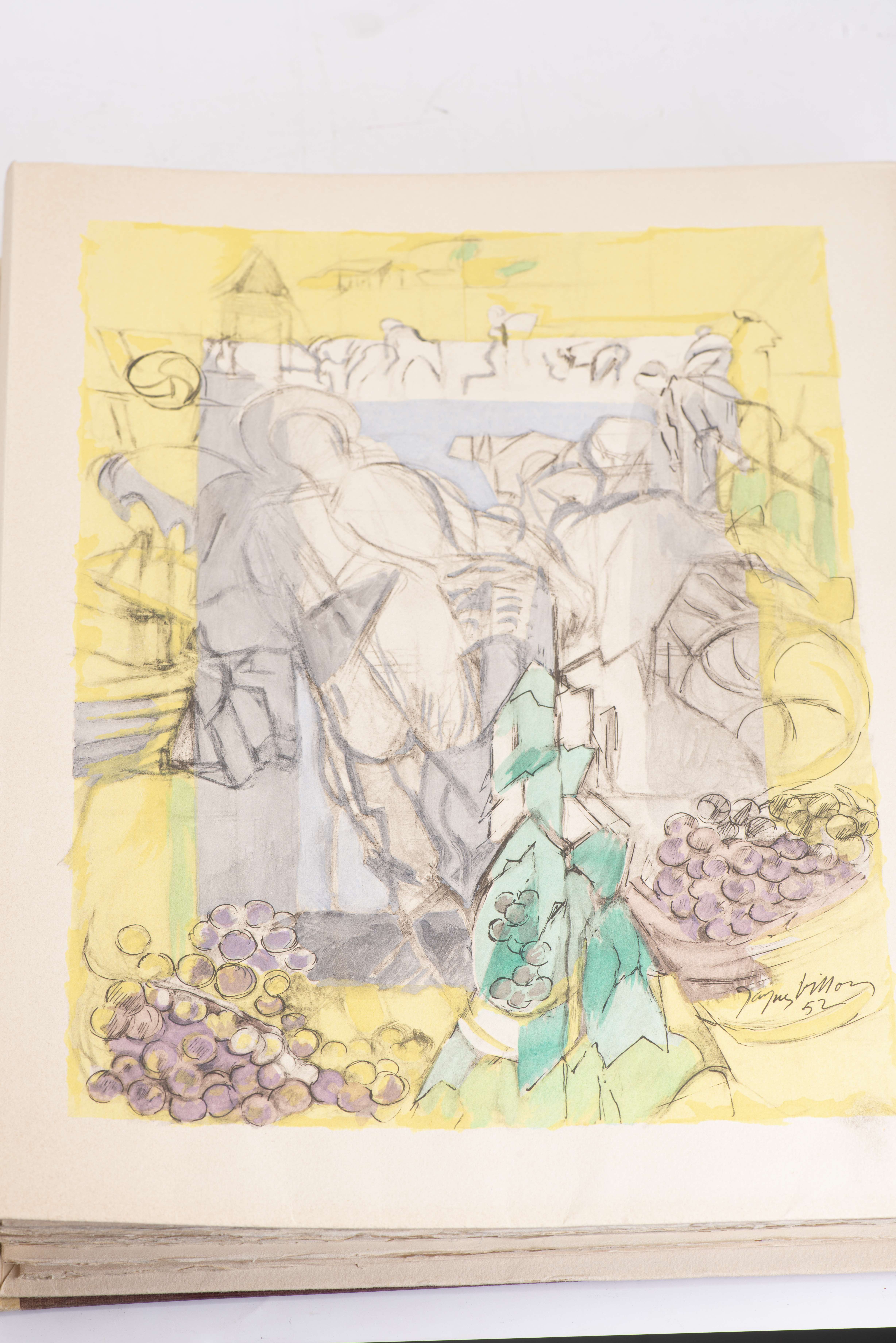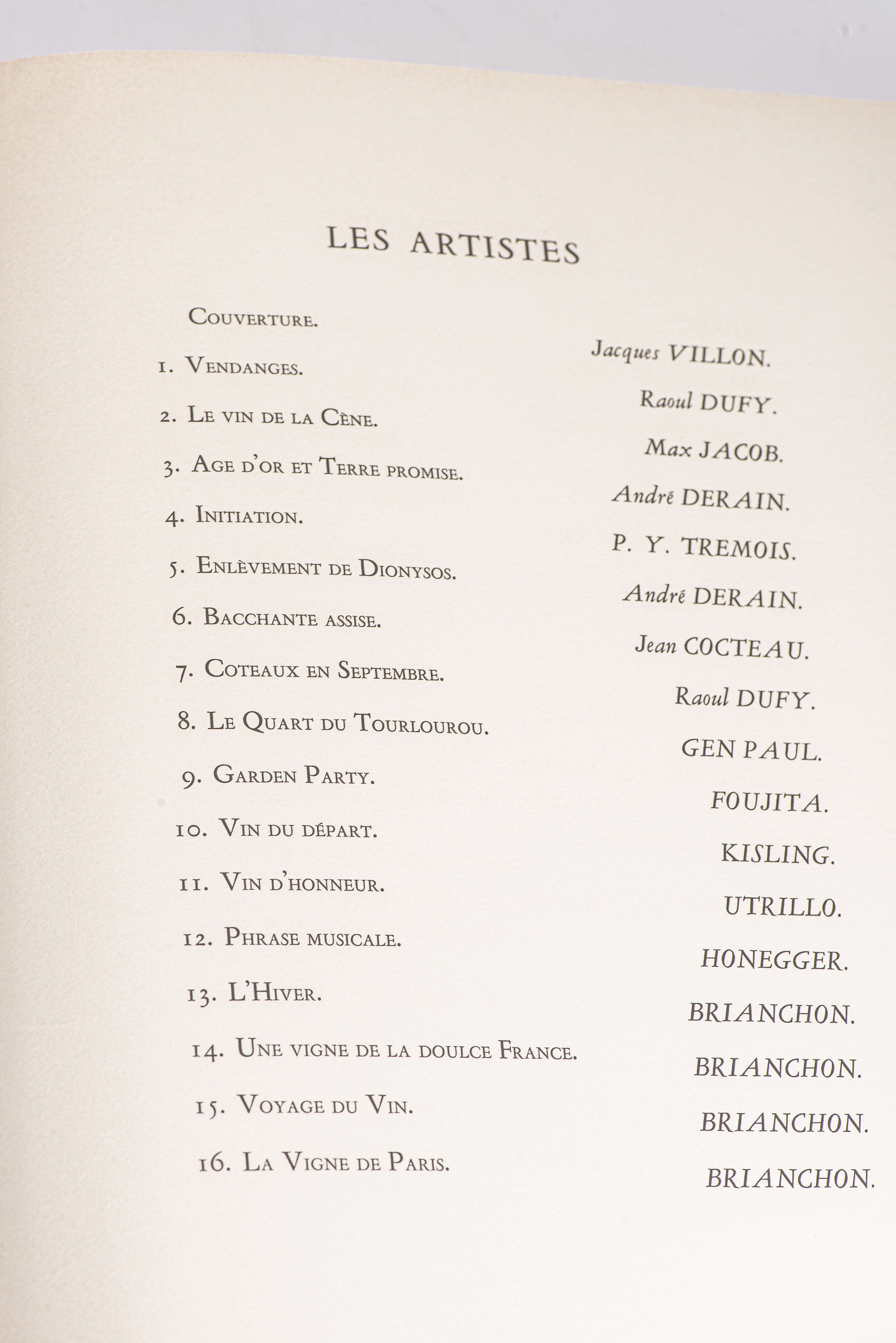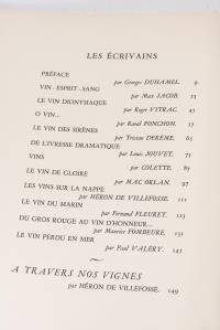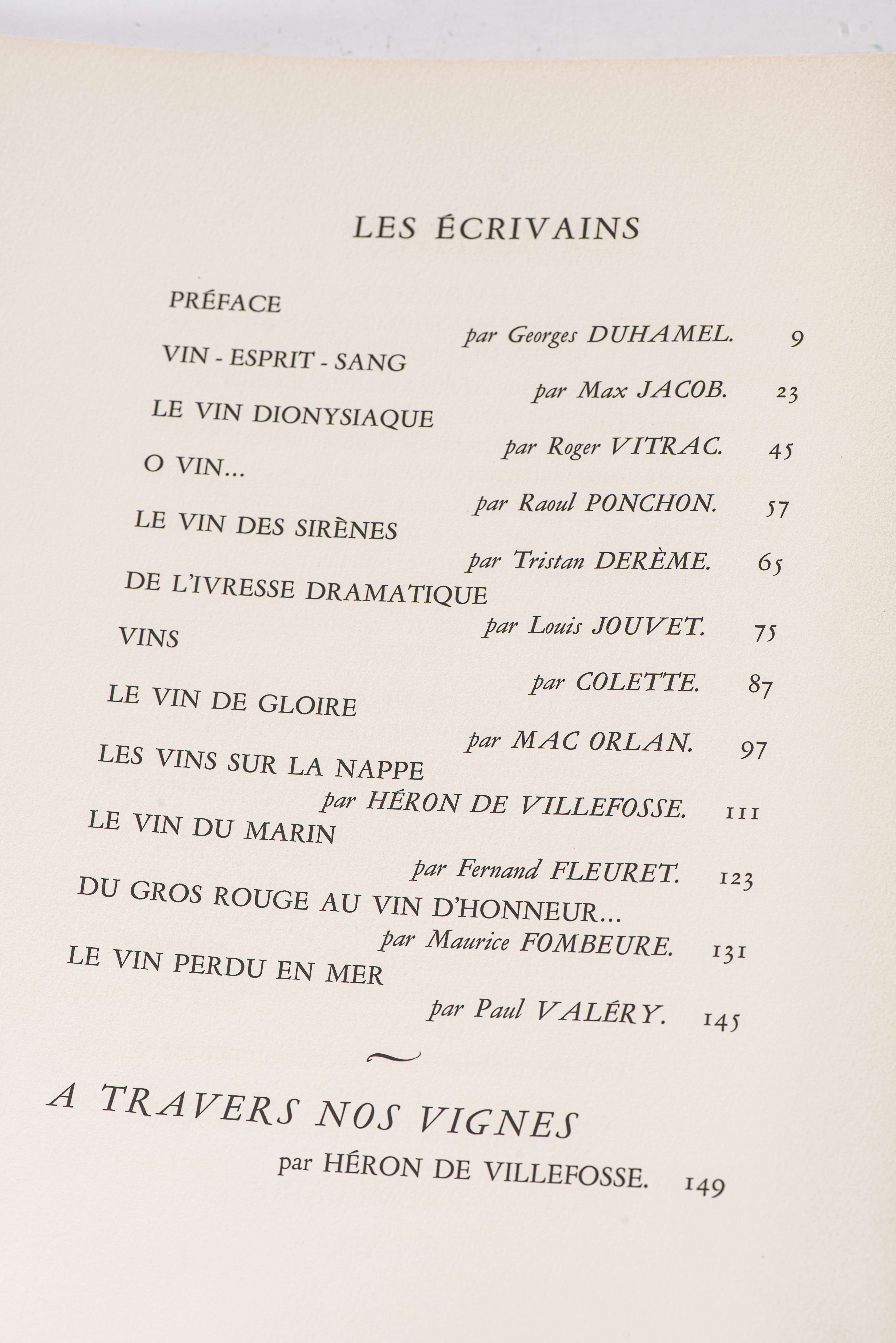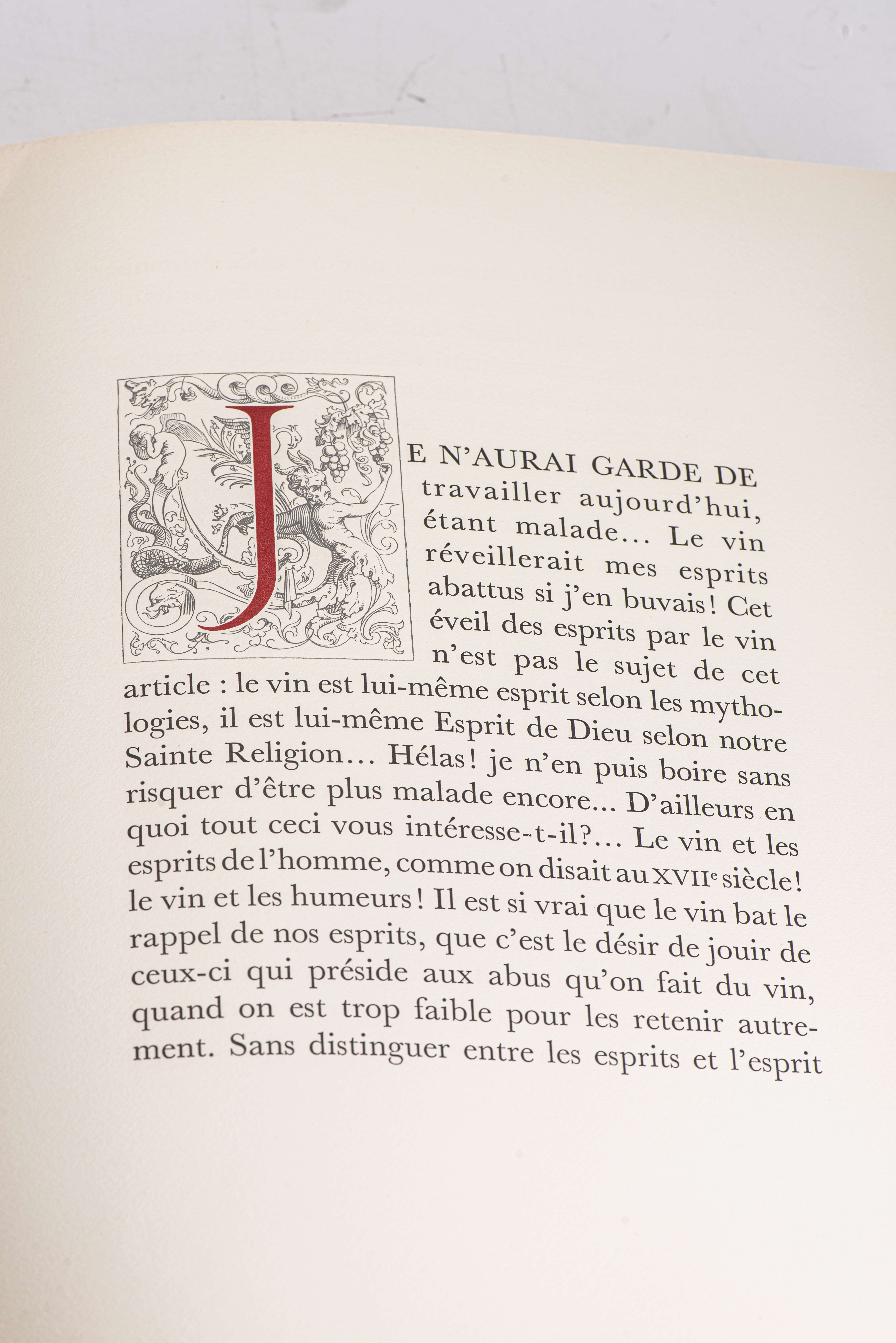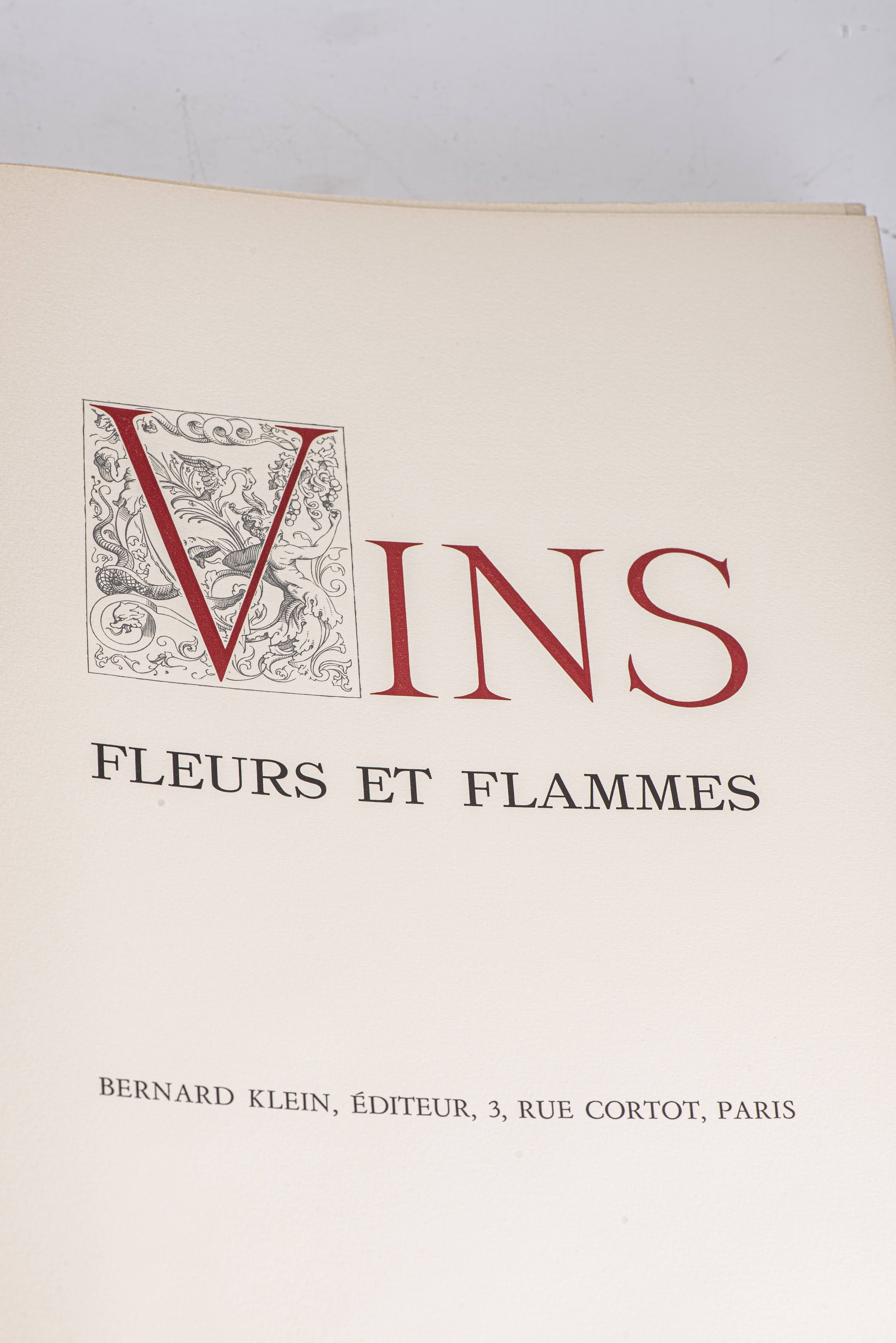 "Vins, fleurs et flammes". Paris, Klein, 1953. Grand in-4, en feuilles, couverture, chemise et étui de l'éditeur. Édiiton originale. Recueil de textes par Georges Duhamel, Max Jacob, Roger Vitrac, Raoul Ponchon, Tristan Derème, Louis Jouvet, Colette, Mac Orlan, Héron de Villefosse, Fernand Fleuret, Maurice Fombeure et Paul Valéry.