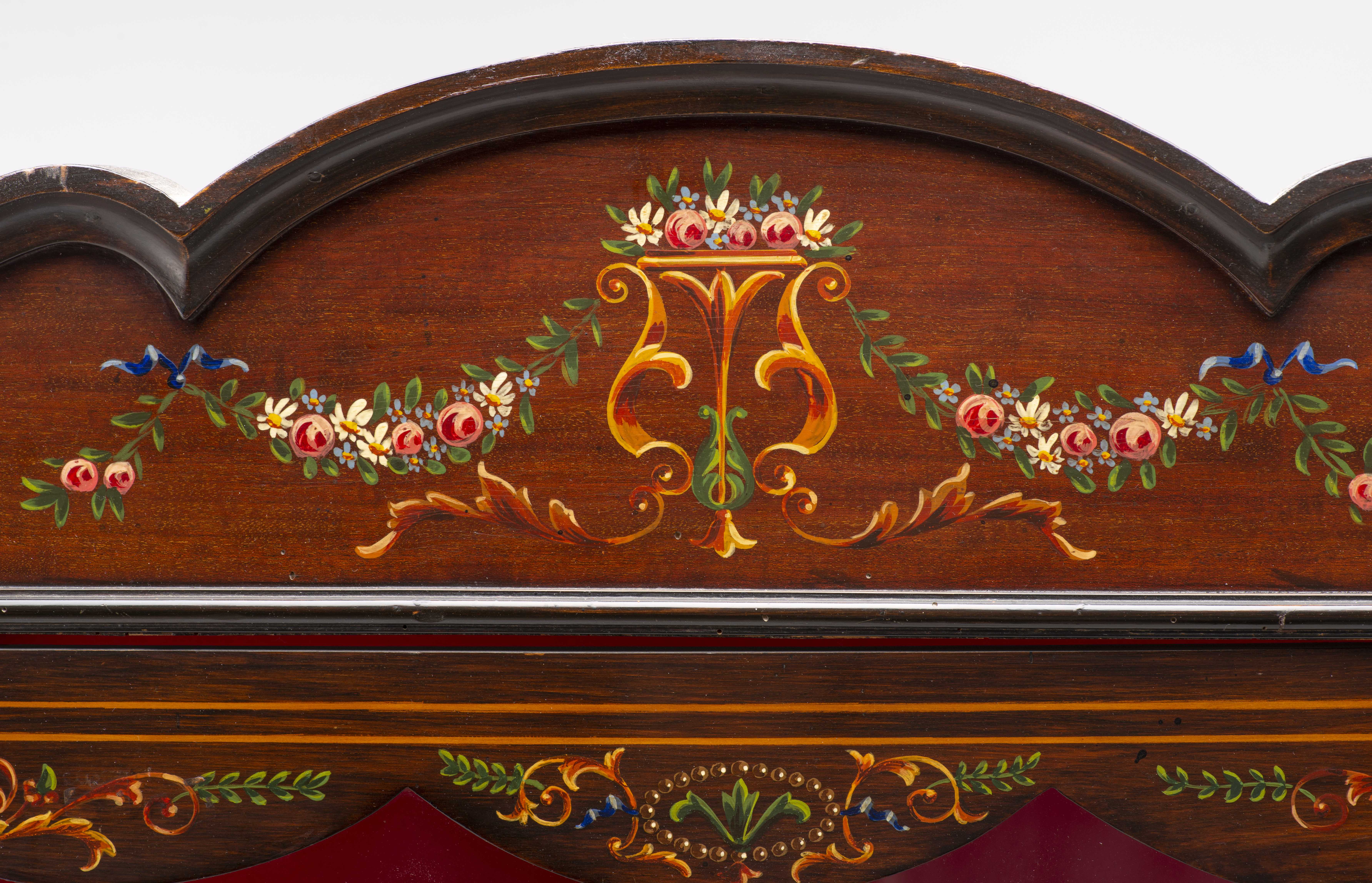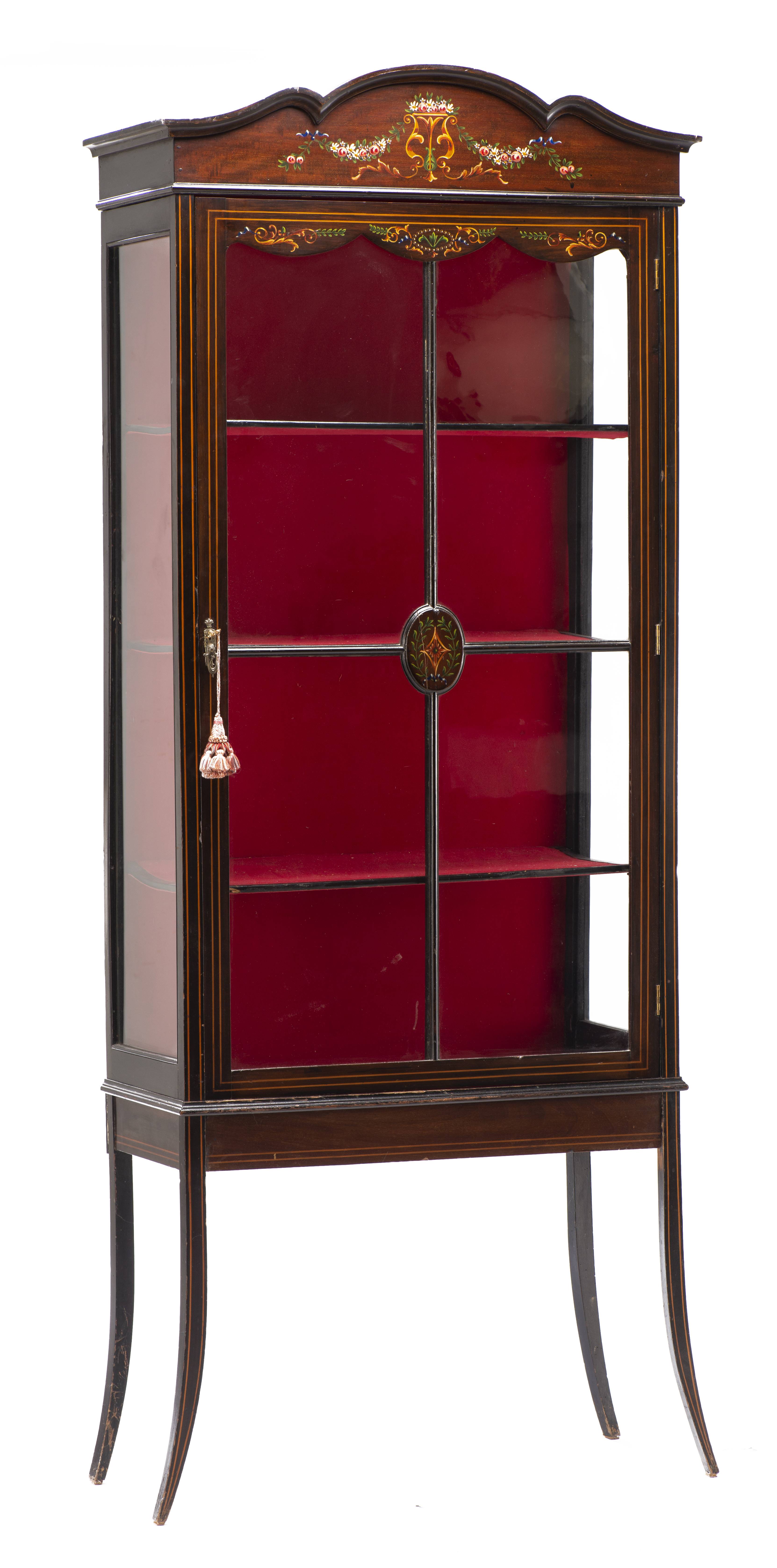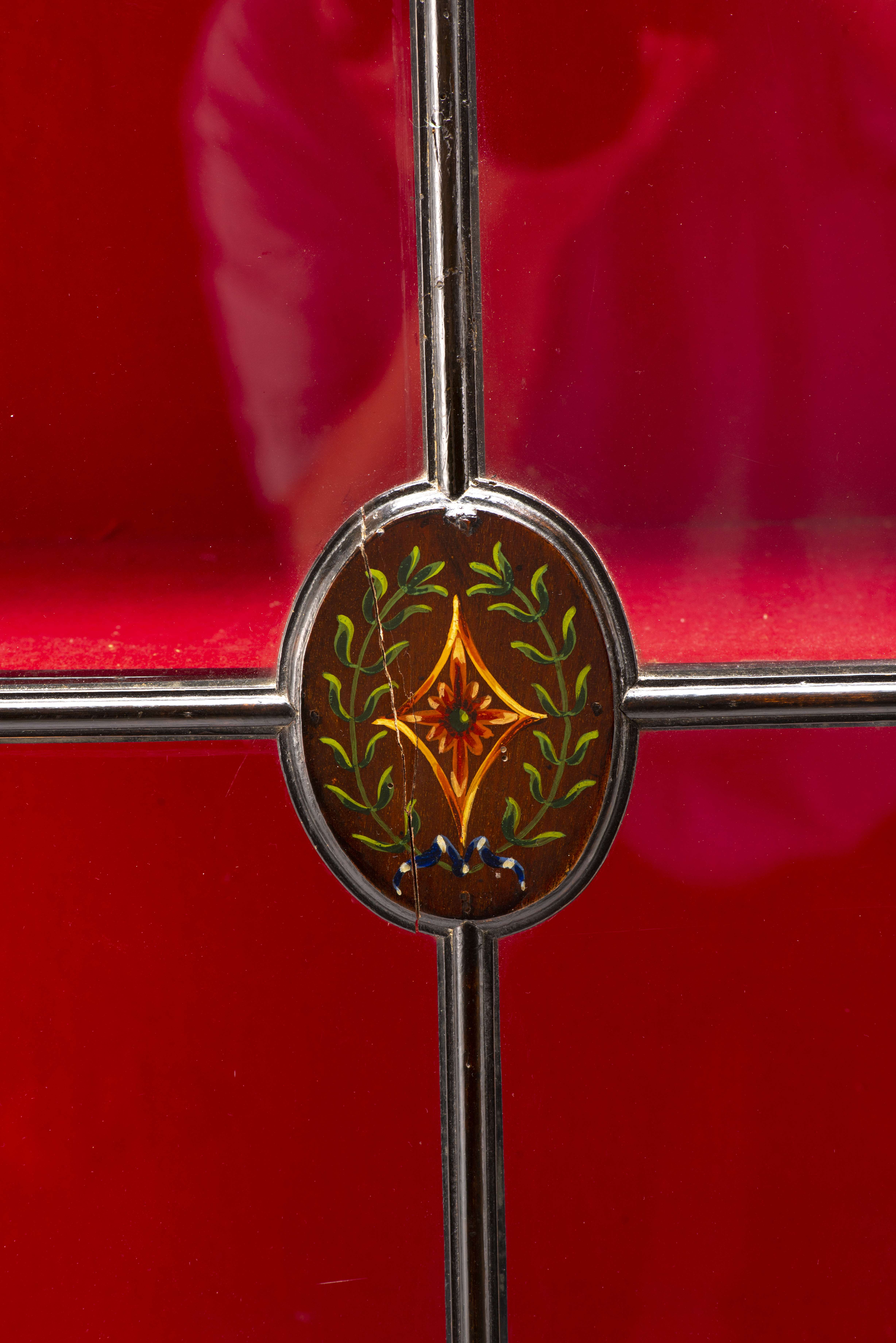 Vitrine anglaise en acajou peint de style Regency à décor floral d'inspiration pompéienne, trois faces et côtés vitrés et fond rouge, 4 étages.