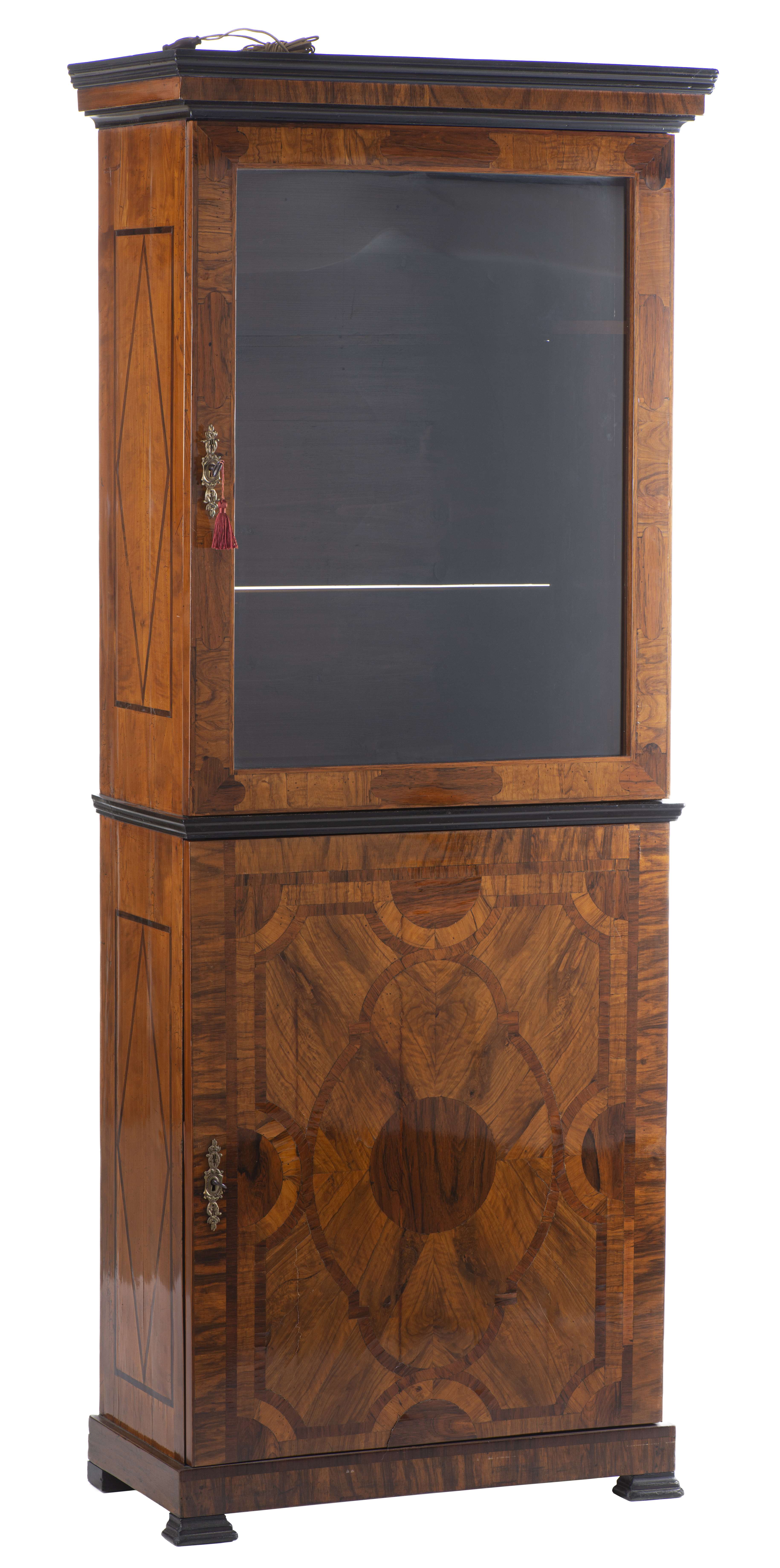 Vitrine marquetée de style Louis XIV en bois noirci, fruitier et palissandre.Panneau inférieur marqueté et côtés à filets en lozanges.