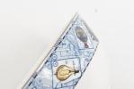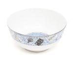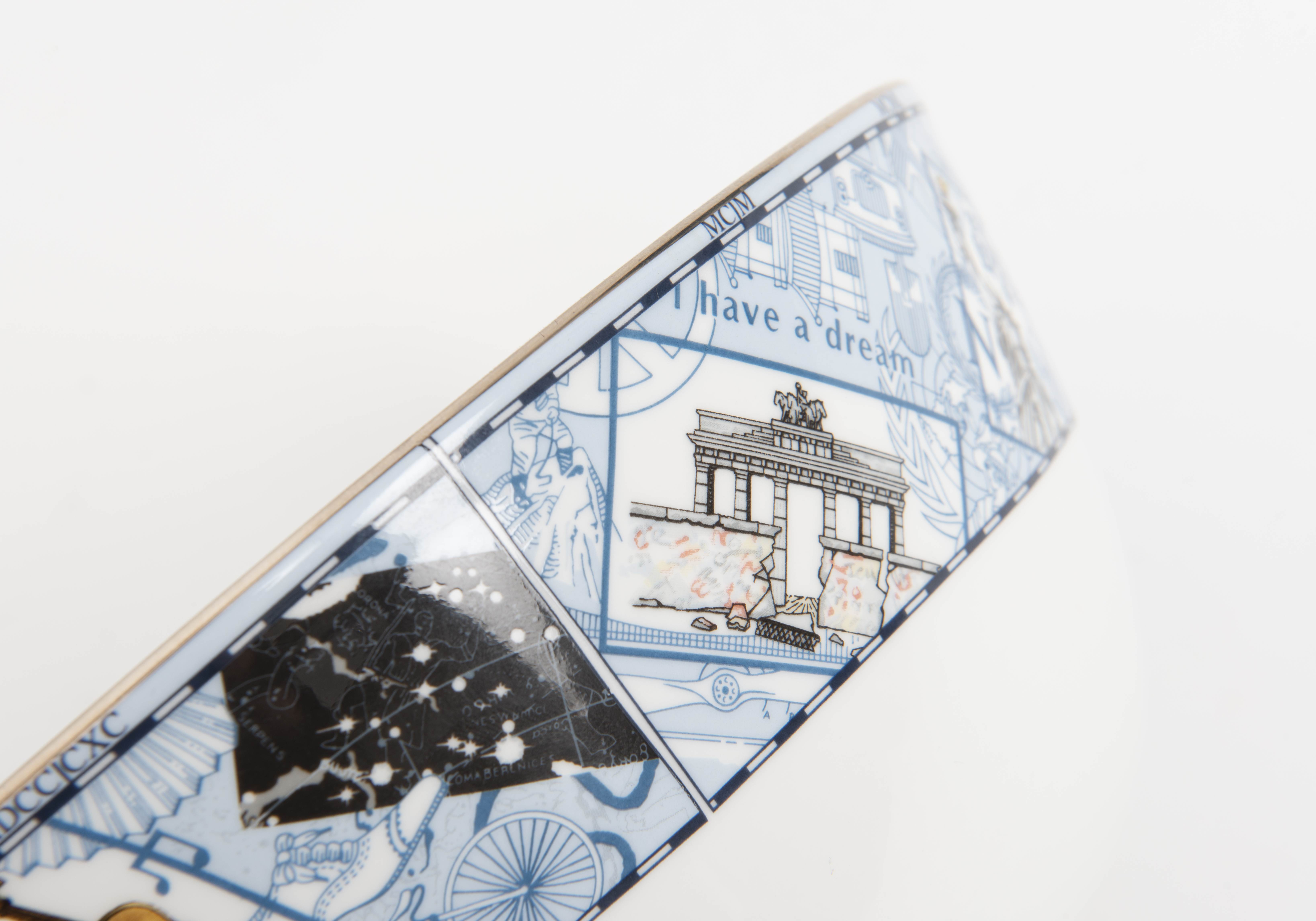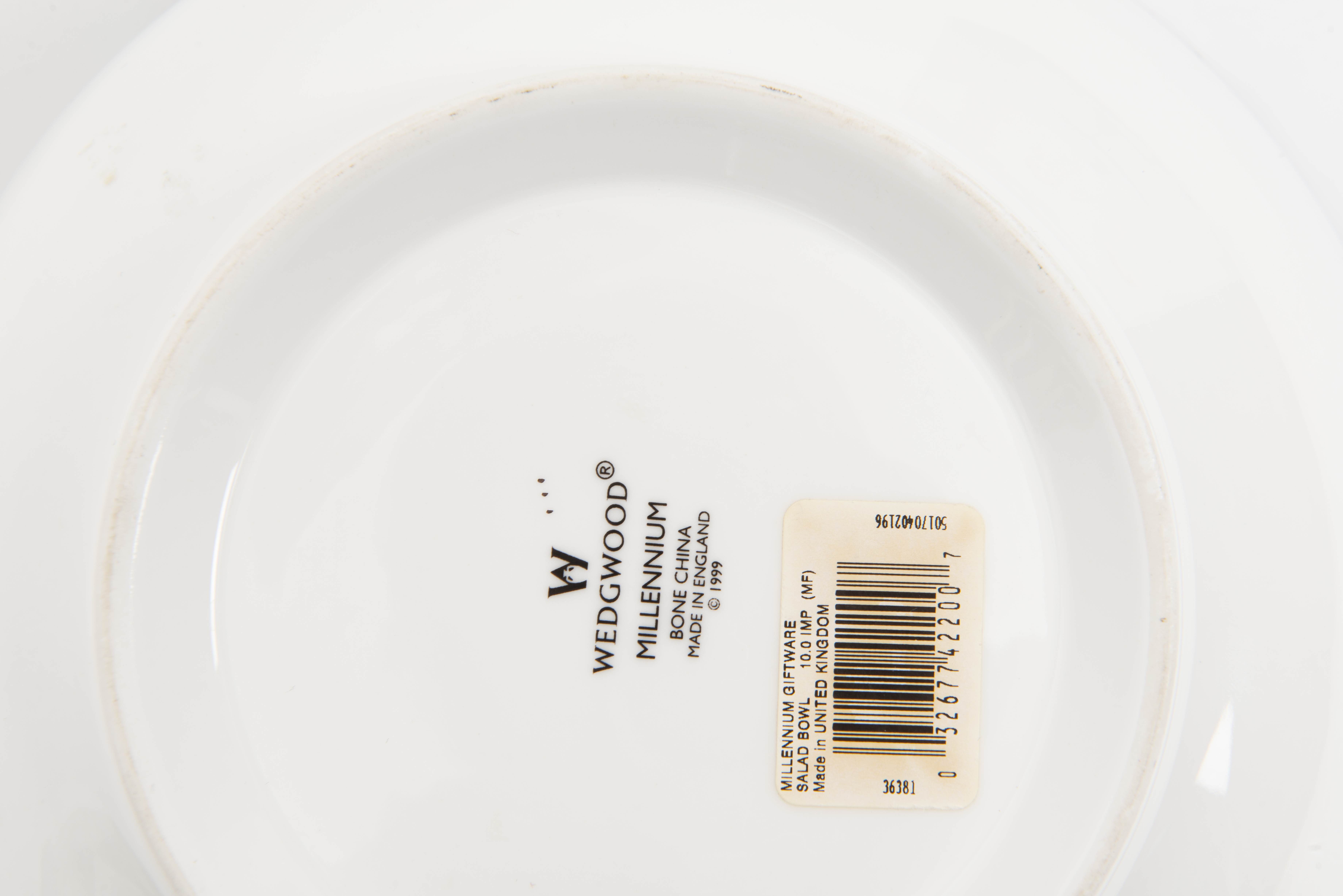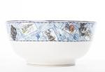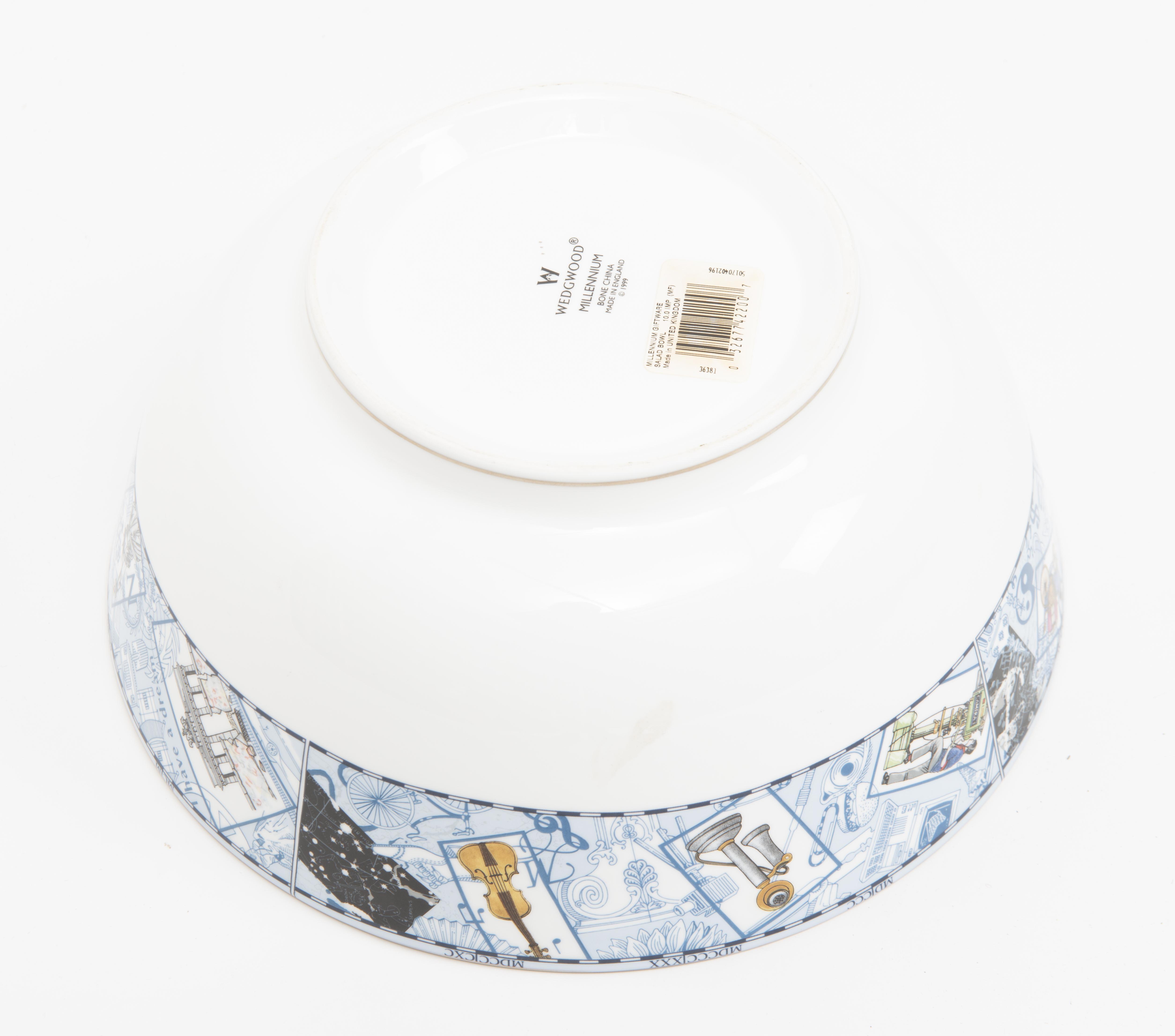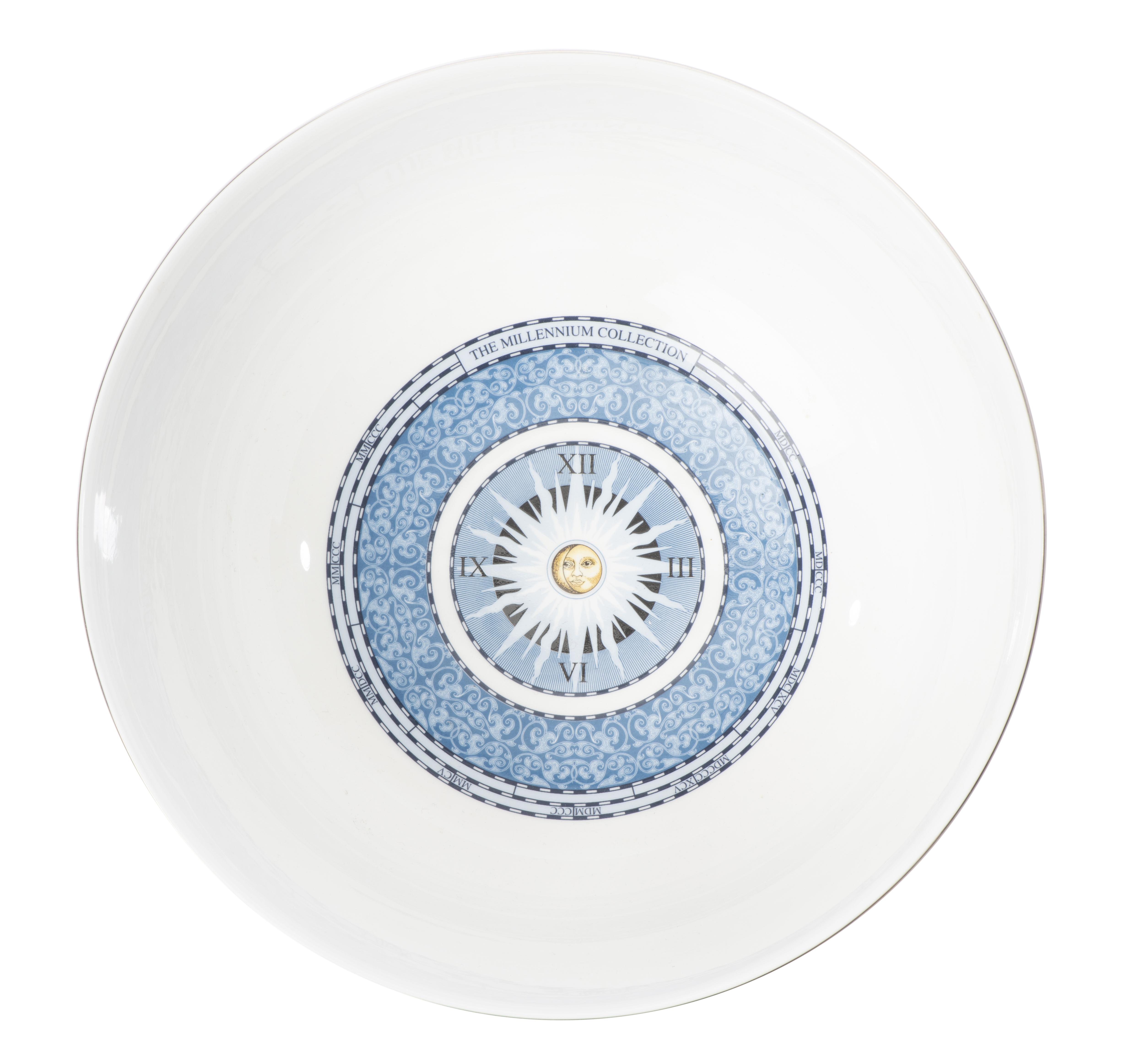un grand bol de la Millenium collection par Wedgwood au décor d'un soleil au centre, marli extérieur en médaillons de diverses activités et inventions du XXe sous forme de cartes postales.