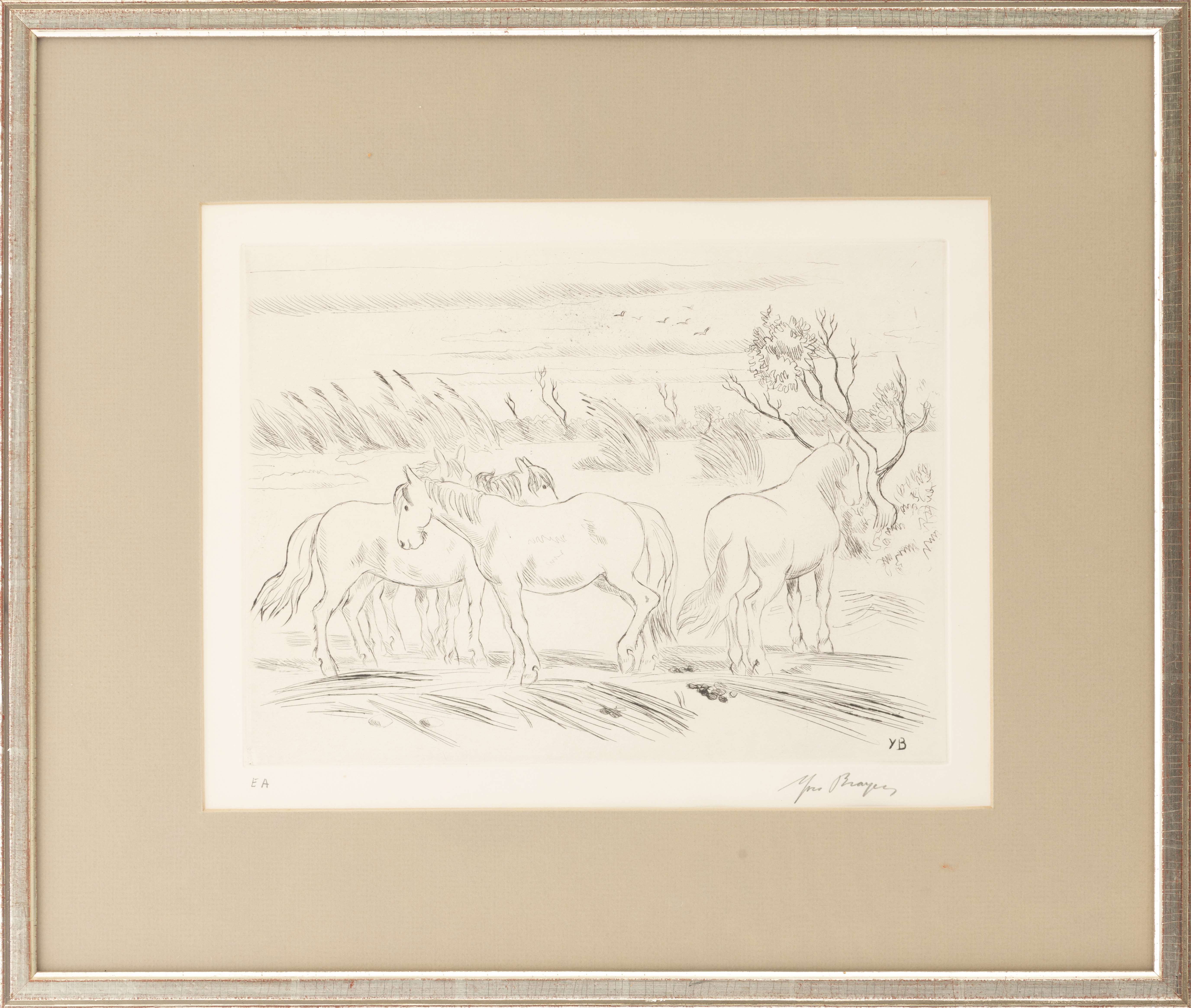 - "Chevaux en Camargue" pointe sèche mon. dans la plaque YB, num EA en bas à gauche et signé en bas à droite au crayon.
