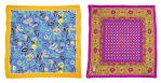 - l'un en mousseline de soie, motifs abstraits colorés sur fond bleu et jaune.