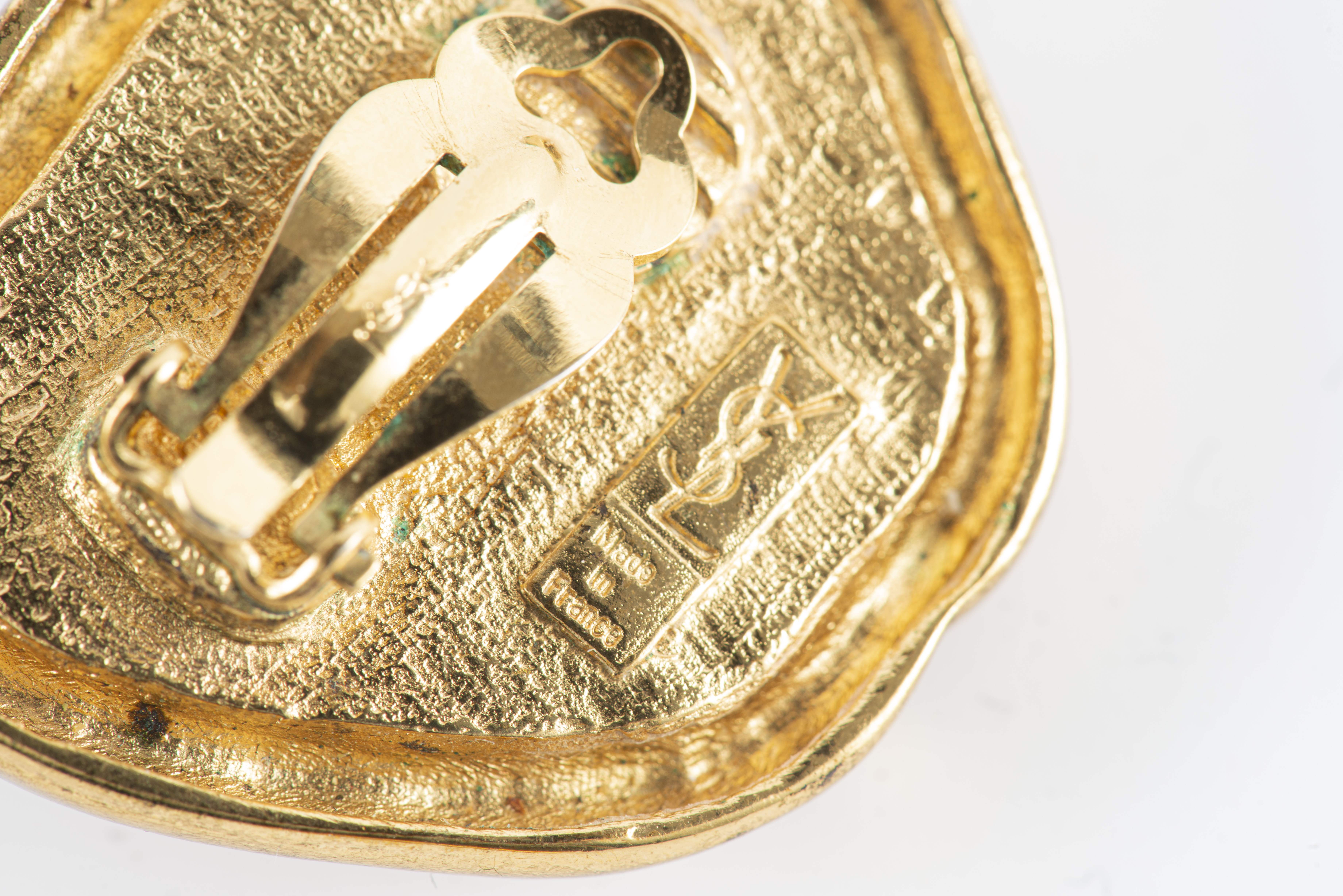 Yves SAINT LAURENT, paire de boucles d'oreille clip en métal doré, cabochons en résine grenat