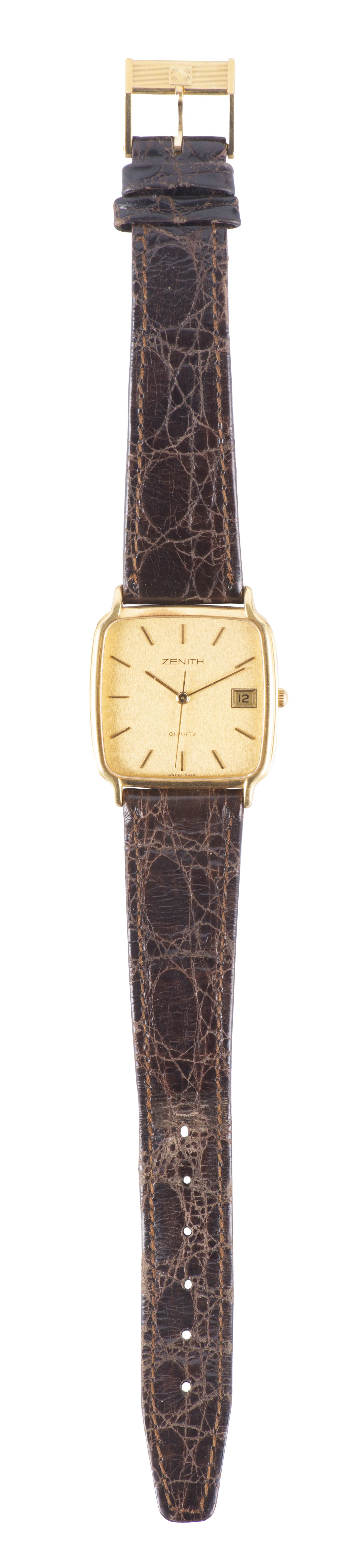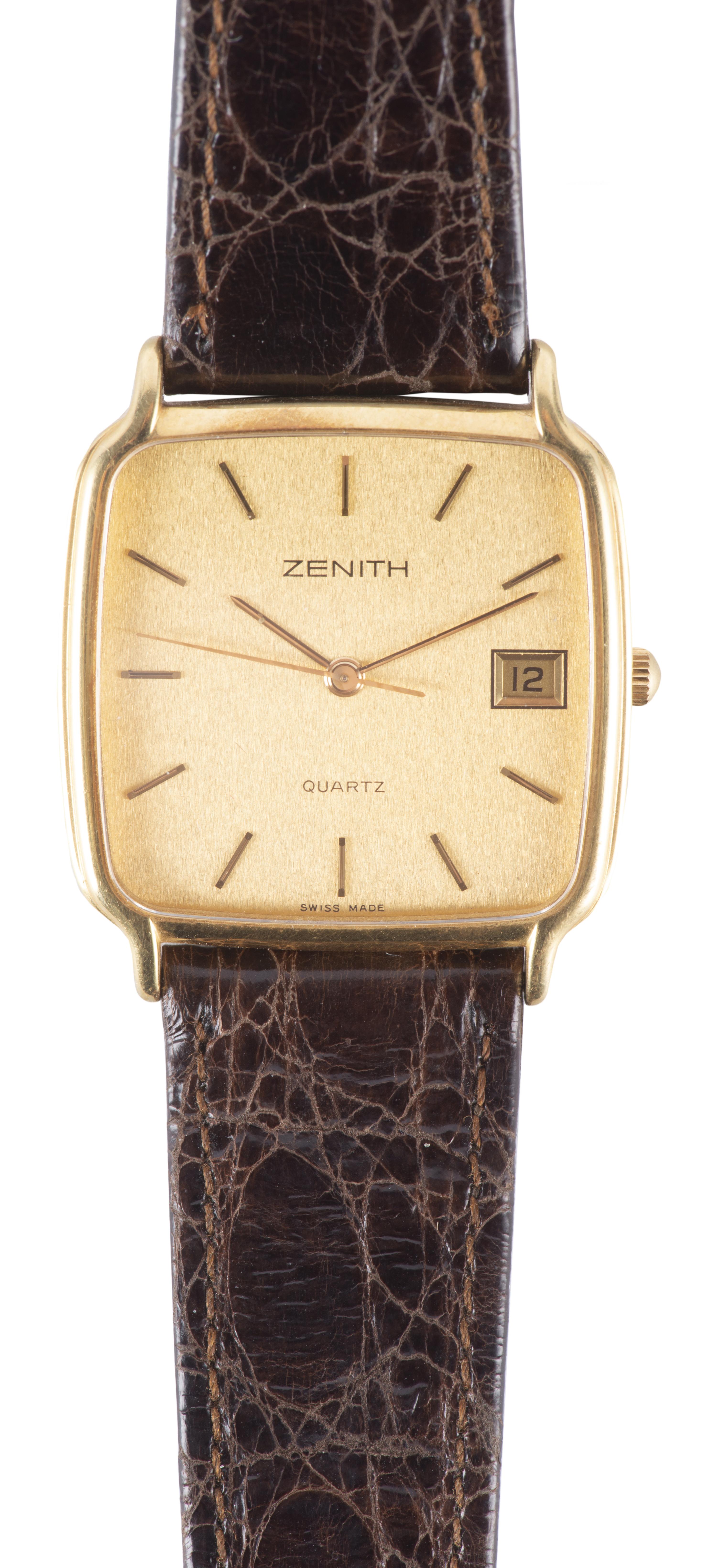 Montre-bracelet Zénith carrée à mouvement à quartz, boîte en or .750, cadran or, index bâtons or, guichet de date à 3h num 30 0630616.