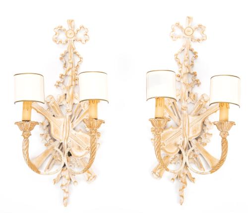 Deux porte-cierges et deux sellettes en bois doré