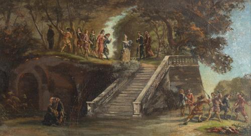 Théodore de SAUSSURE (1824-1903) "Scène de genre dans un parc", Huile sur bois