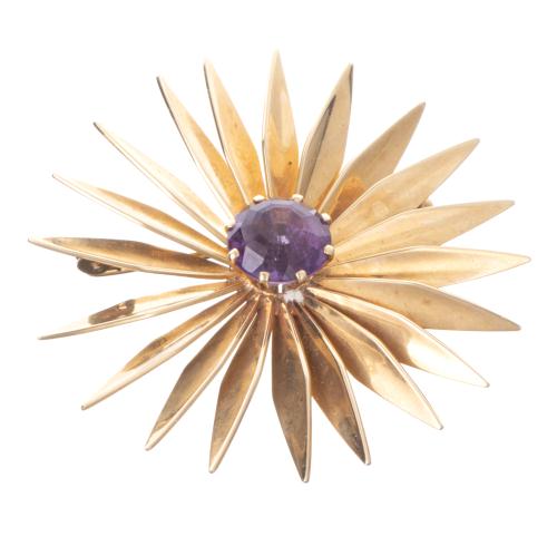 Guld virke, Travail Danois, Broche Soleil en or jaune avec une améthyste